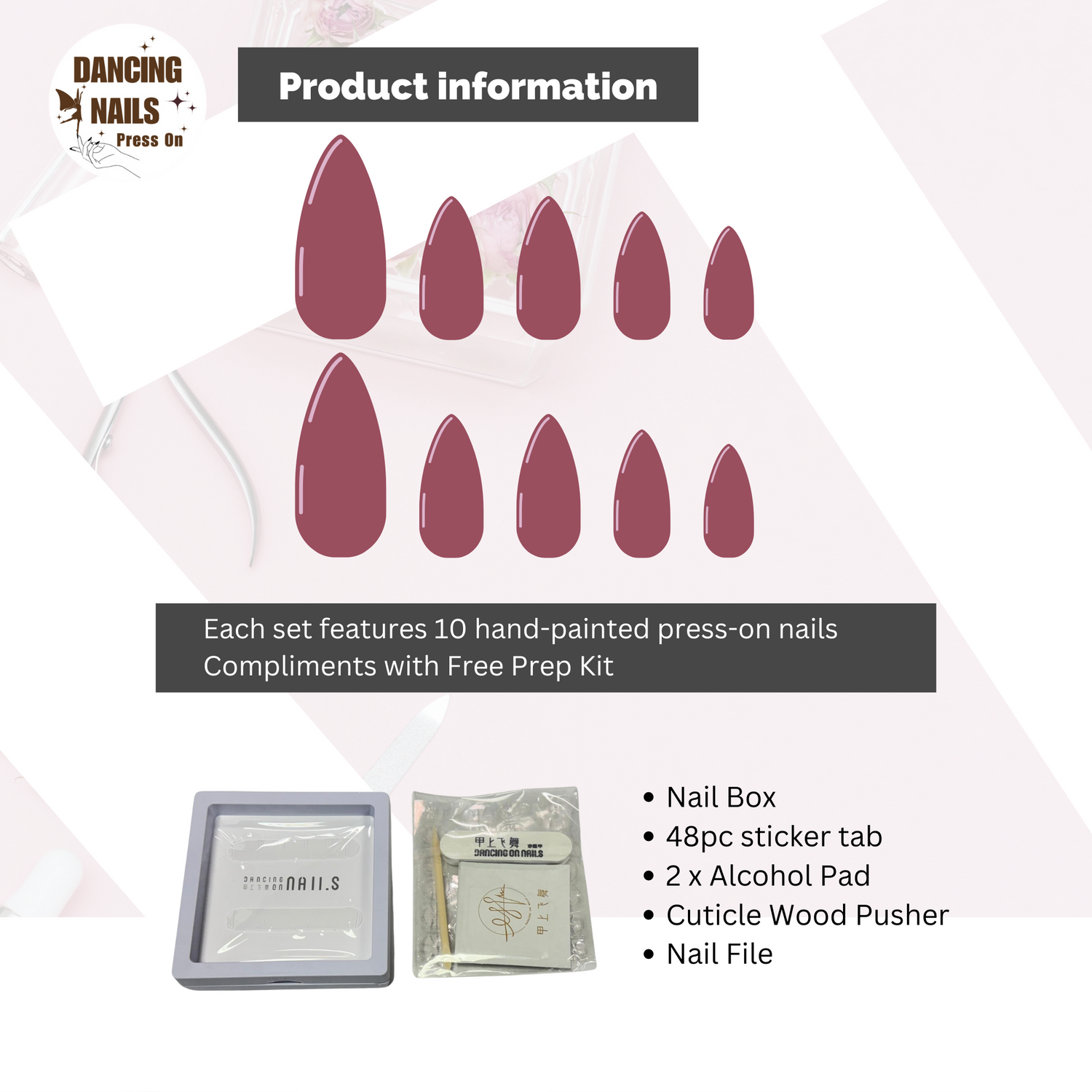 All our Press on nails set is come with One set of application kit. Each set features 10 hand-painted press on nails.