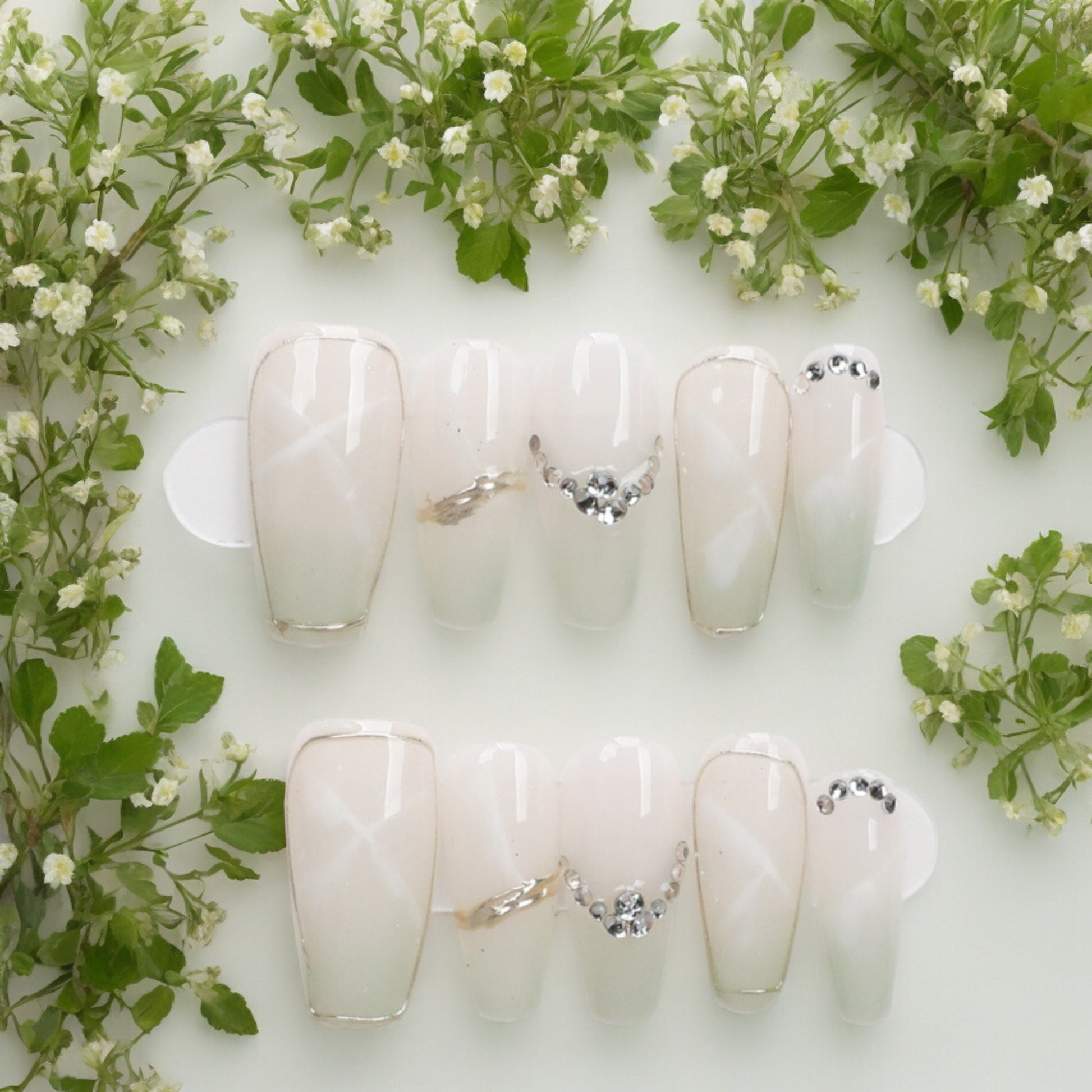 Medium coffin shape nails, painted in a stunning Opal white with slight marbelisation. Switch it up with delicate gems and you have a pretty, classy but glamourous look.