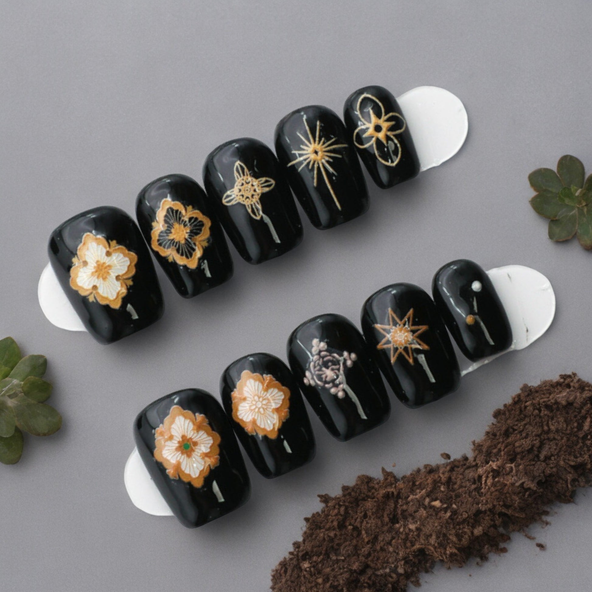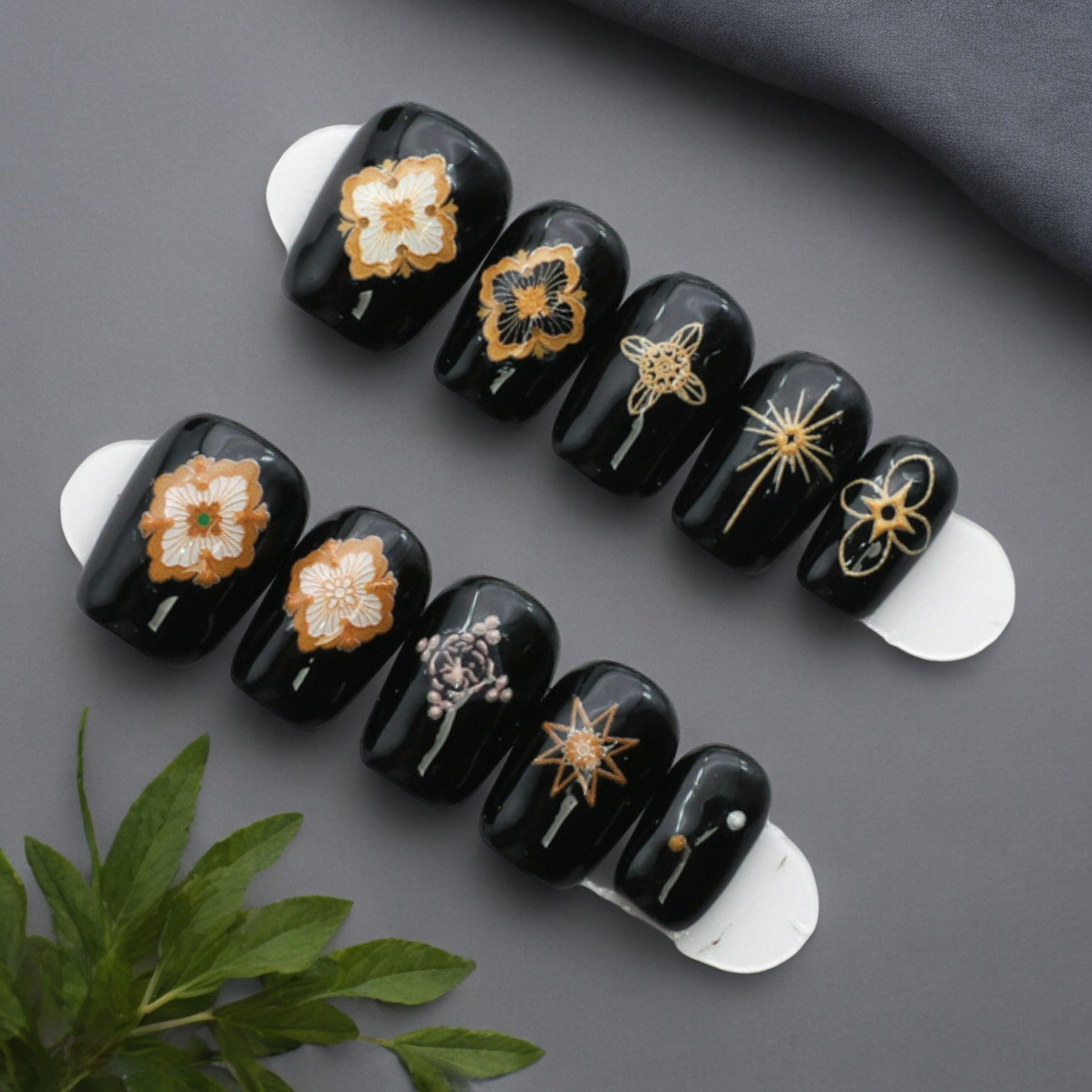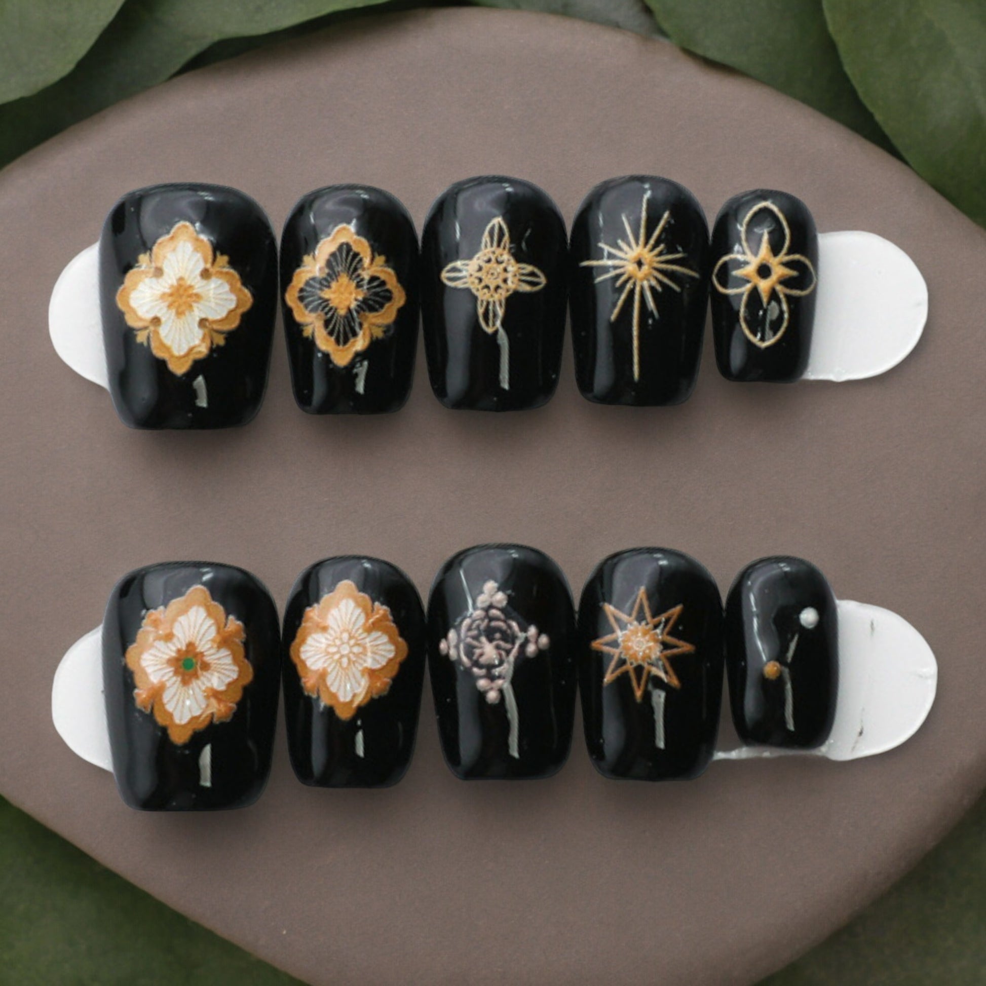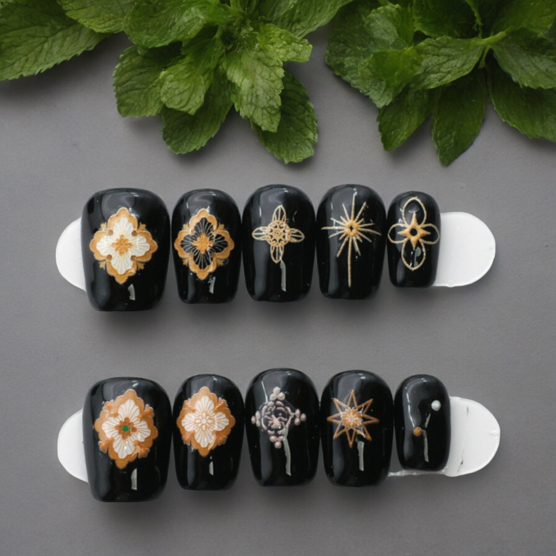 This short squared set is a great addition to any outfit to give that 'wow' factor. Hand painted in Jet Velvet Black, with gold and cream accents on each nail for a dramatic look.