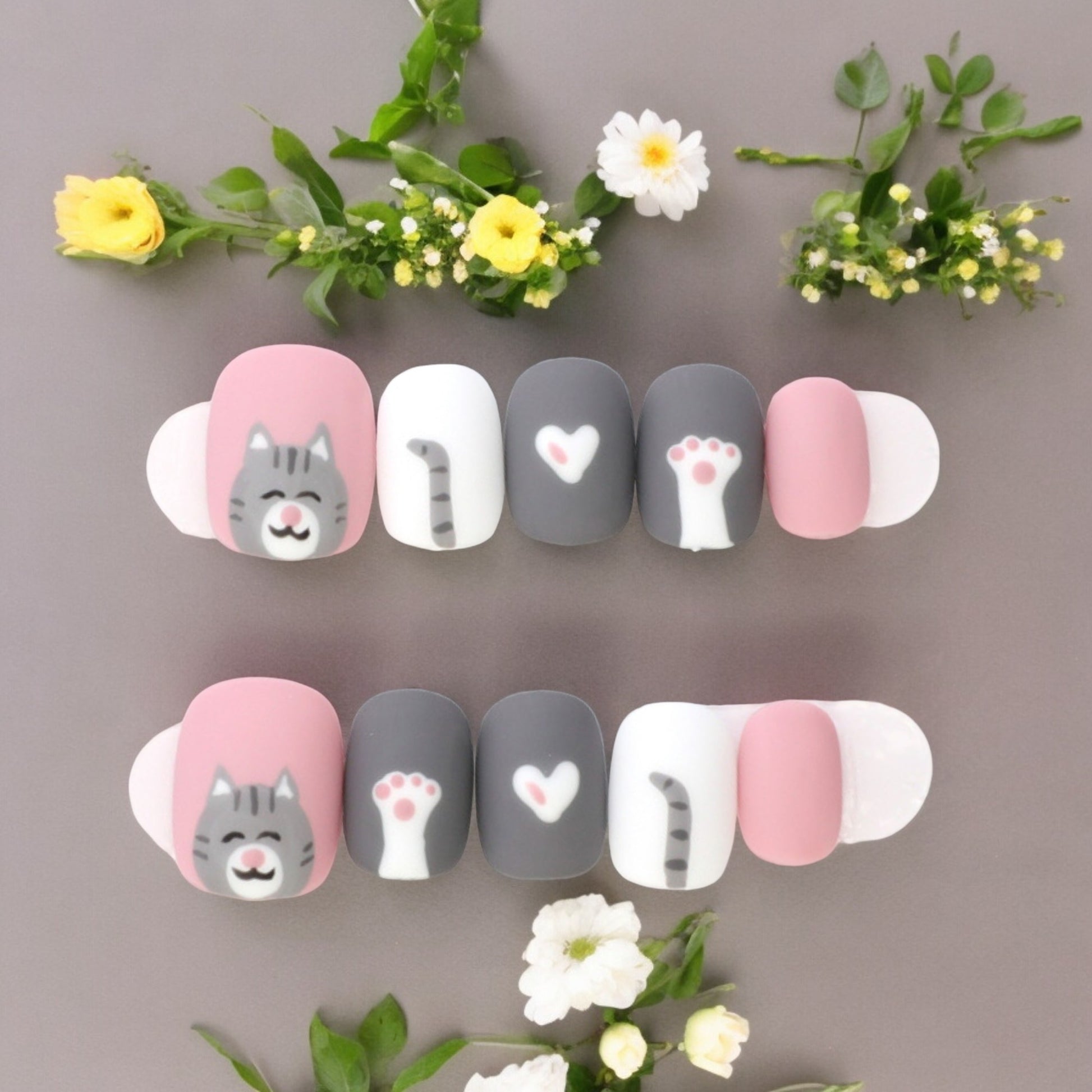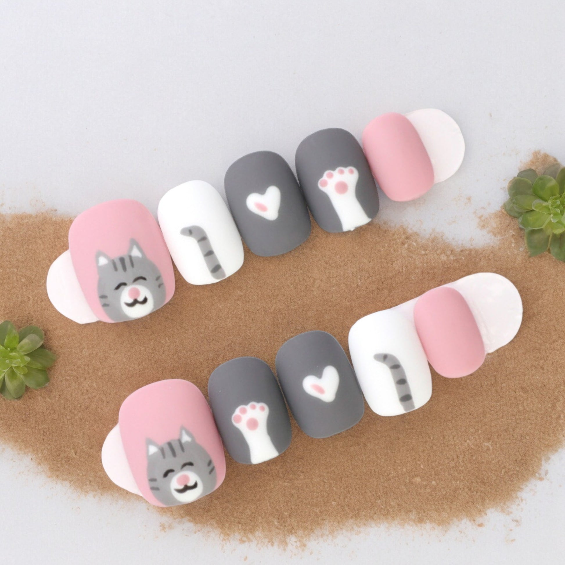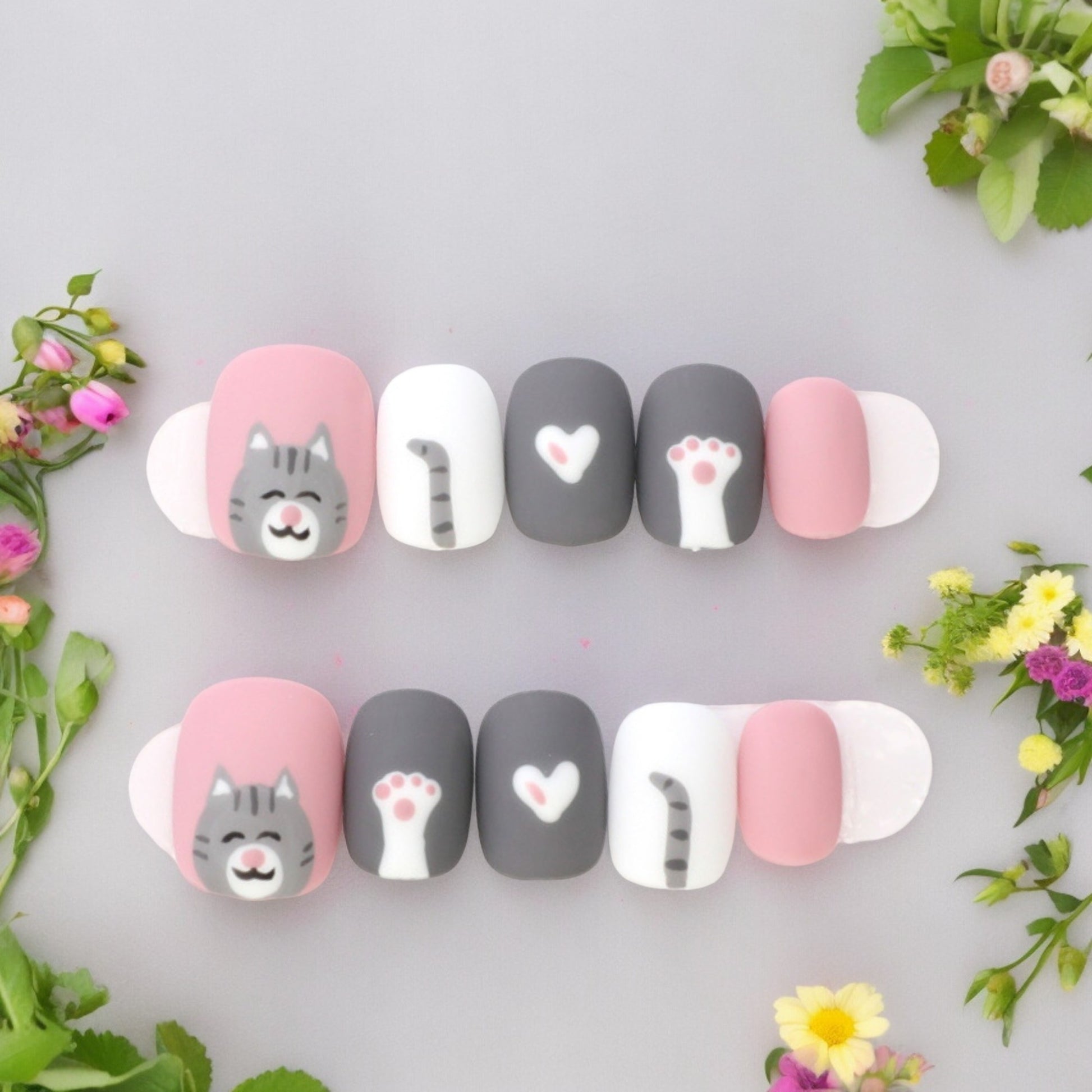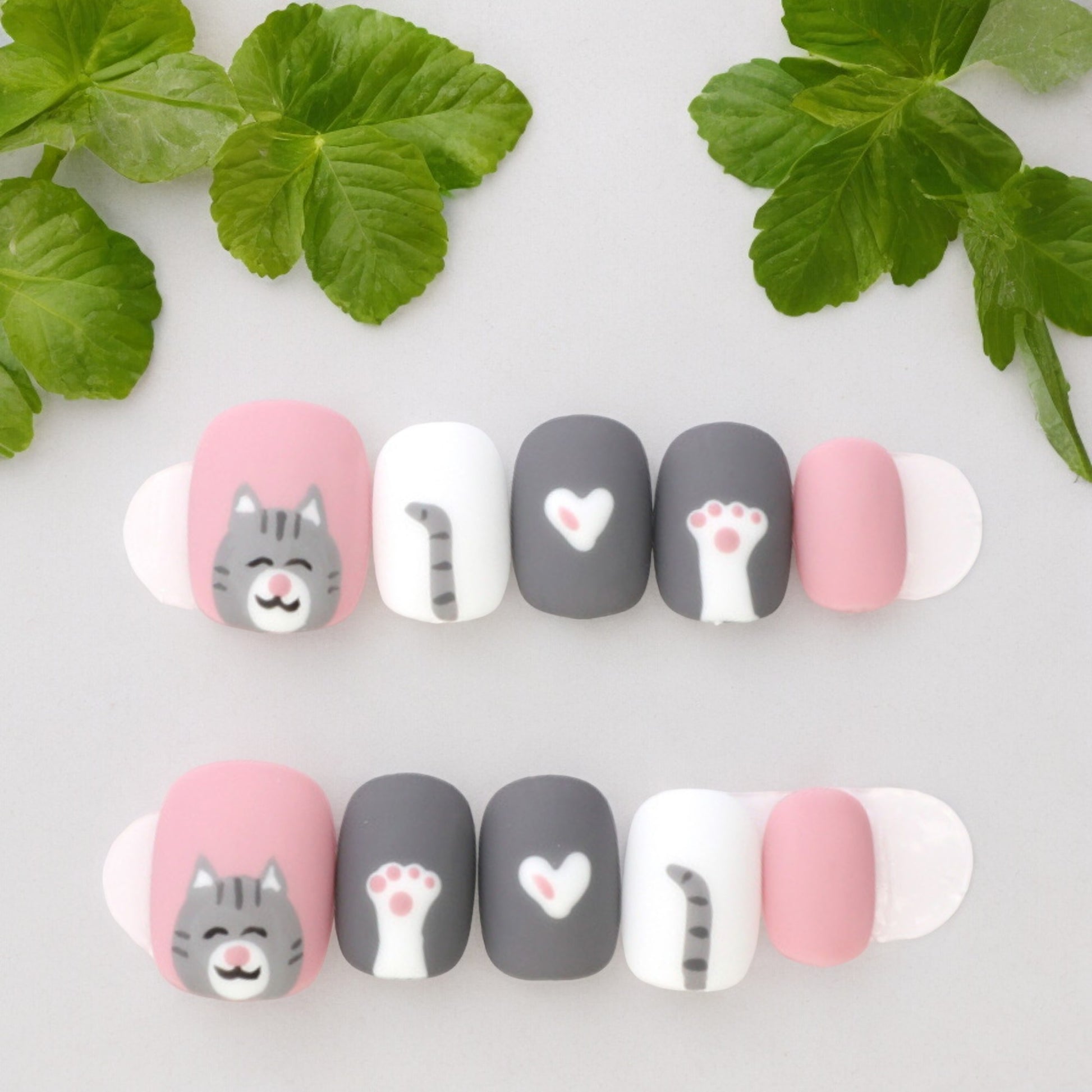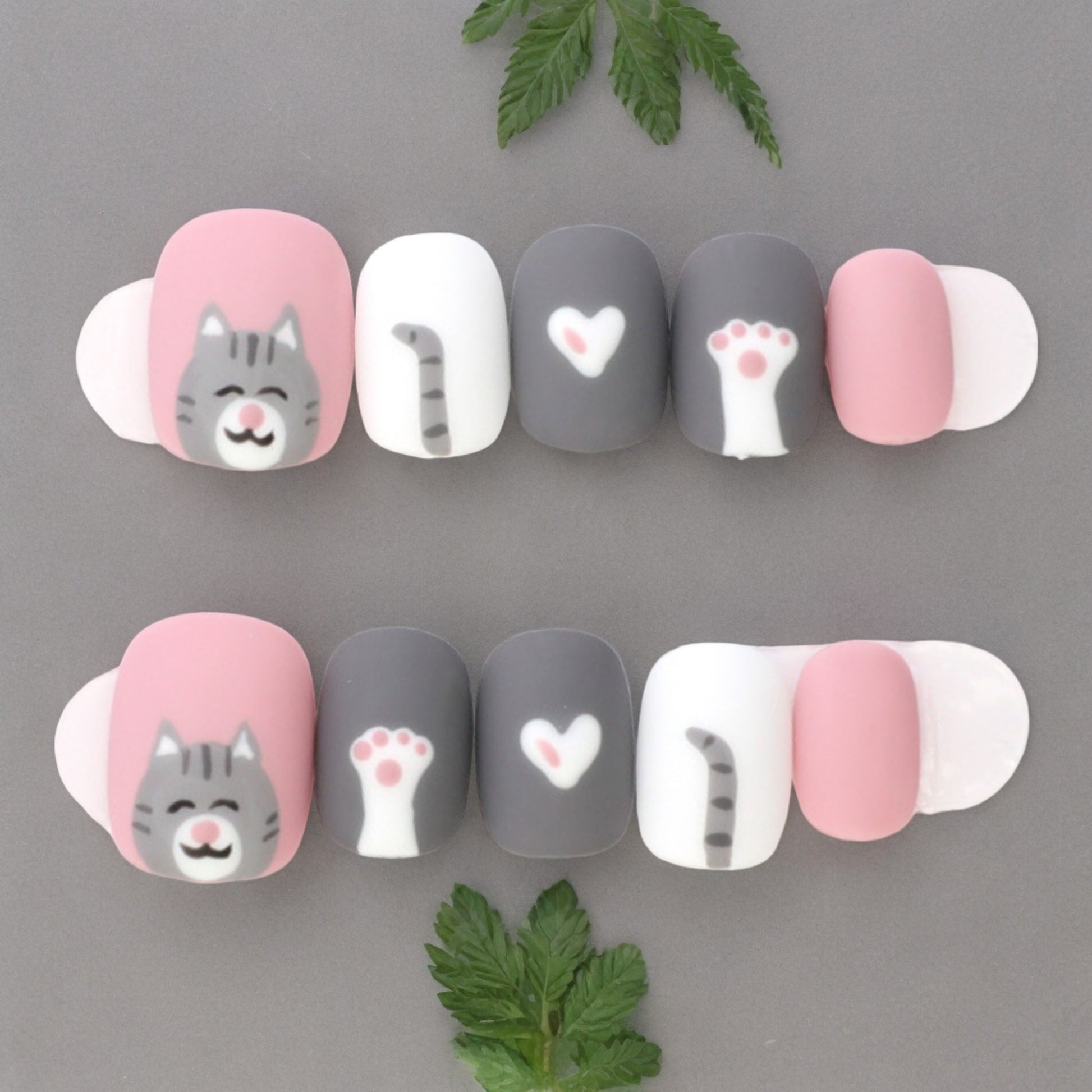 Beautifully hand painted in a matte finish, these are fun nails. In a gorgeous sugar pink and grey, great for any day wear.