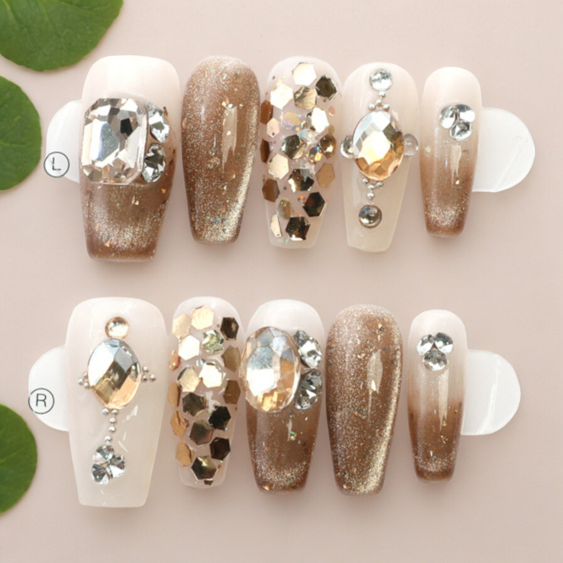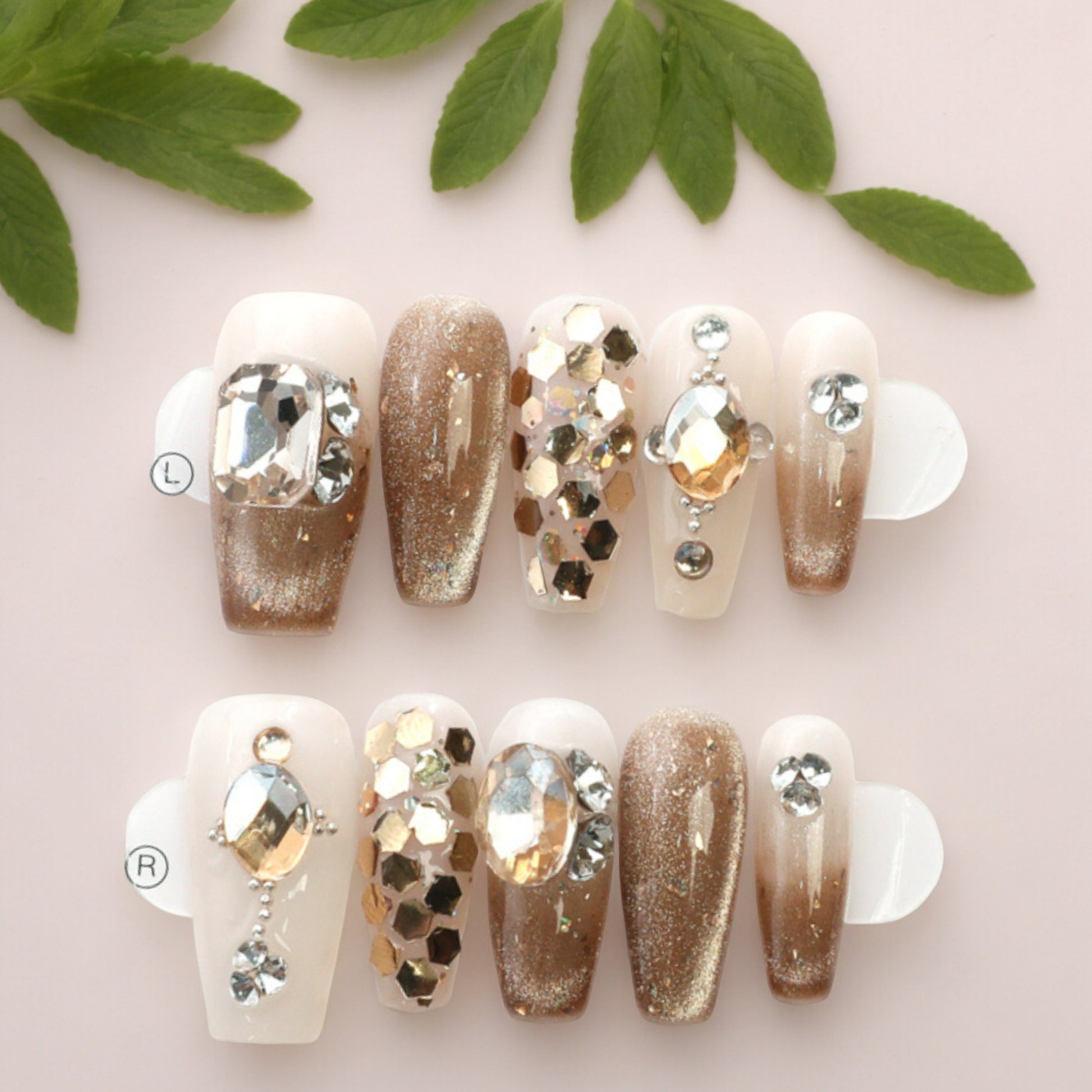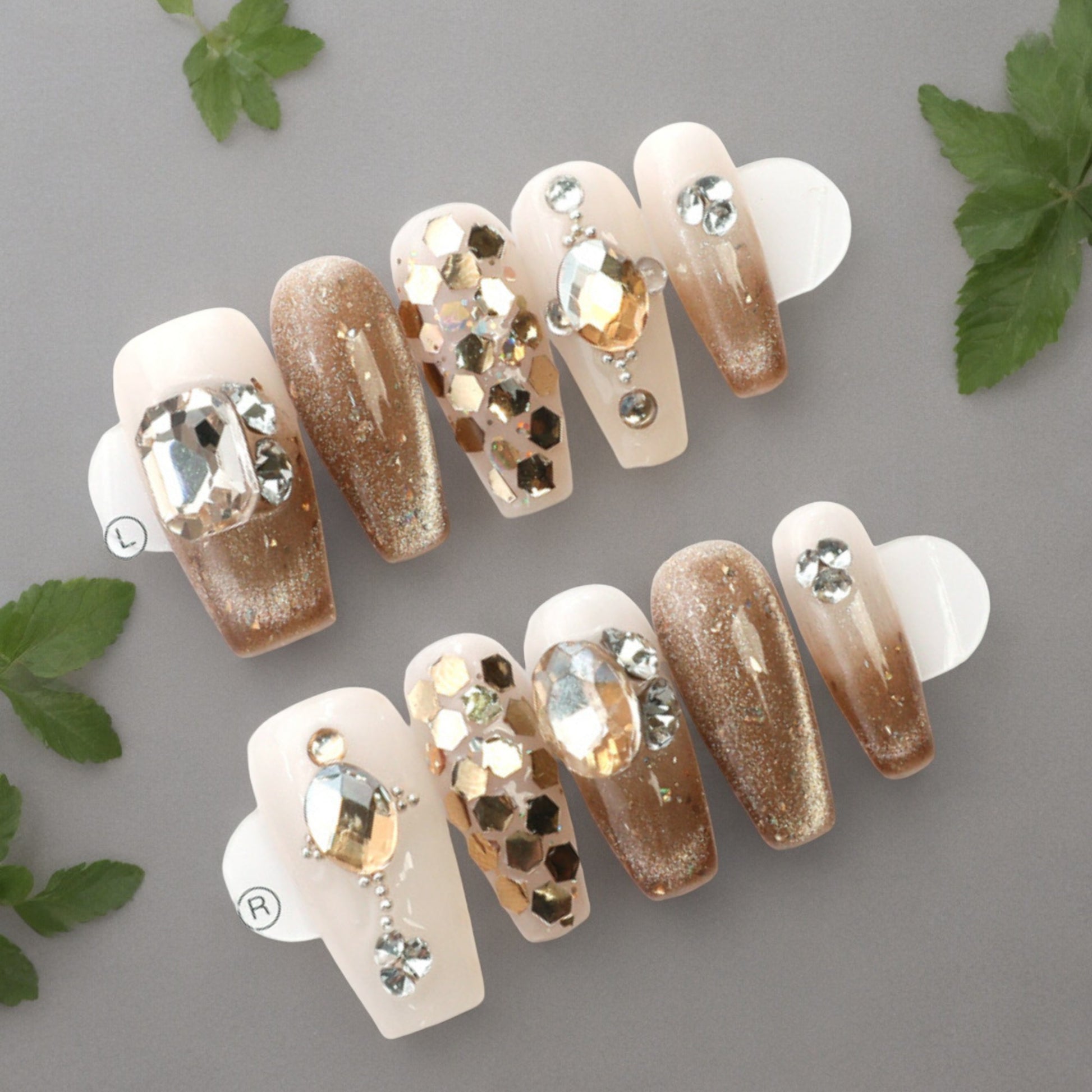Long coffin style nails tips, and perfectly hand painted in glitter sand and gold. Hand finished with coordinating gems, Just stunning.