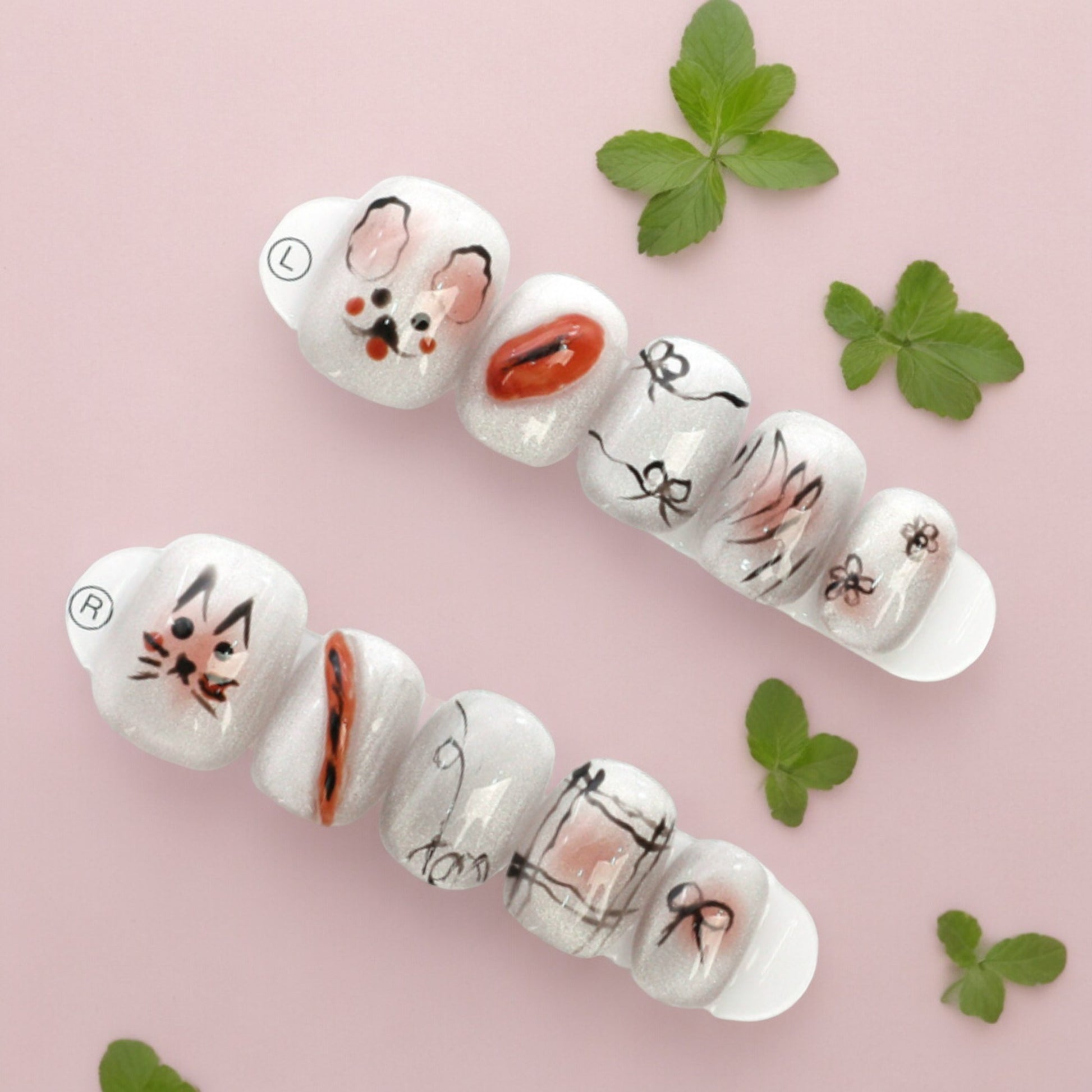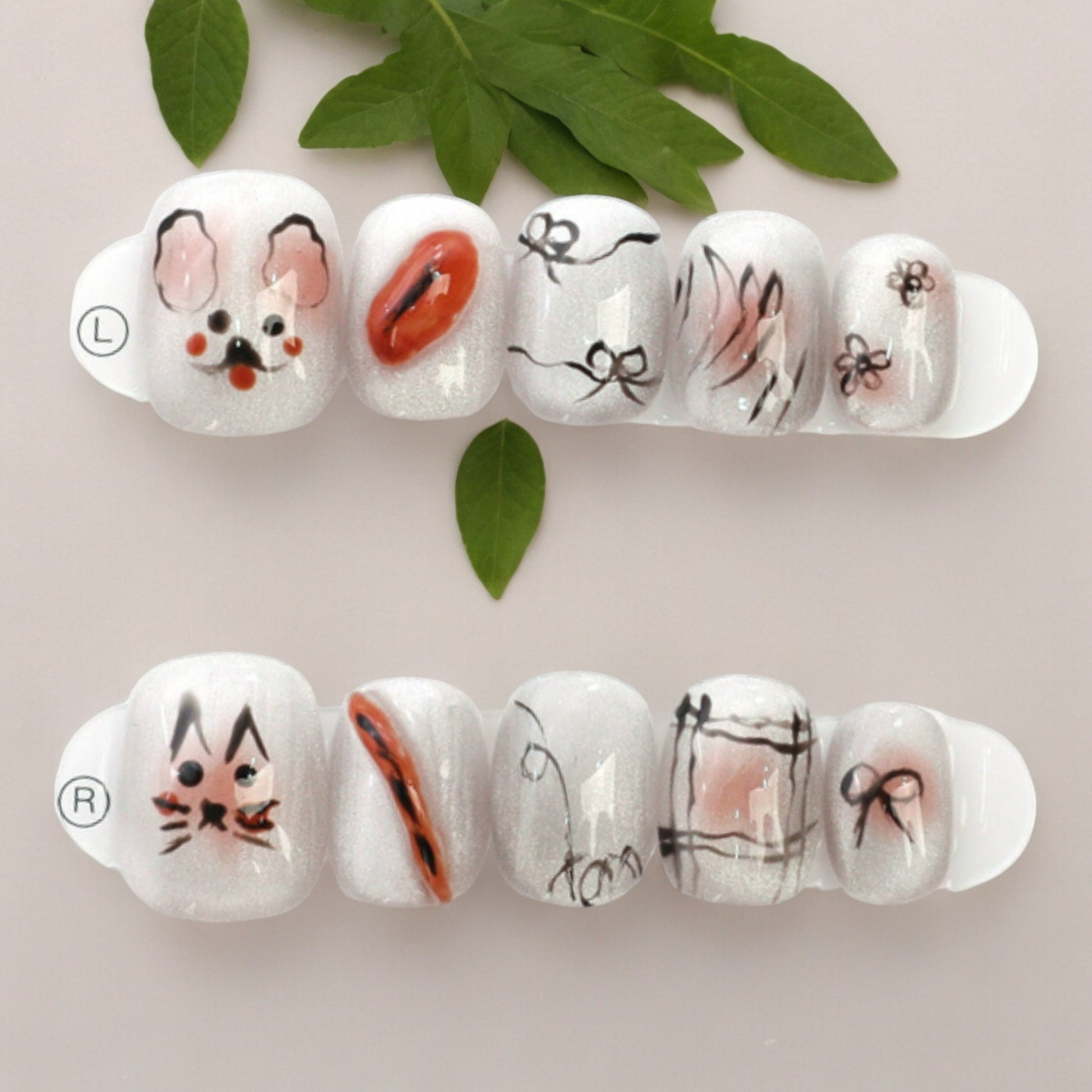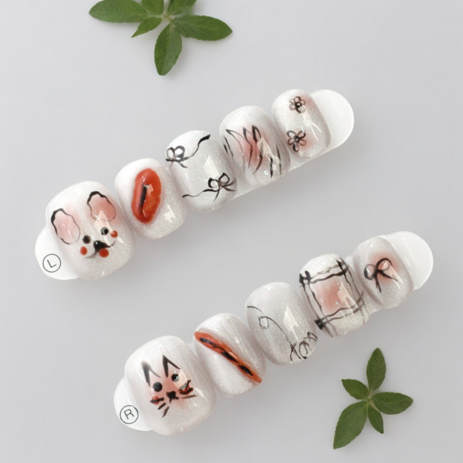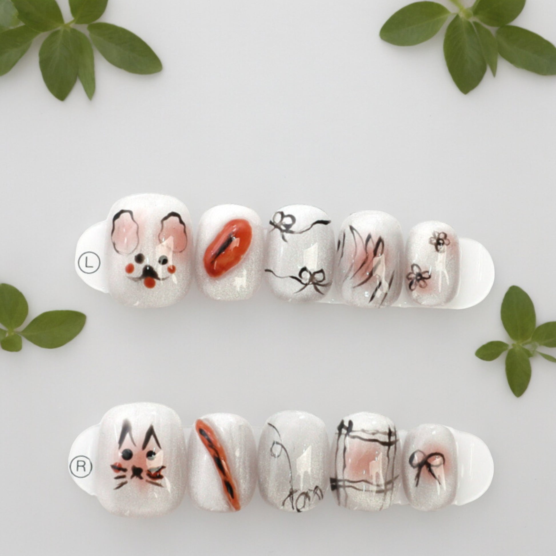 This is a fun short square set, hand painted in white sparkle with cute kitty and bunny faces. For the not so serious days, these will put a smile to anyones face.