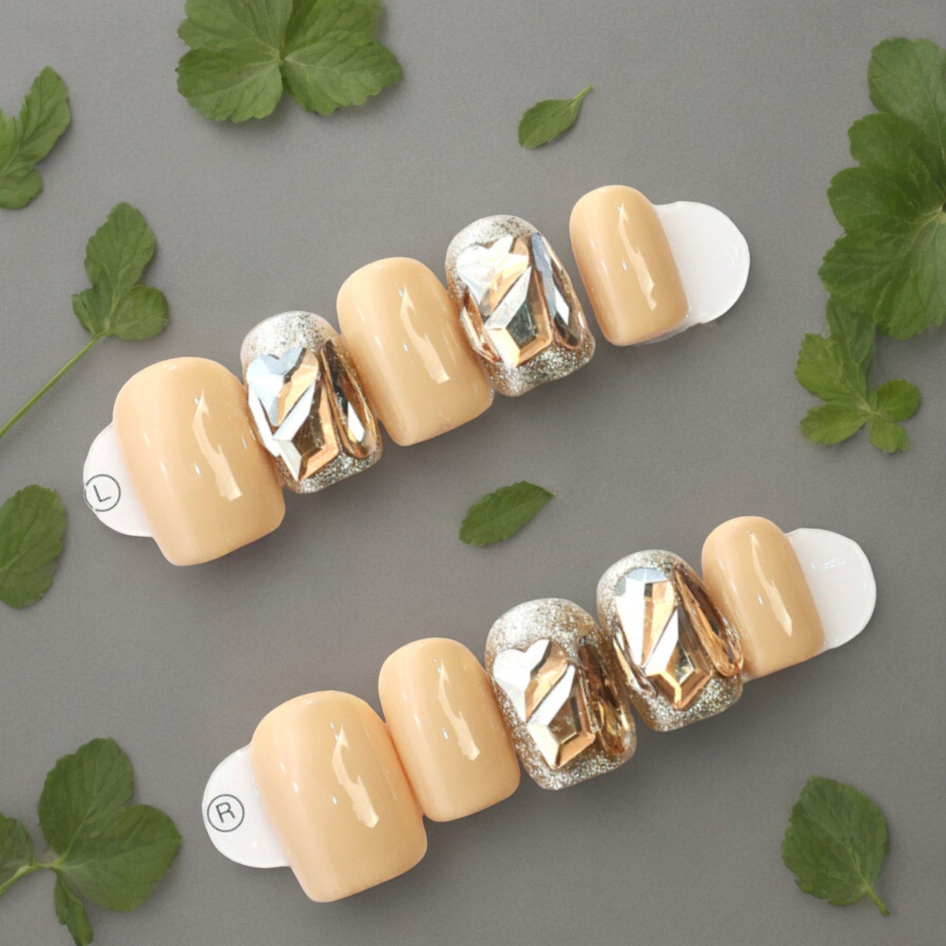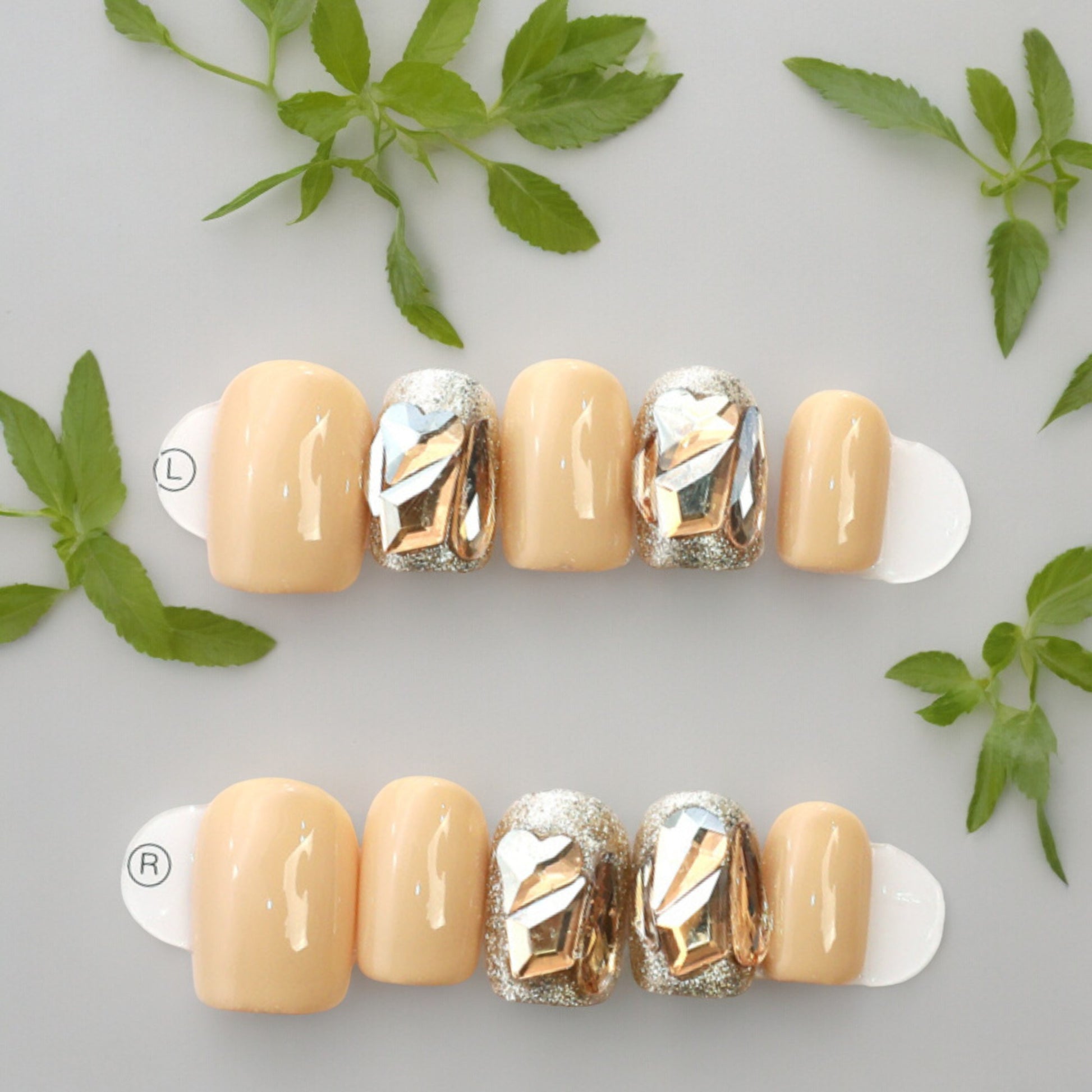 Short square nails, in a mouth watering peach colour. With gold sparkle and delightful peach gems, these are the perfect summer accessory.