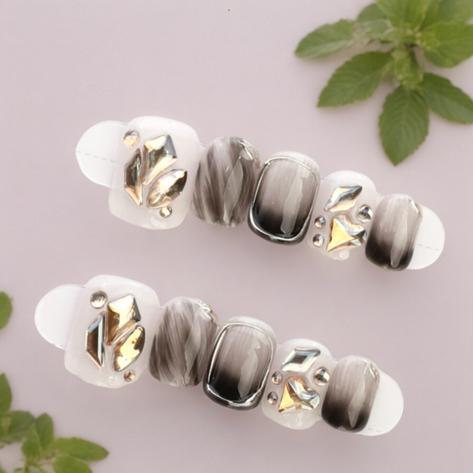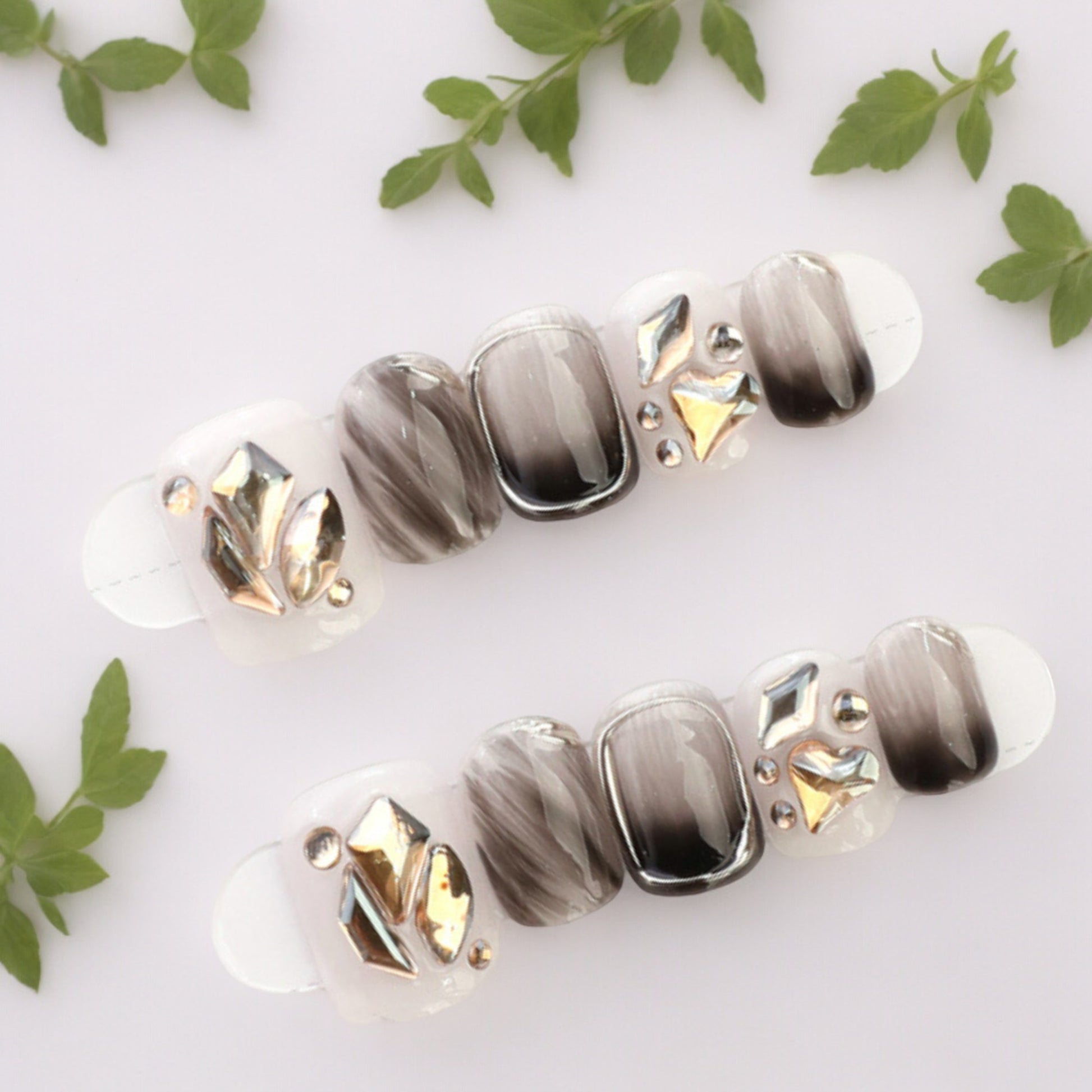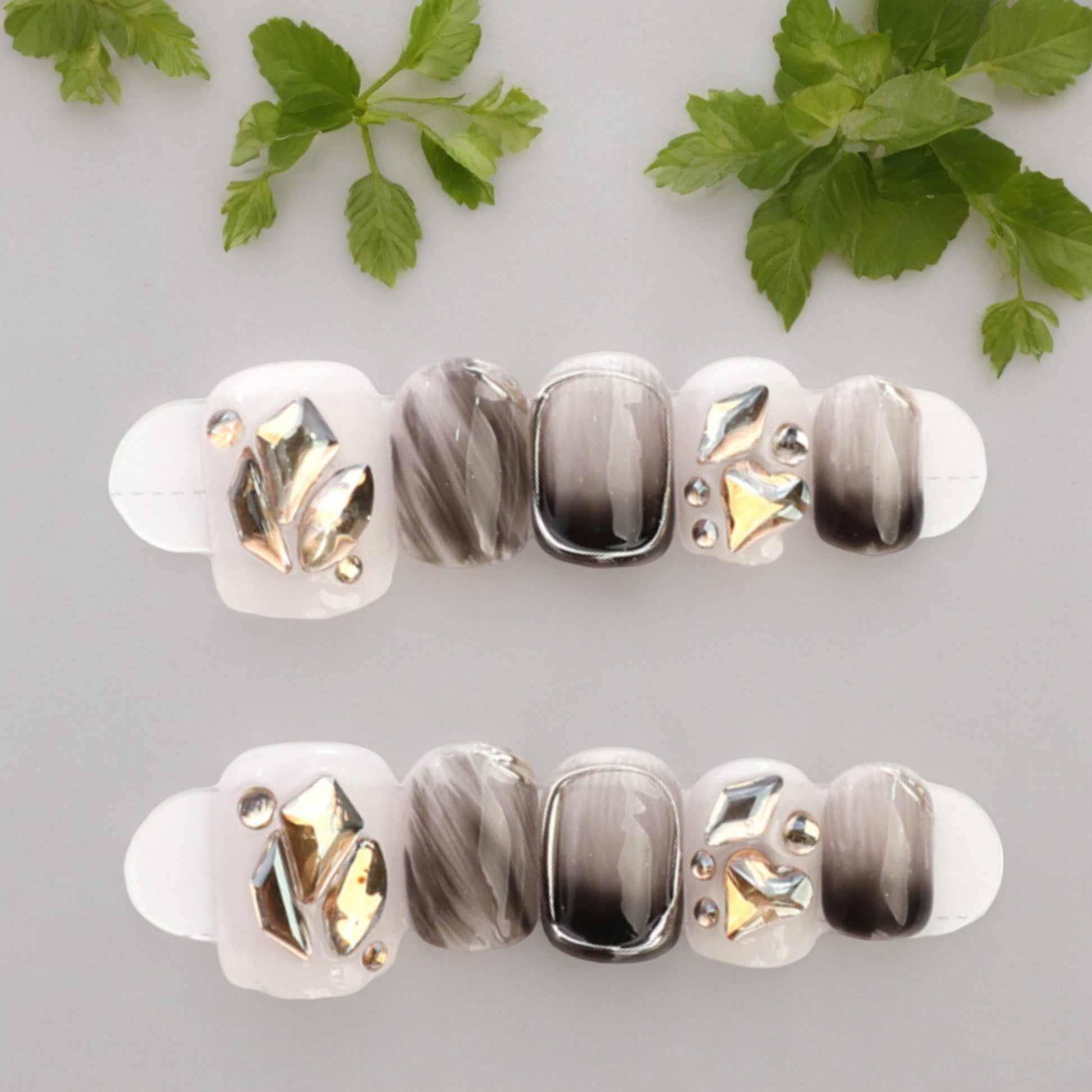 Short square nails, hand painted in a smoky taupe hue. Elevated by hints of gold and cream, topped off with gold stones. A glam addition to any nail collection.
