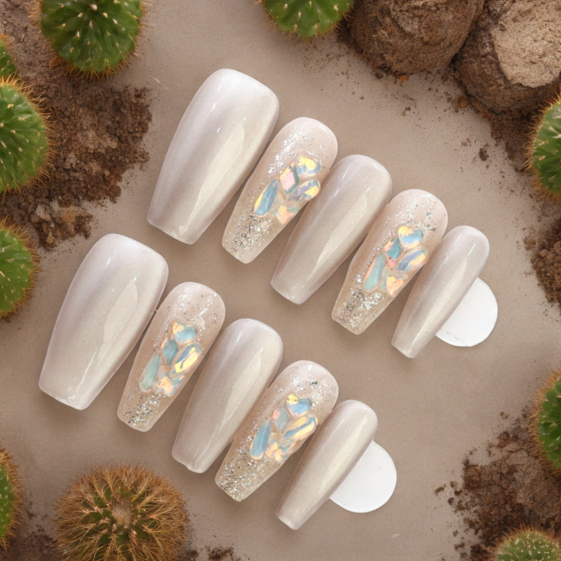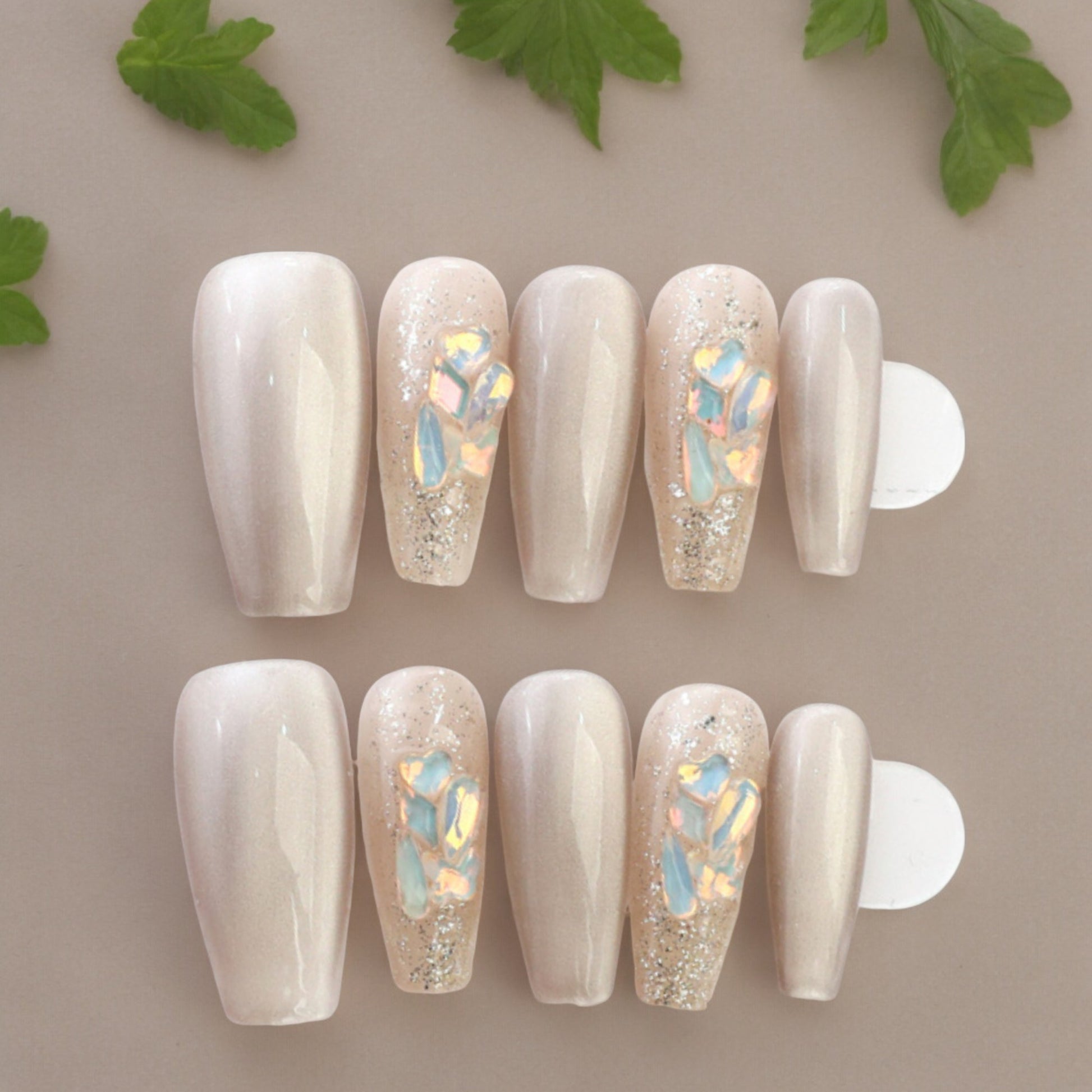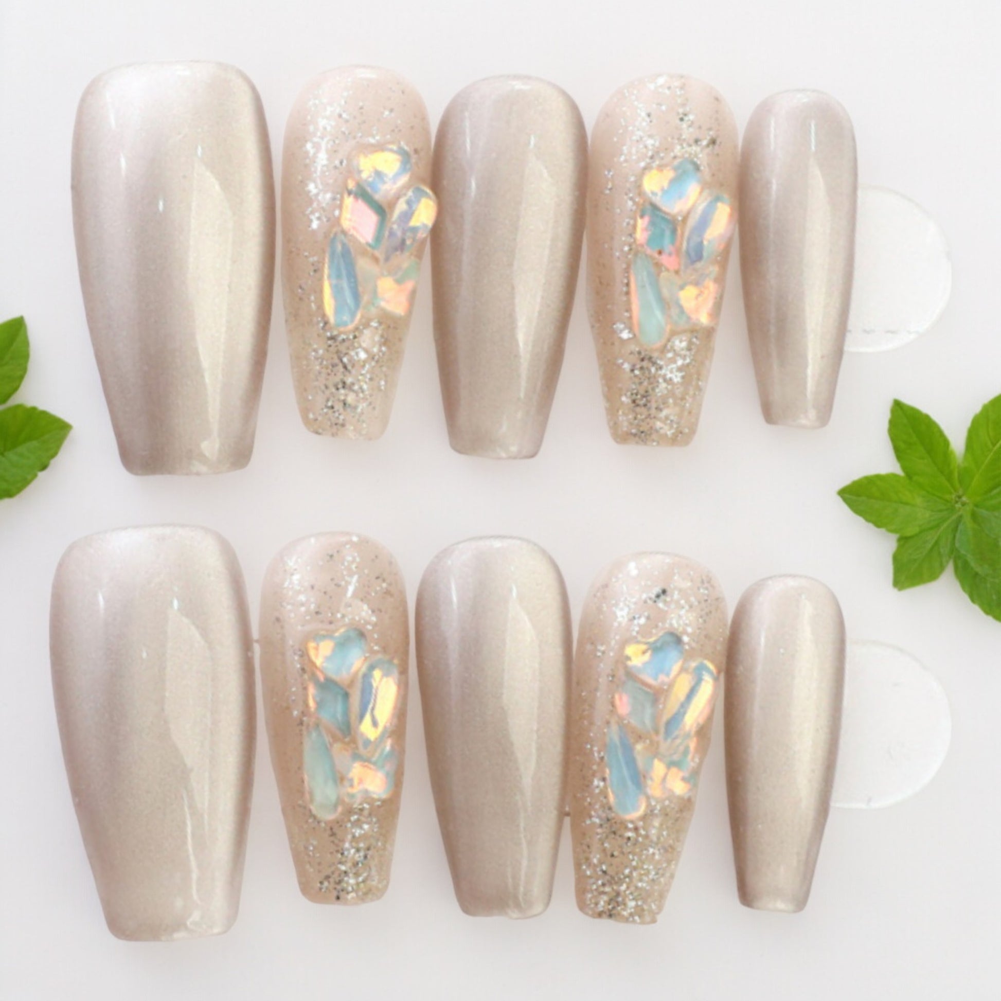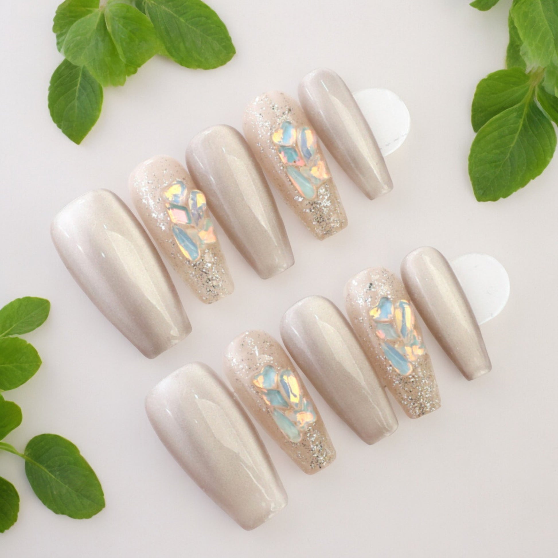 Long coffin shape nails, in a stunning light reflecting cat eye finish in an iced latte colour. Holographic gems and a glitter finish make these an eye catching set.