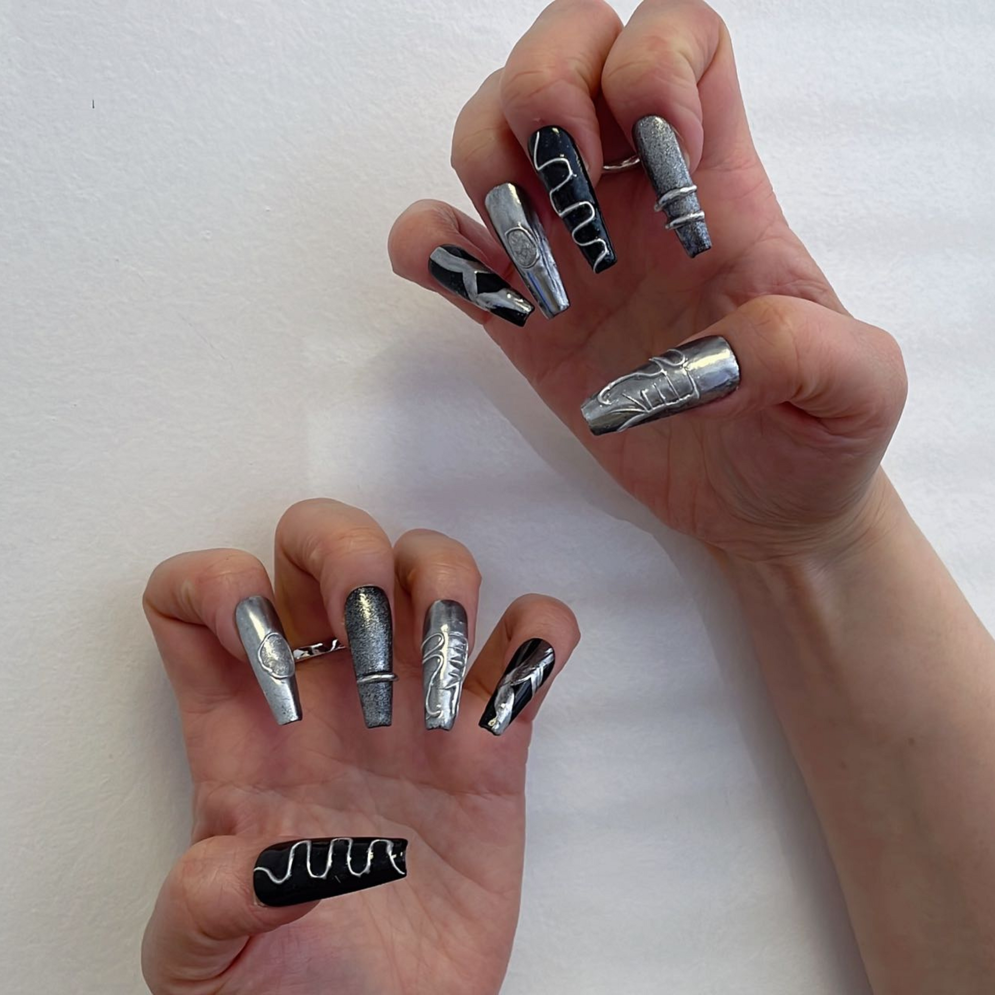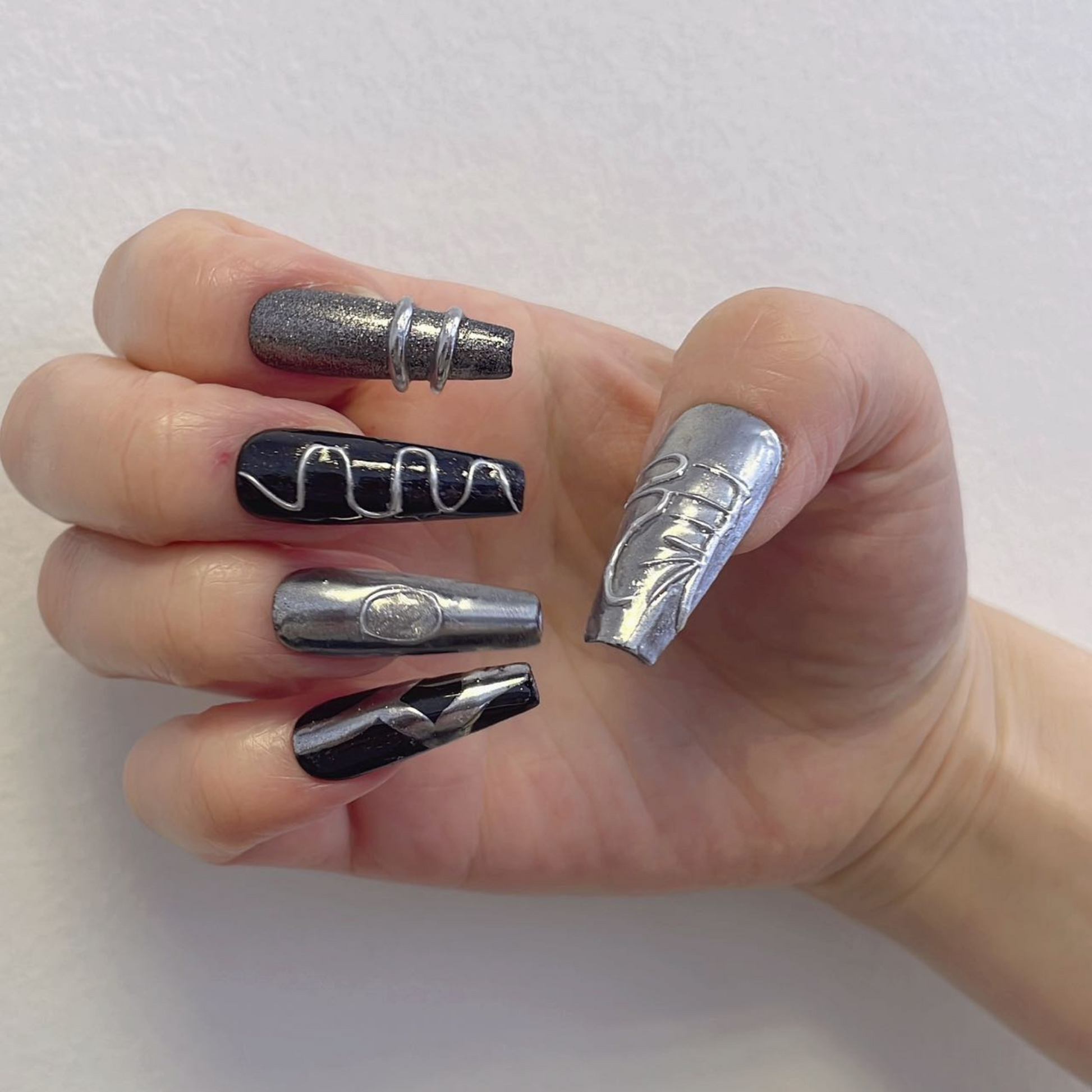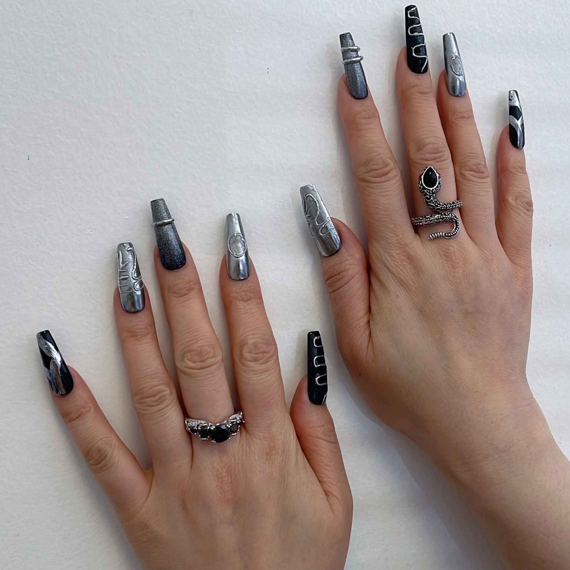 Get ready to slay with our Black and Silver Glitter Pattern Long Coffin Press on Acrylic Nails. With a bold and sparkly design, these press on nails will elevate any look for a night out or special occasion. Just press and go for stunning nails in seconds. Time to shine, babe.
