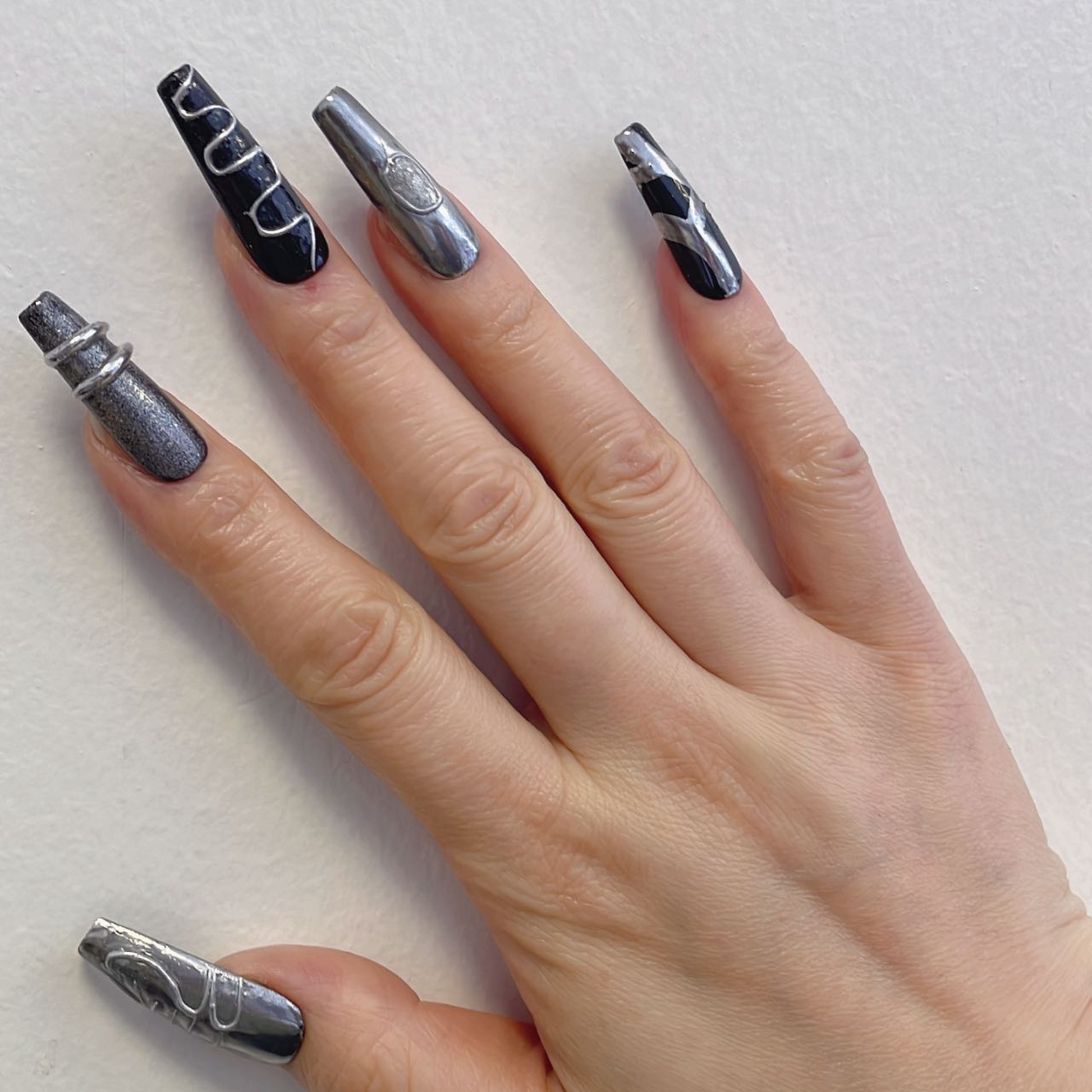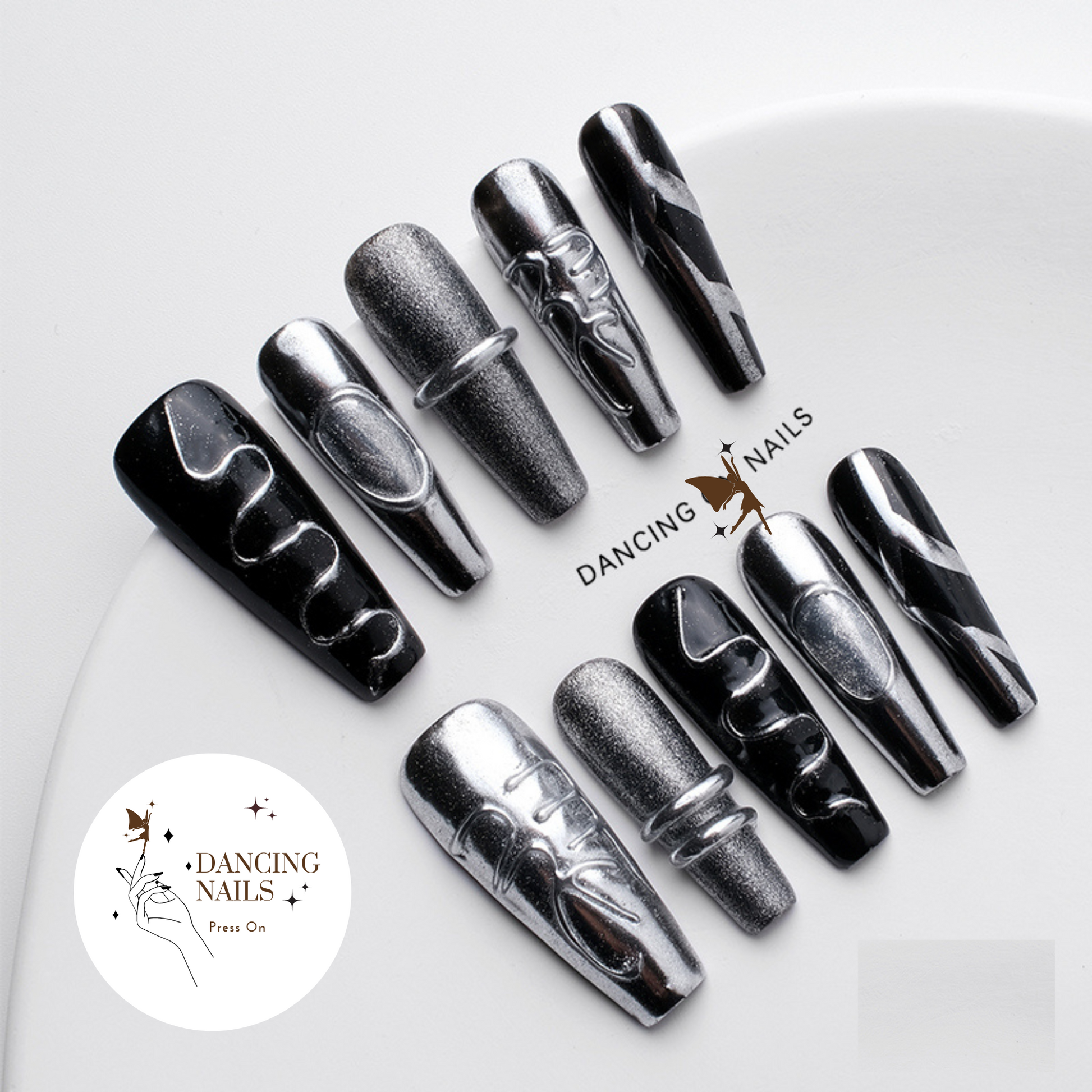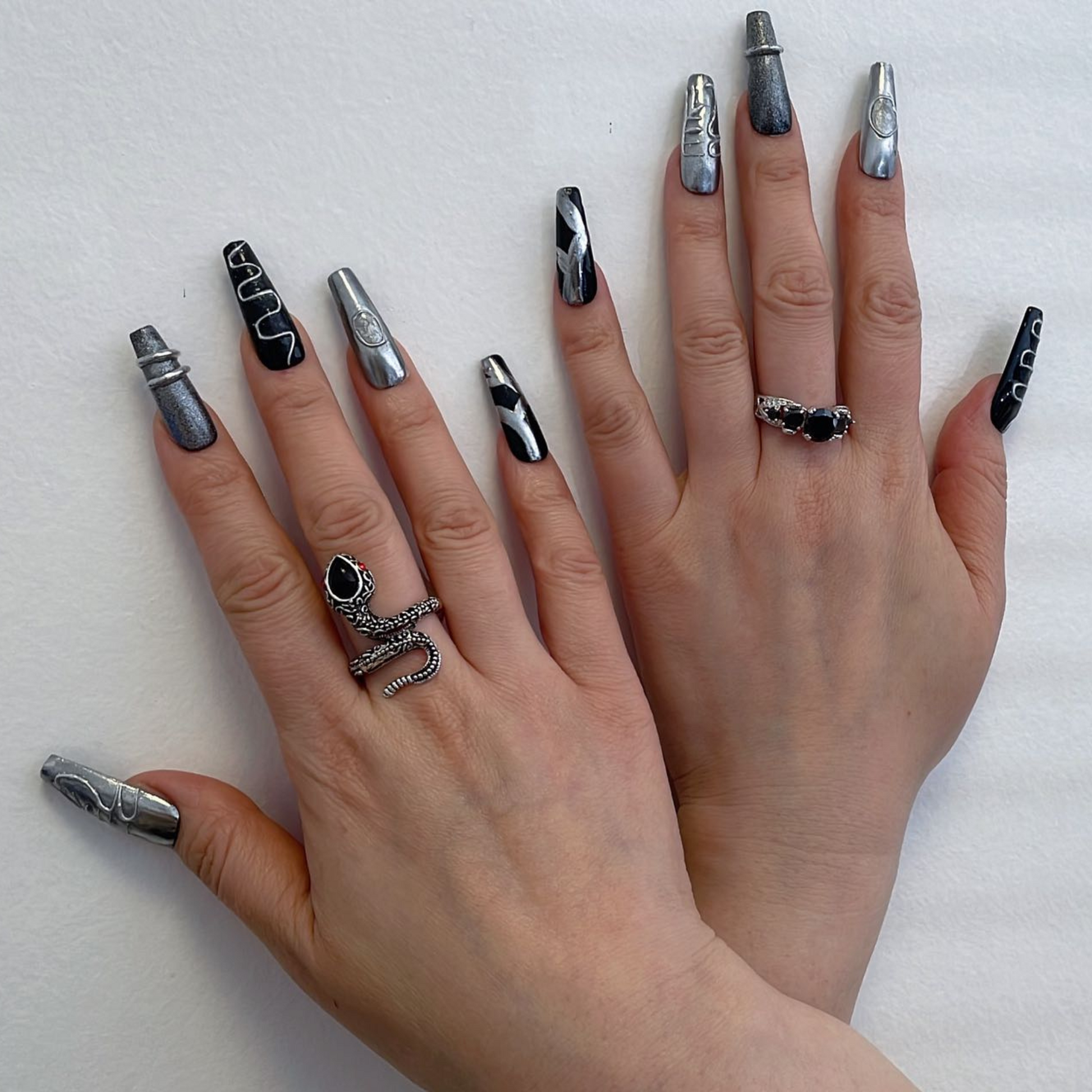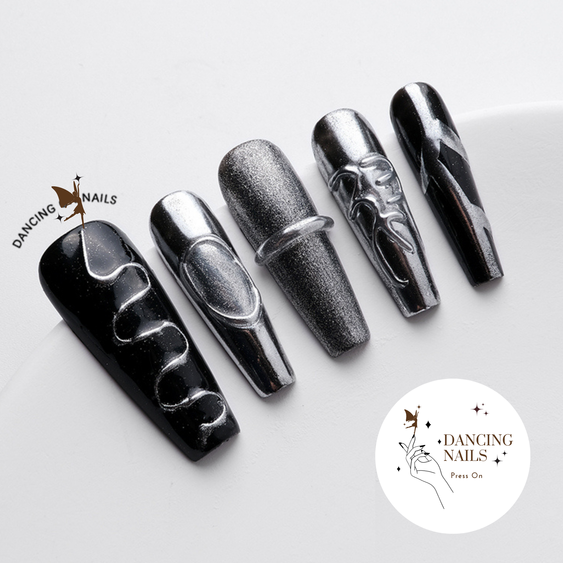 Get ready to slay with our Black and Silver Glitter Pattern Long Coffin Press on Acrylic Nails. With a bold and sparkly design, these press on nails will elevate any look for a night out or special occasion. Just press and go for stunning nails in seconds. Time to shine, babe.