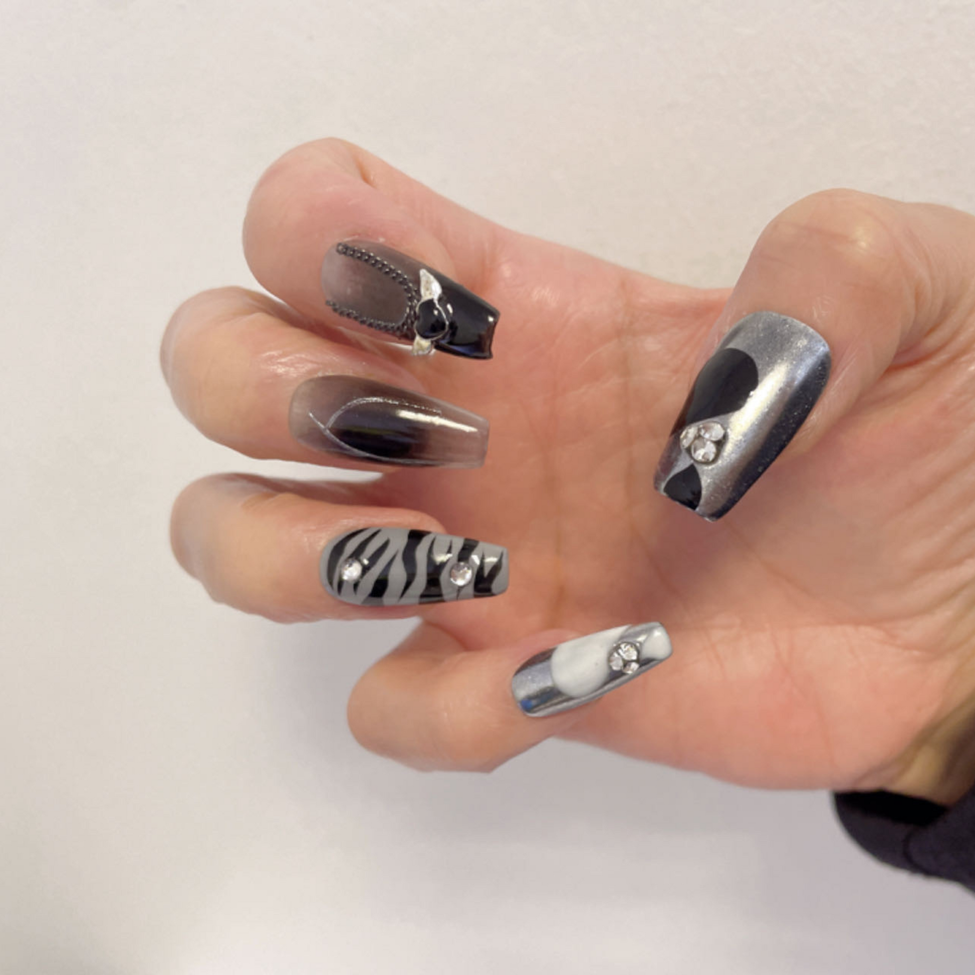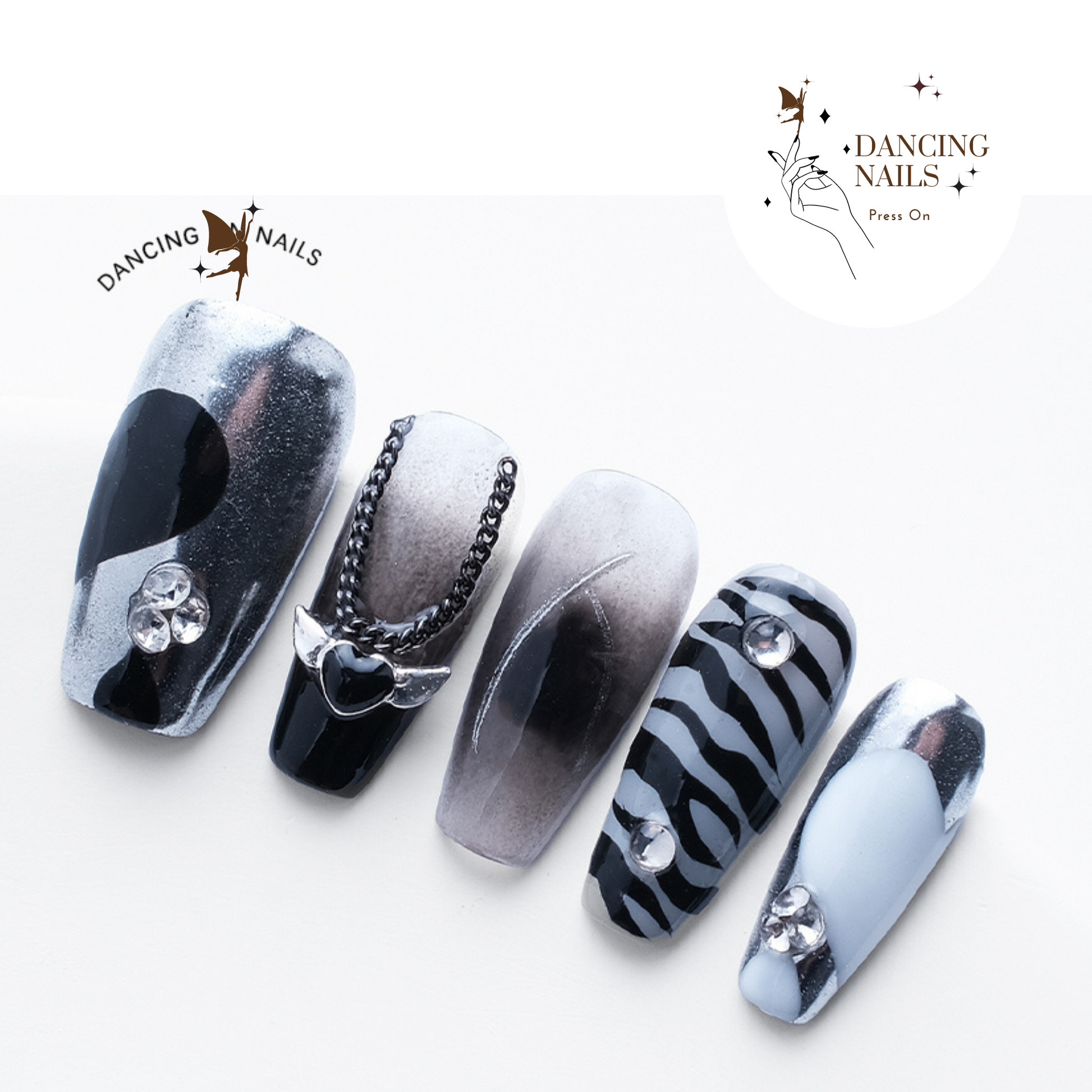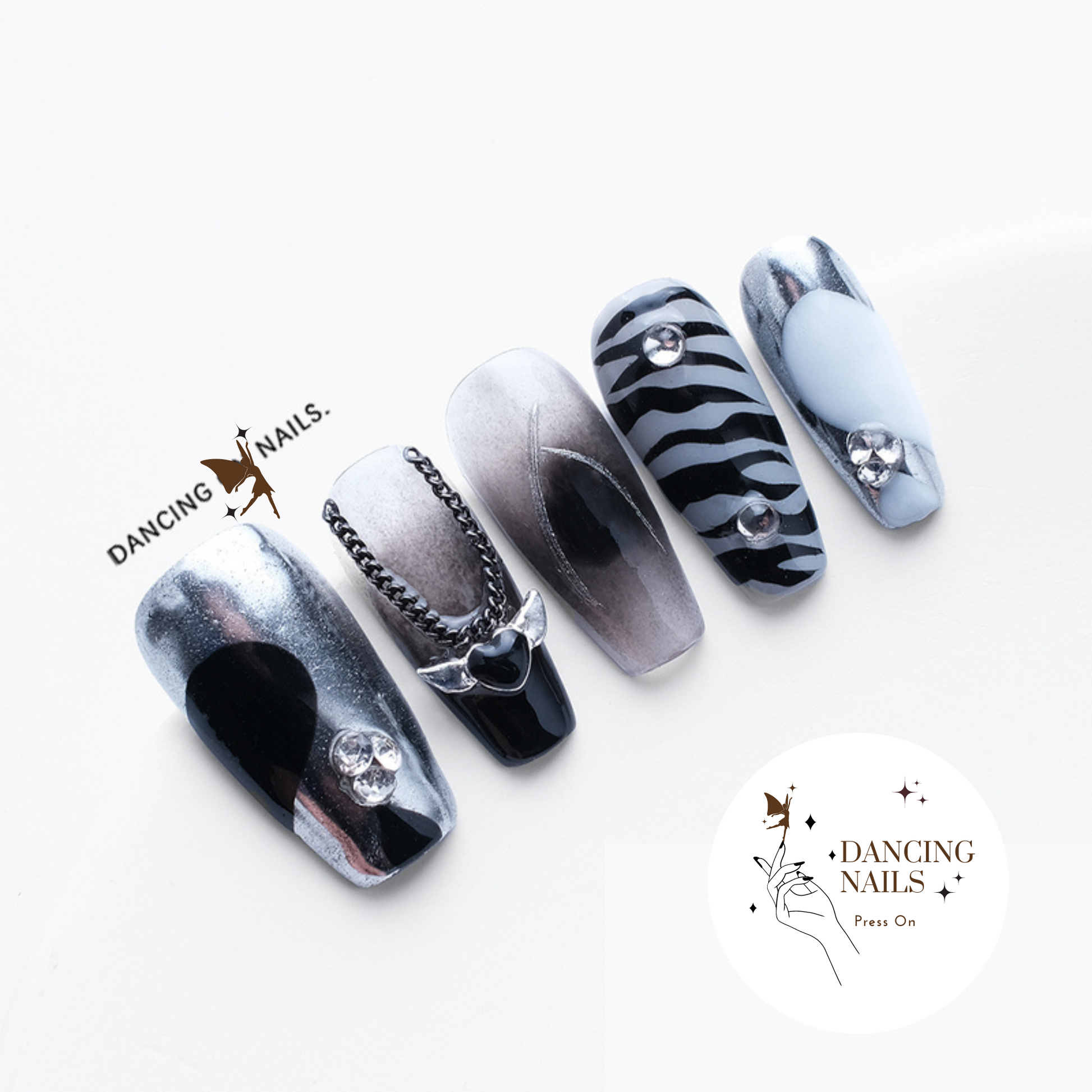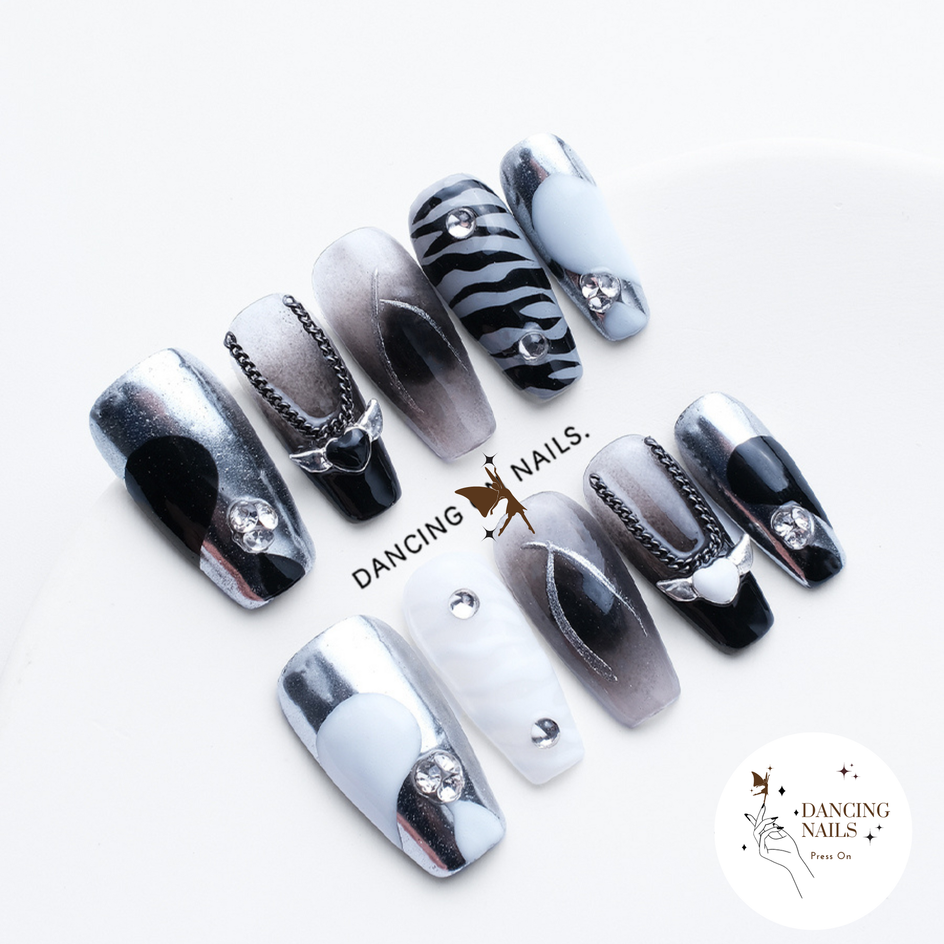 Rock the wild side with our Black and White Zebra Pattern Midi Coffin Press on Acrylic Nails. Mini heart detailing adds a touch of love to your fierce claws. Stand out from the crowd with this unique twist on classic coffin nails. Let your inner adventurer shine through.