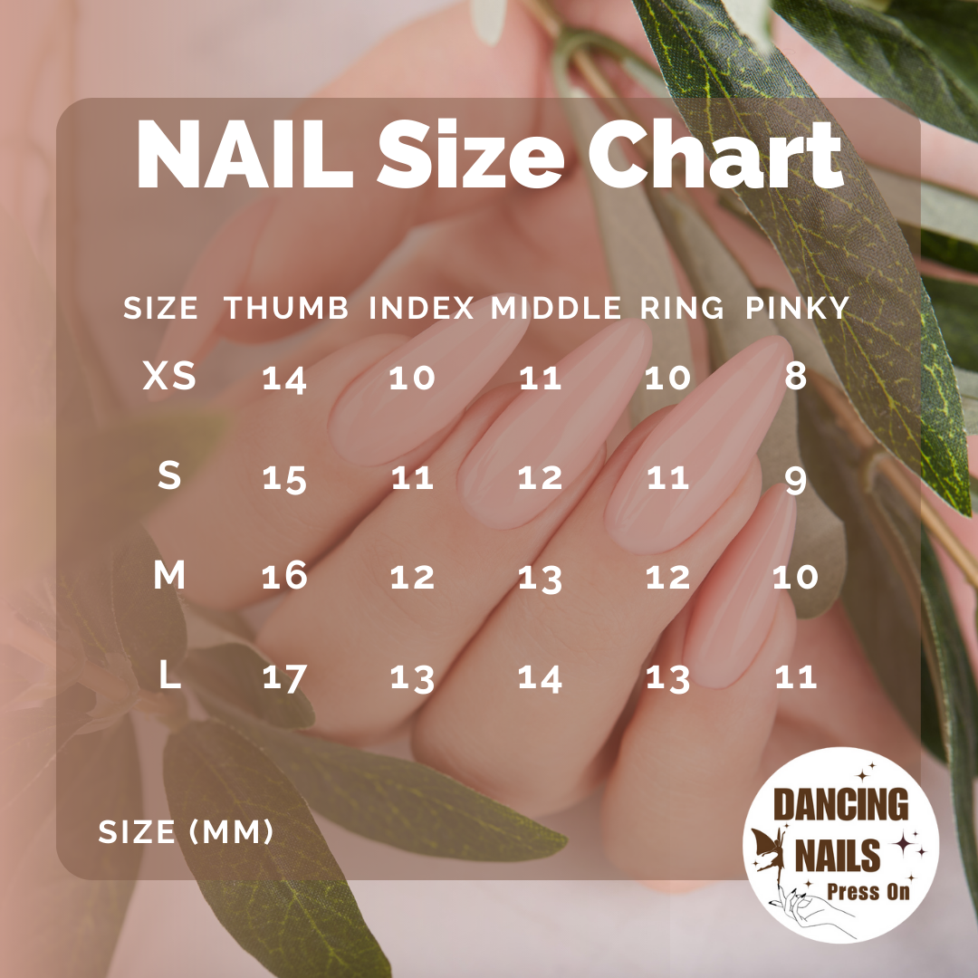 To ensure a perfect fit, let's begin by measuring your nails step-by-step. Once you have your nail measurements, find the sizes on the chart that most closely match your individual fingers. If you're between sizes, it's always better to size up. You can always gently file down the sides and edges of the nail for a perfect fit. By following these steps, you'll be sure to order press-on nails that fit comfortably and securely.