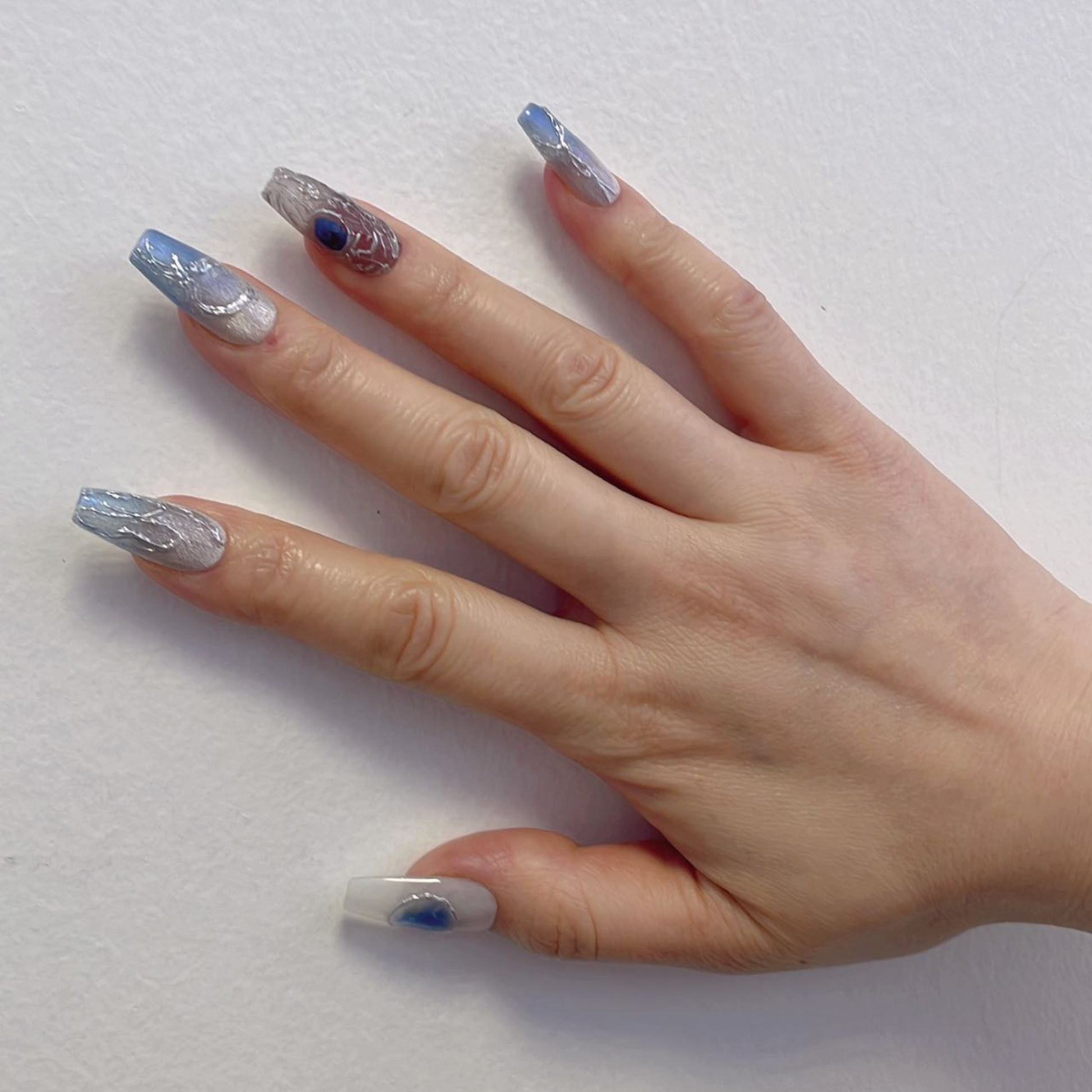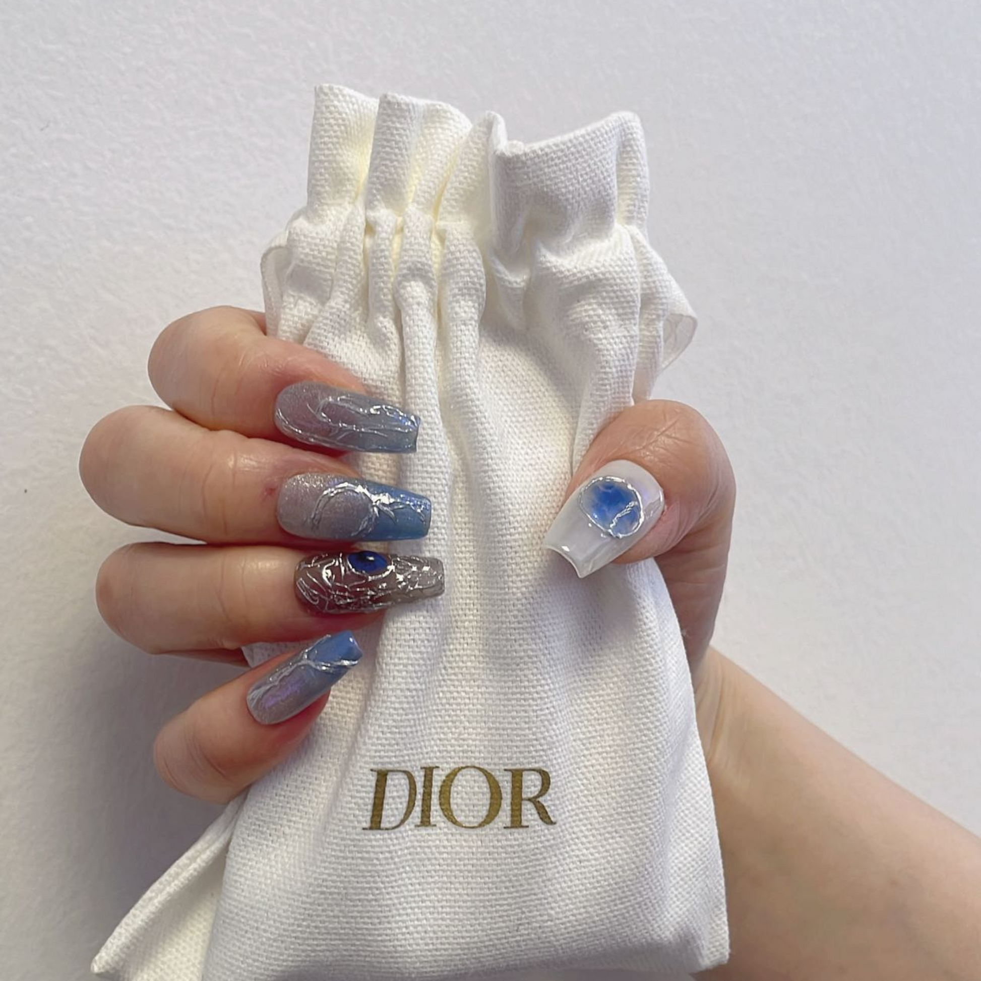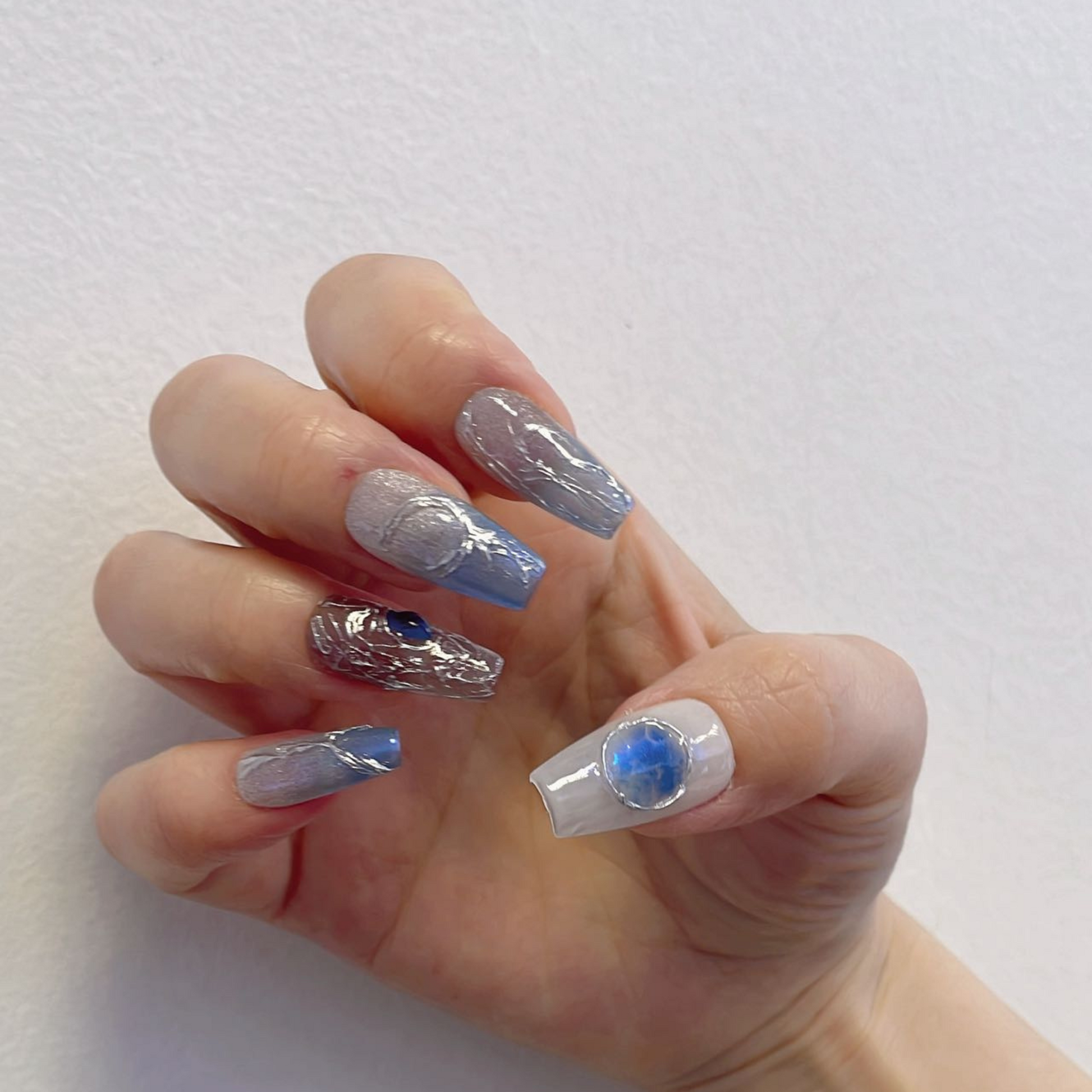 Get killer nails with our Blue Topaz acrylics - featuring a long coffin press and unique blue moon and blue tip design. Nailed it! π π