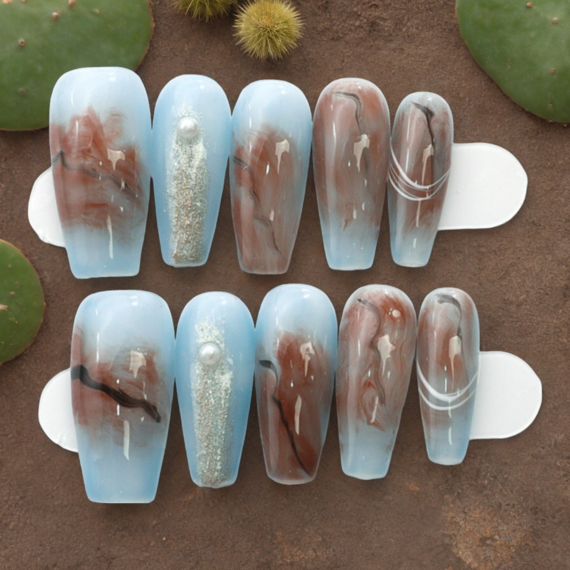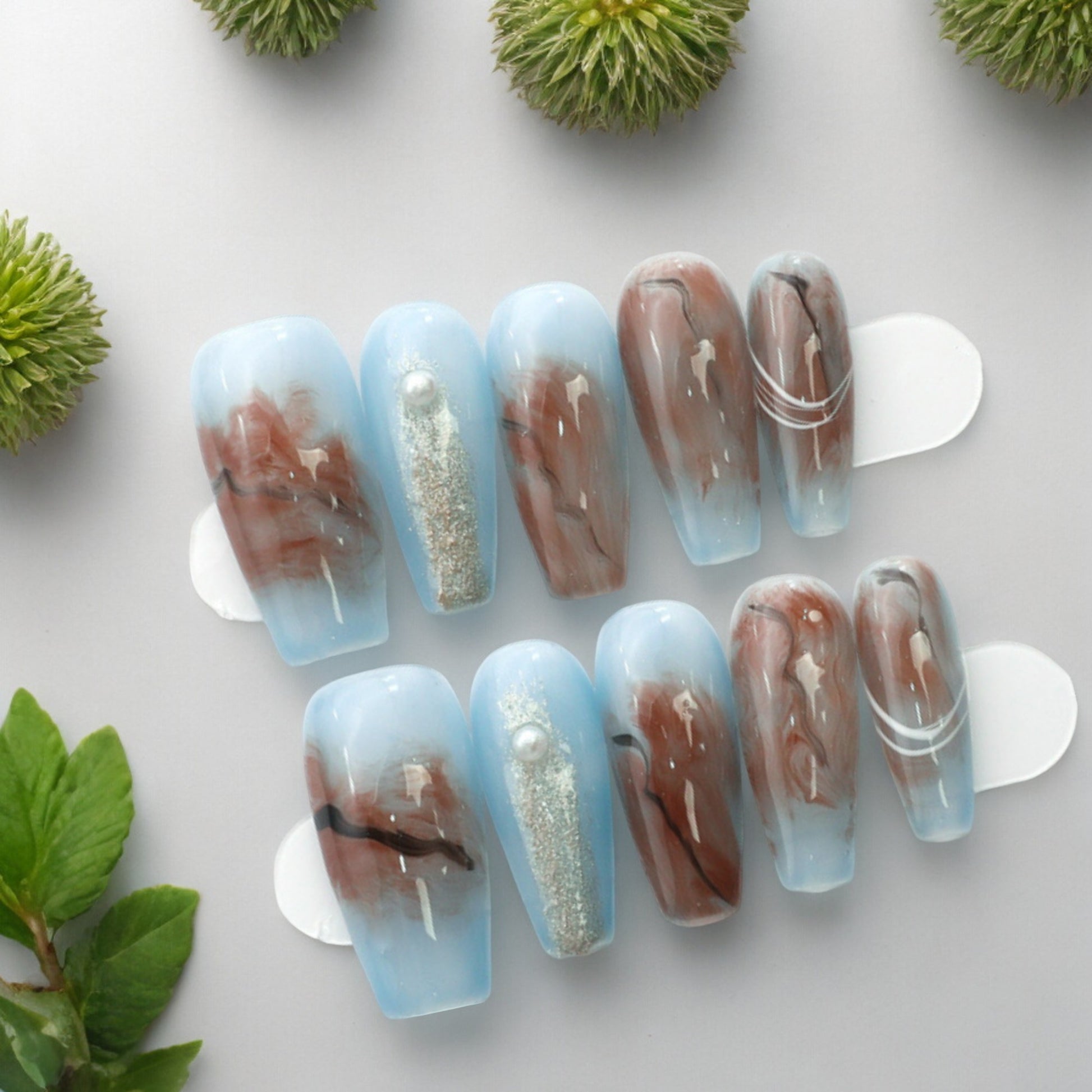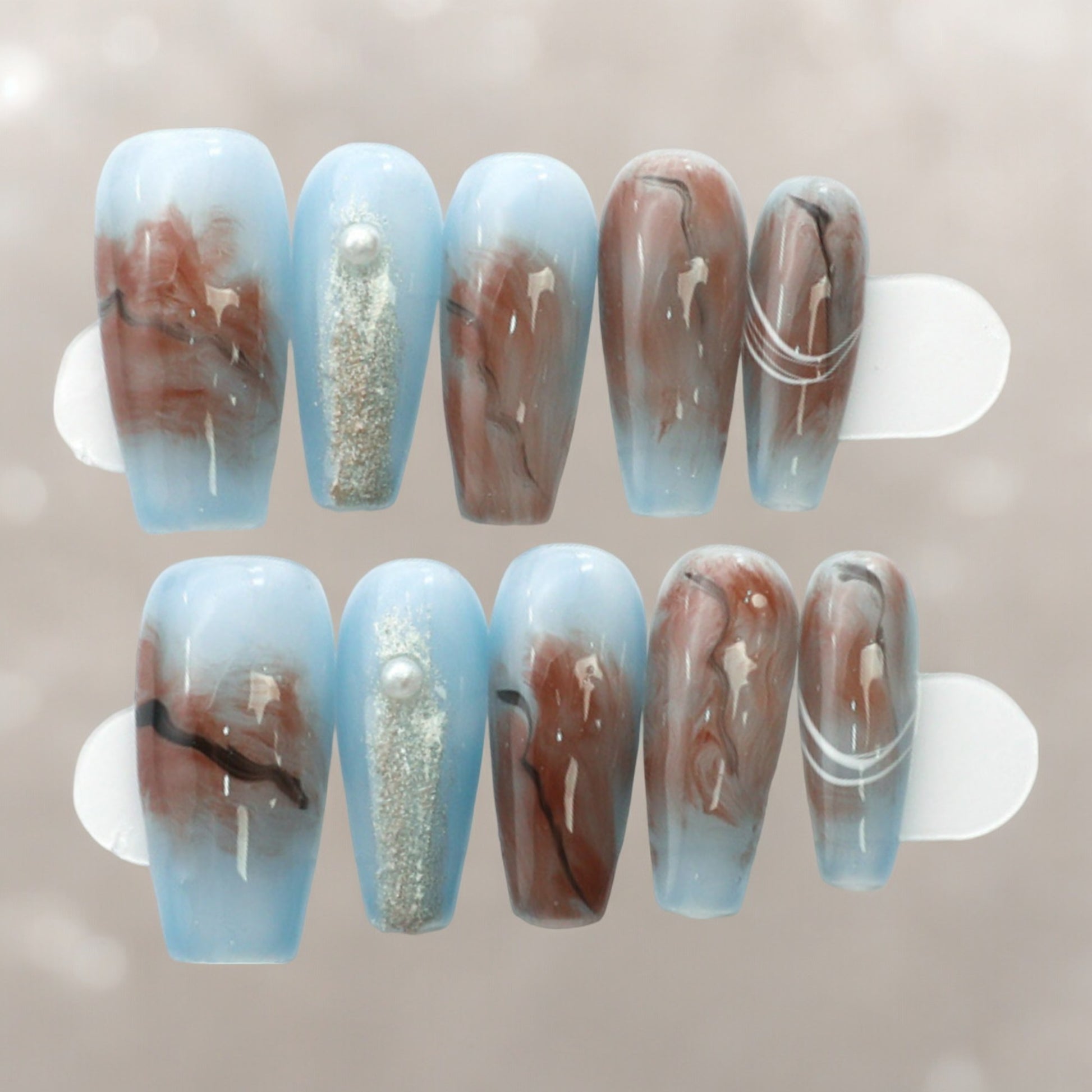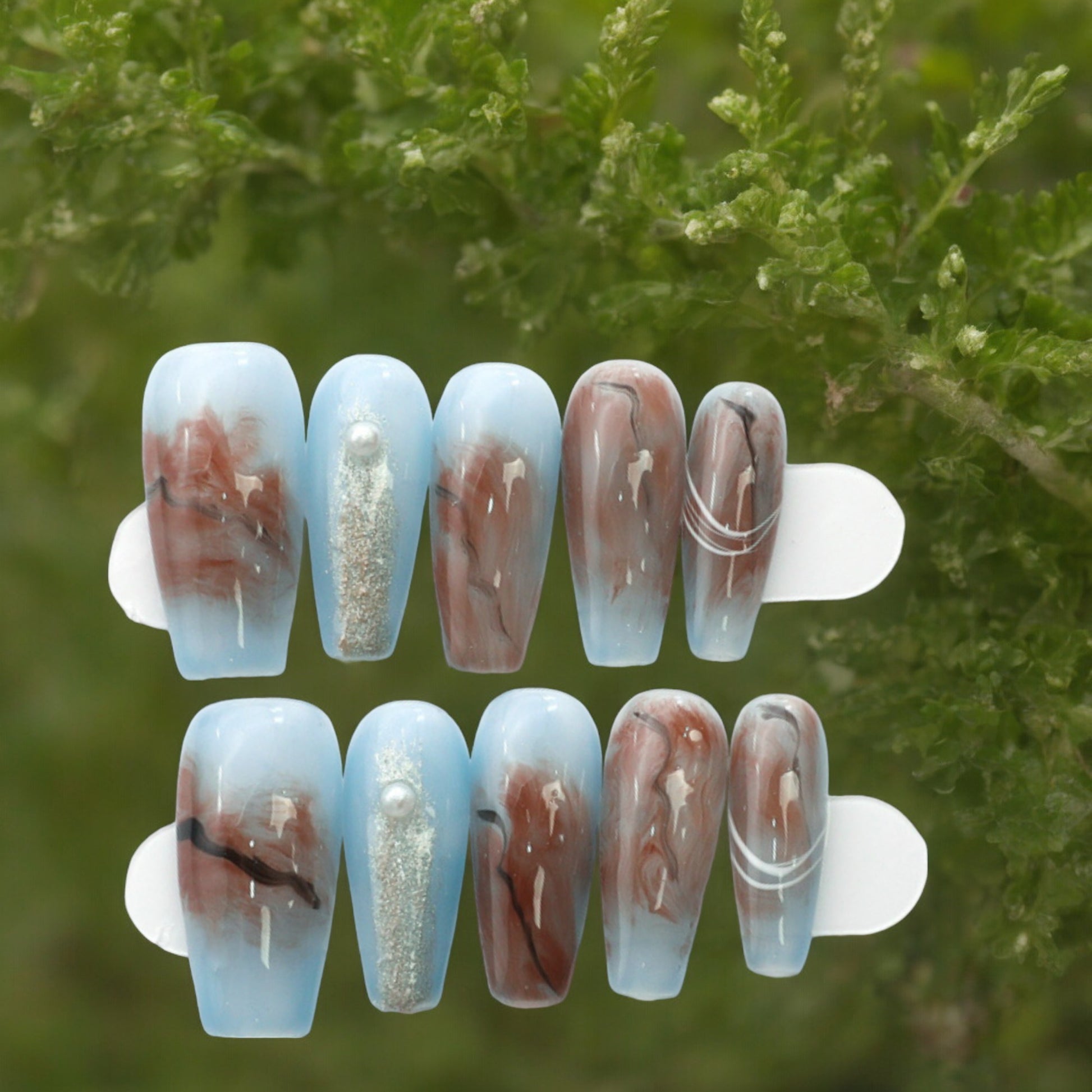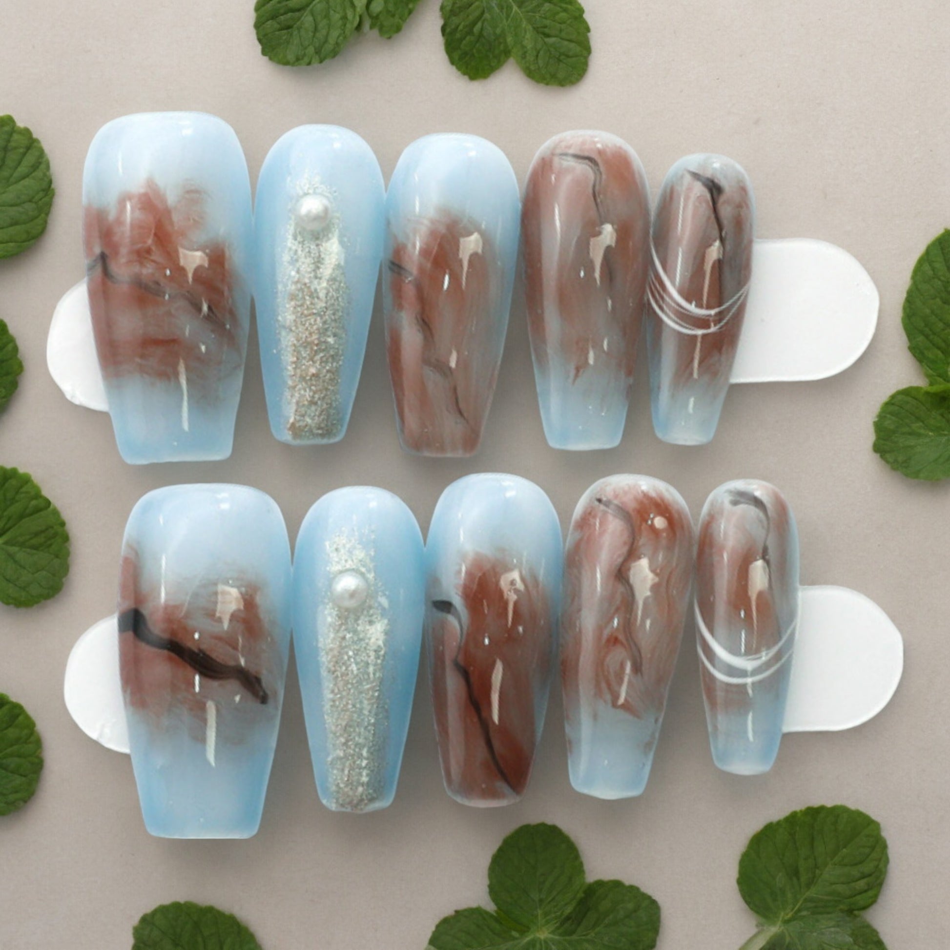 Medium coffin nail shape, painted in a soft watery Blue , with a sandy shimmer. Finished off with Gold shimmer and pearls this set is fabulous.