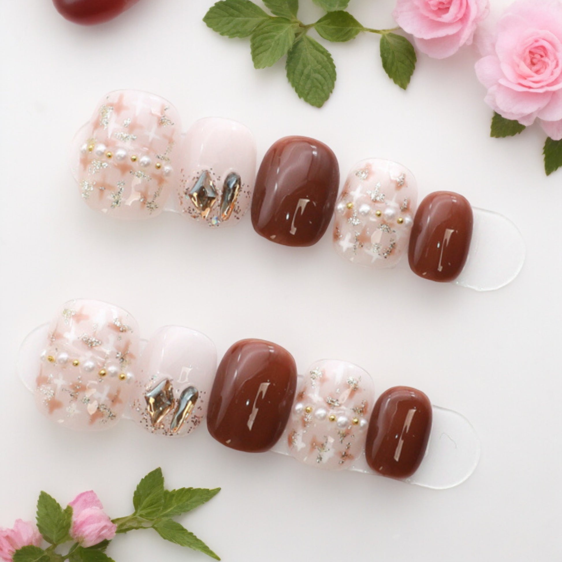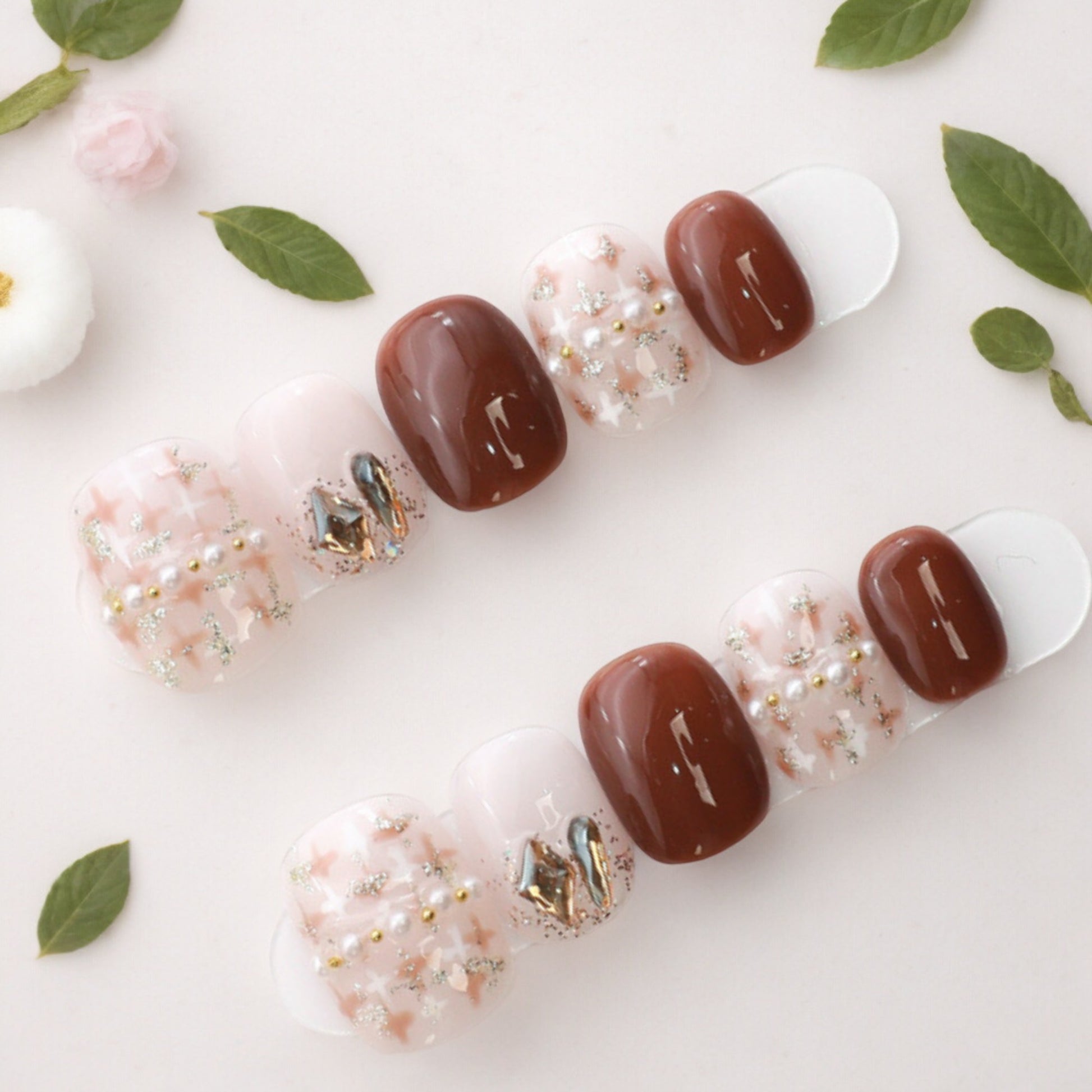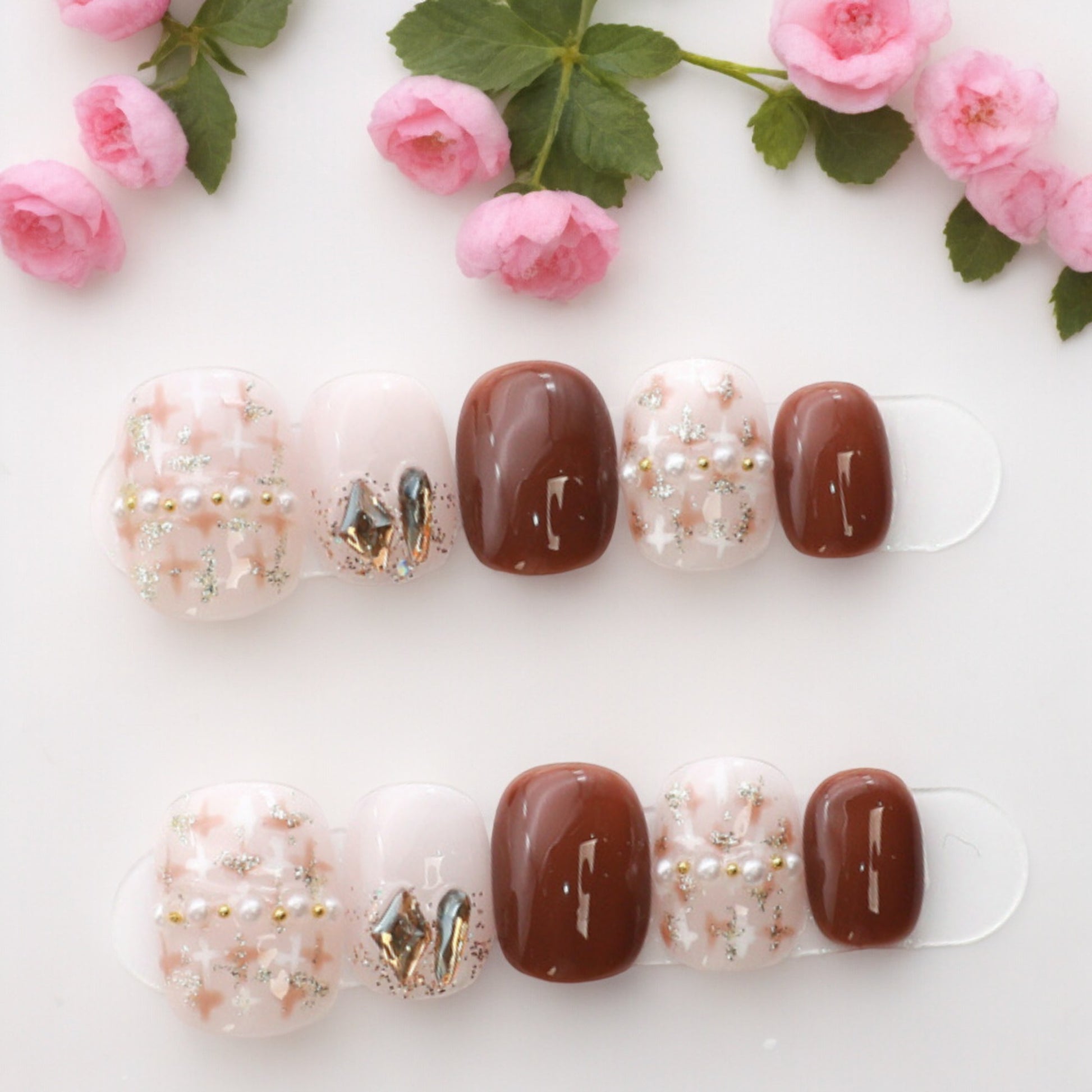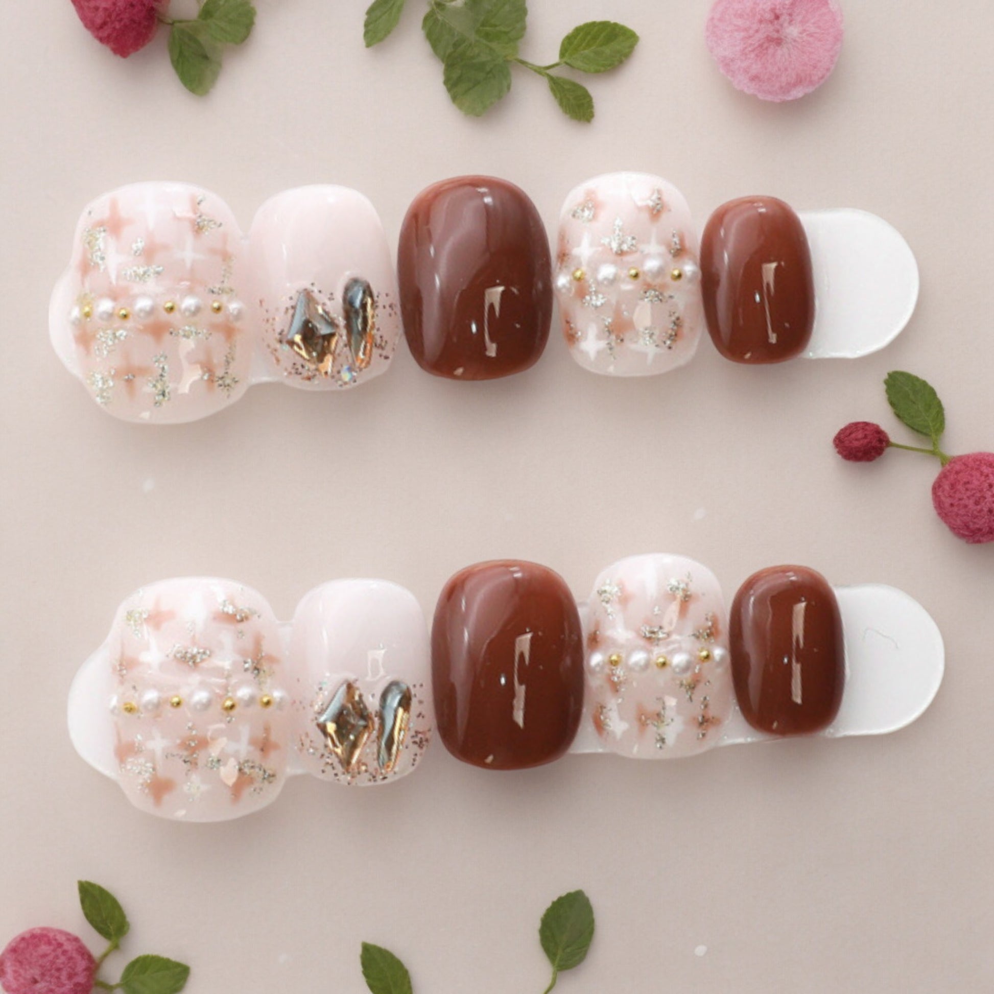 Short round nail shape, painted in pale nude and toffee colours. Complimented with gems and pearls for a classy evrday style. Finished off with a touch of Gold glitter.
