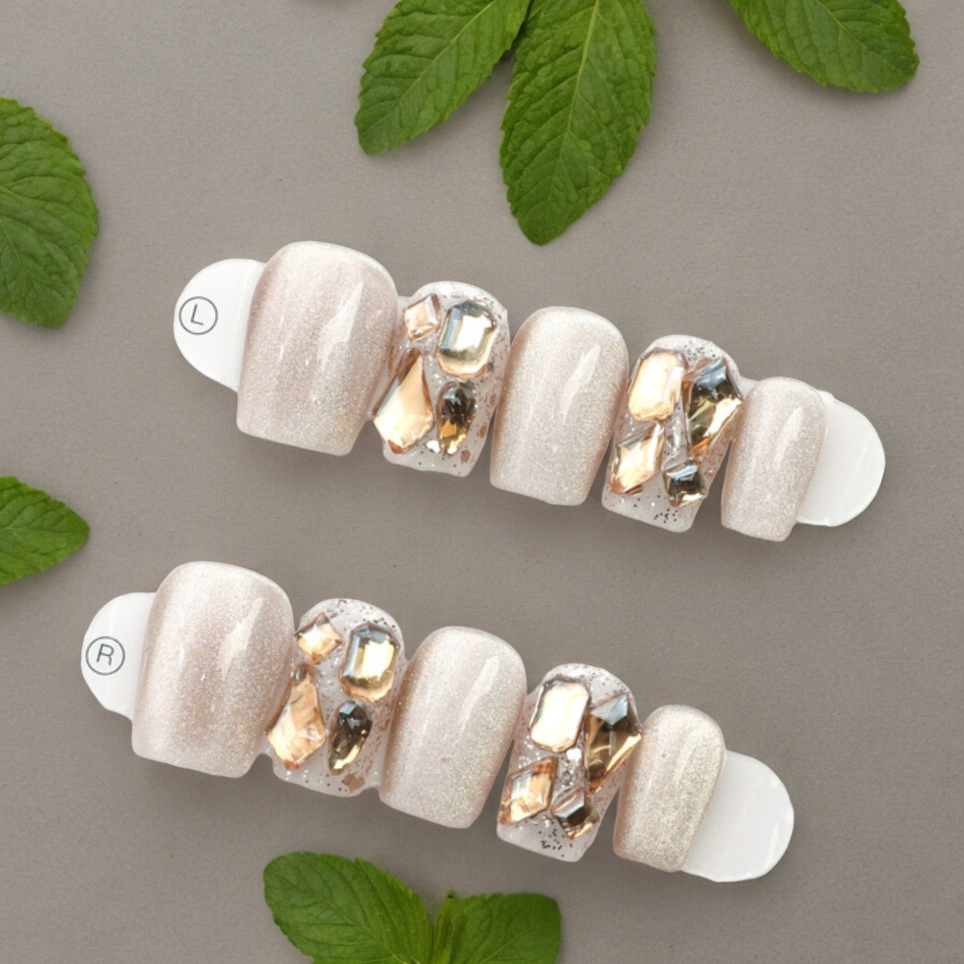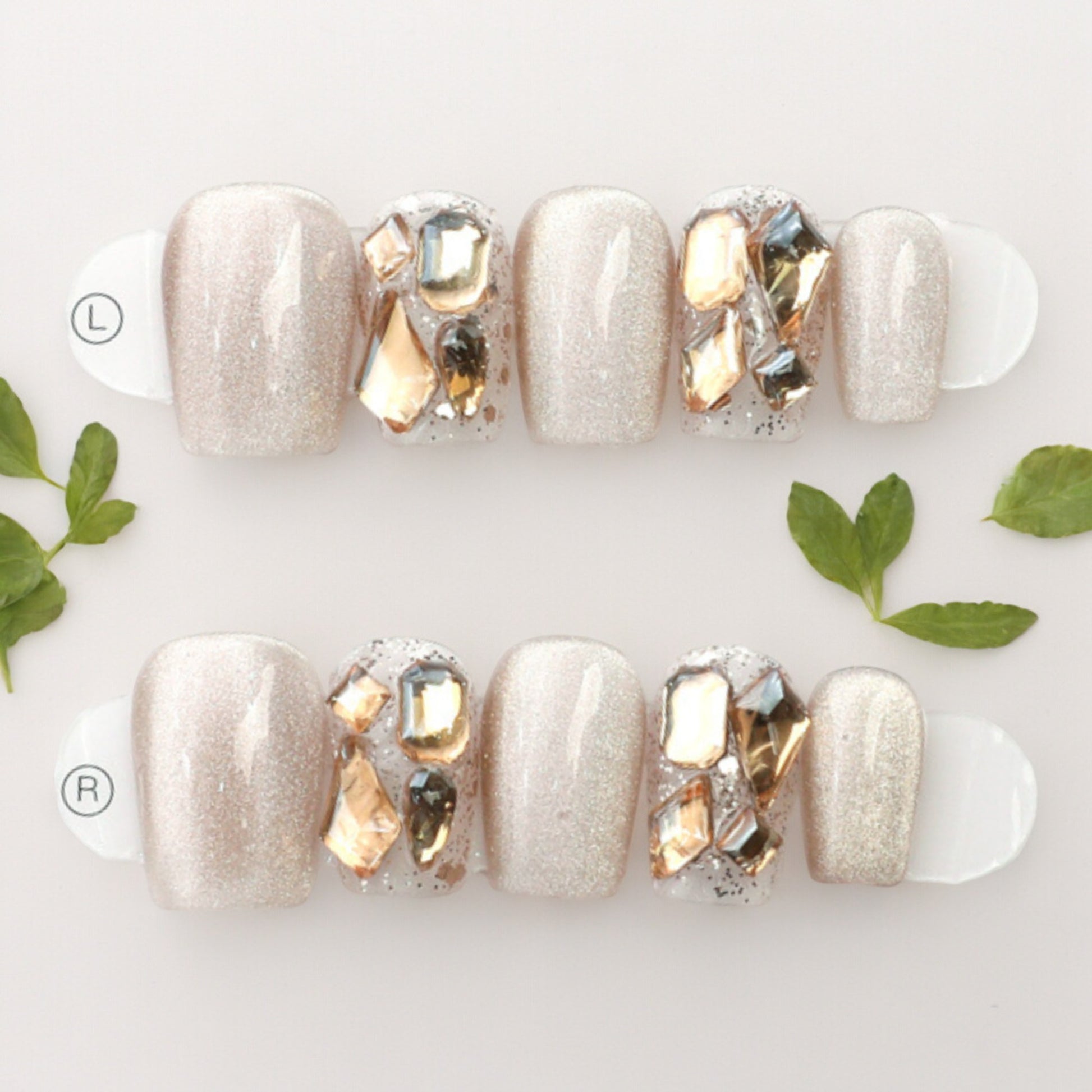 Holographic style nails in a stunning champagne colour, this set will make your hands stand out in the crowd. Short square style for everyday usage.