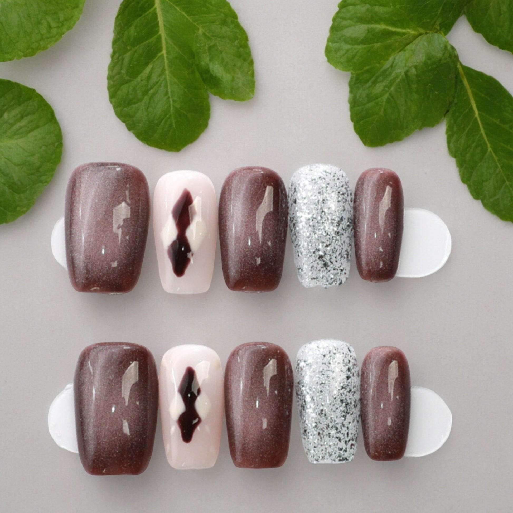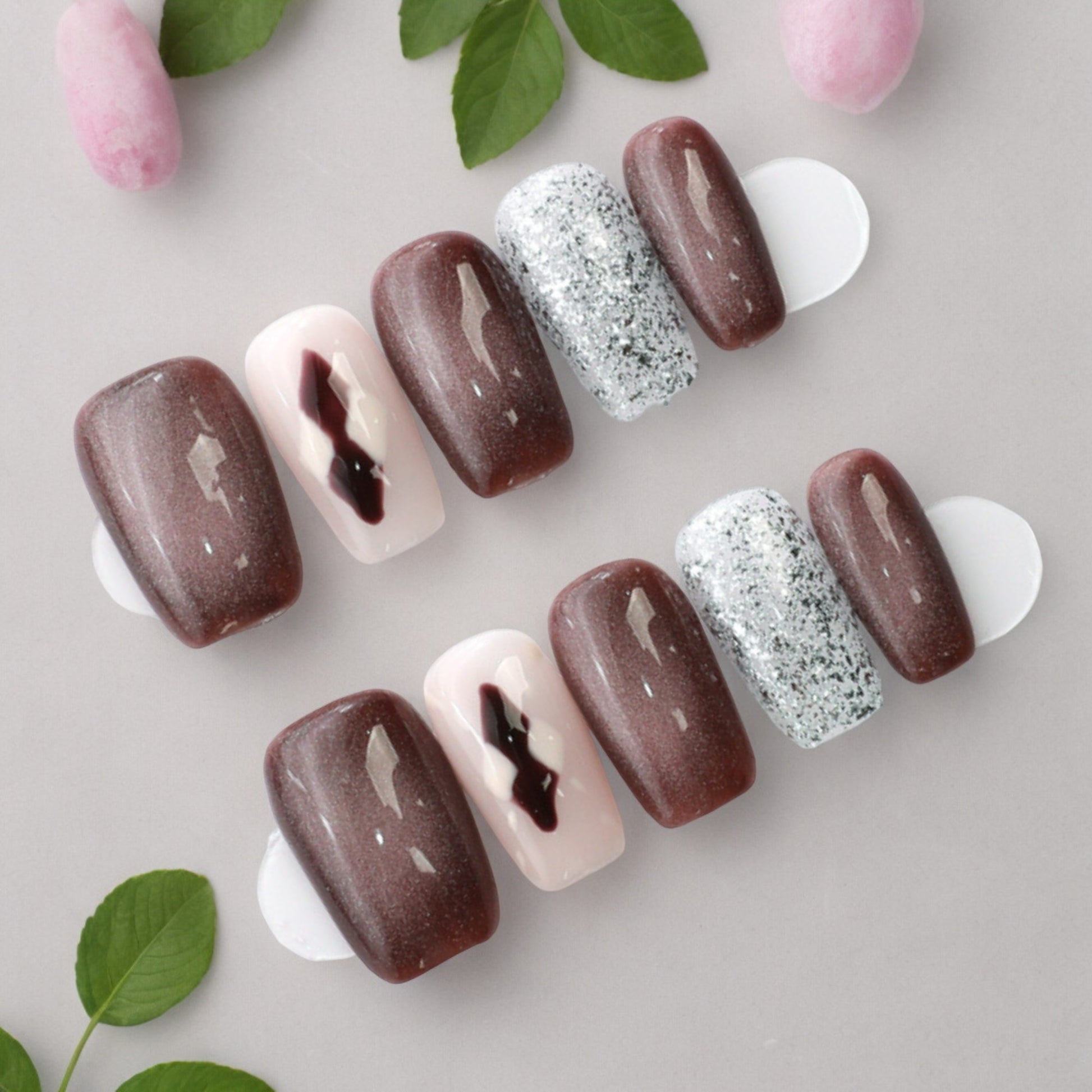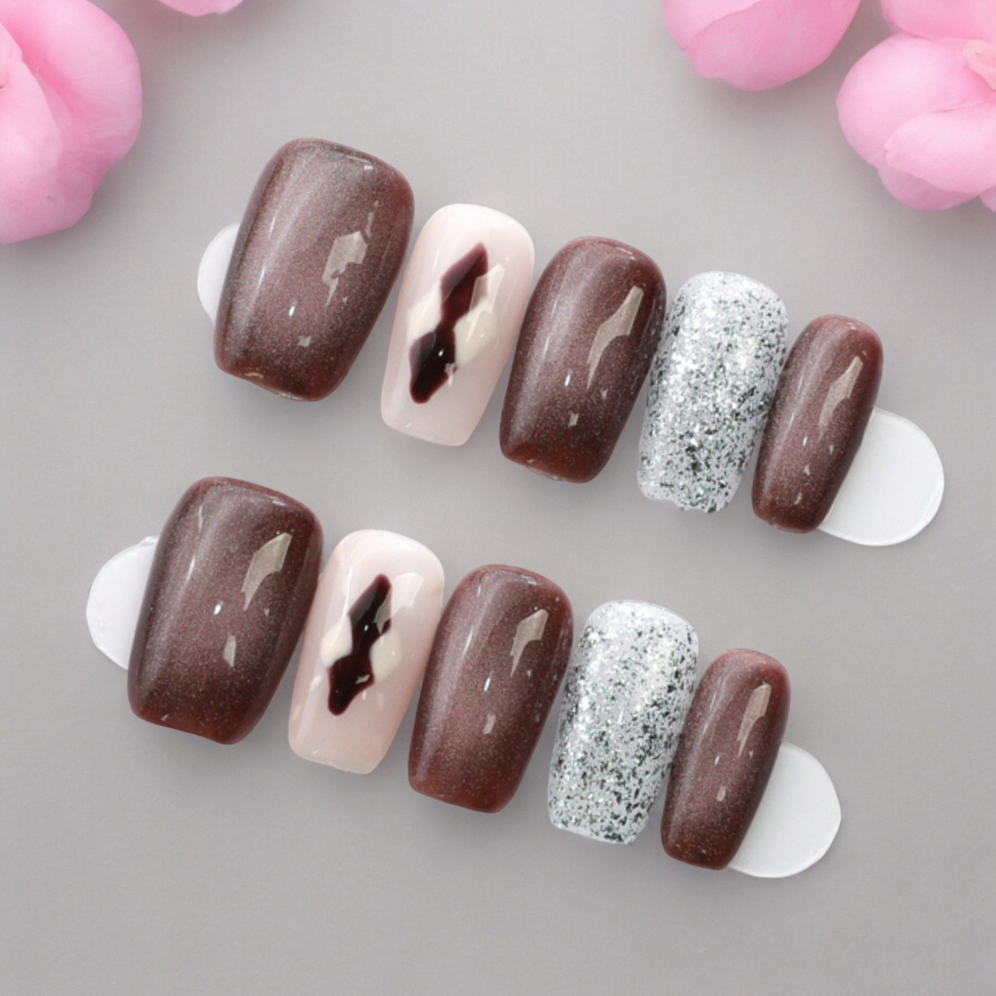 Short coffin style, hand painted in a chocolate and Cream shimmer. A little bit of glitz with a touch of Silver. Perfect to take you from day to evening.