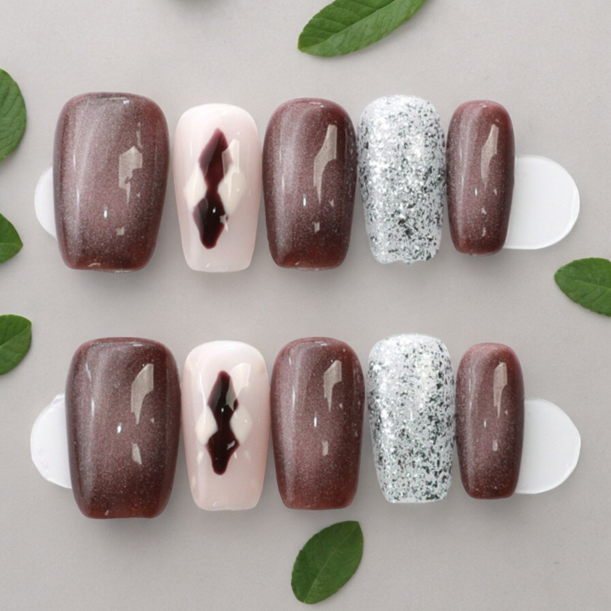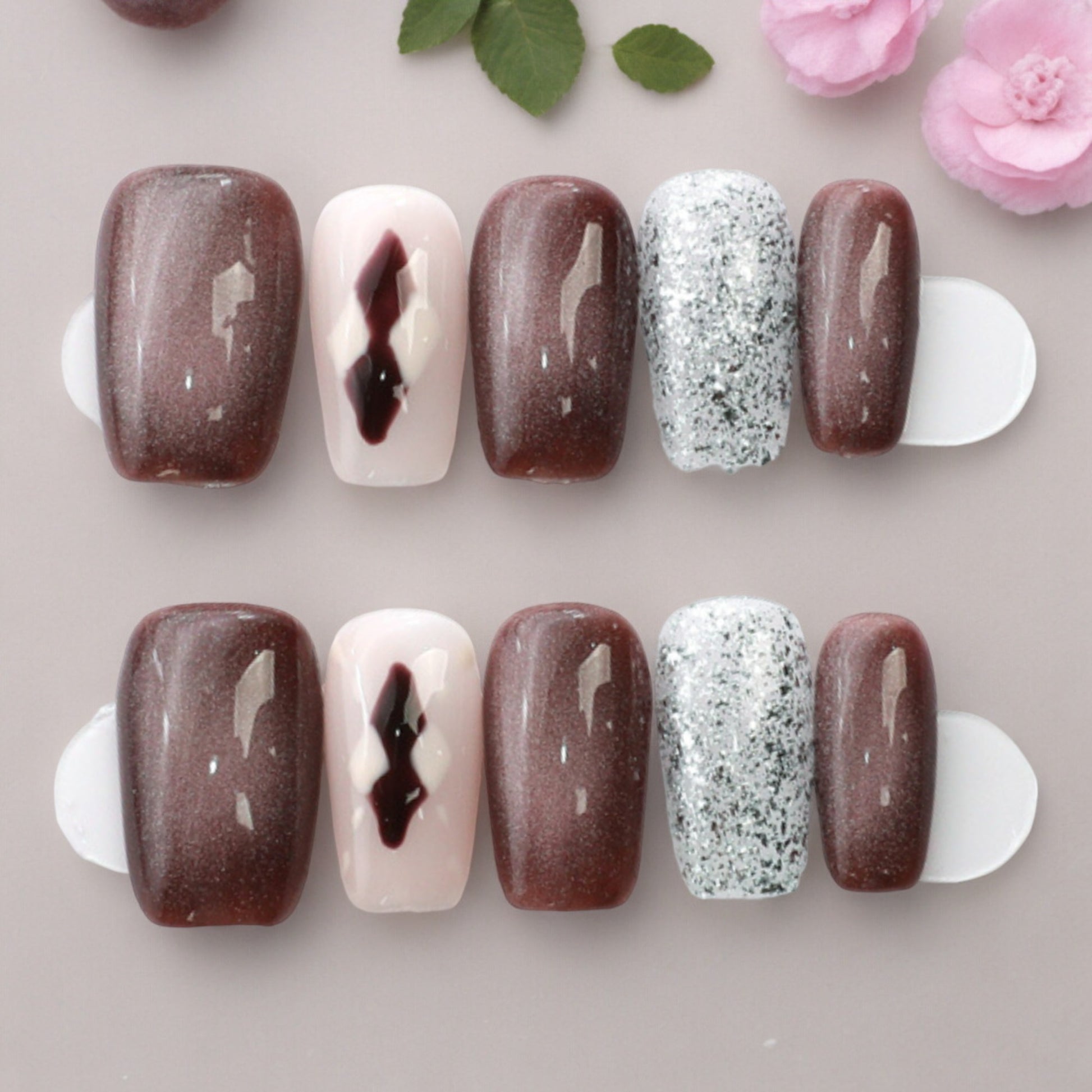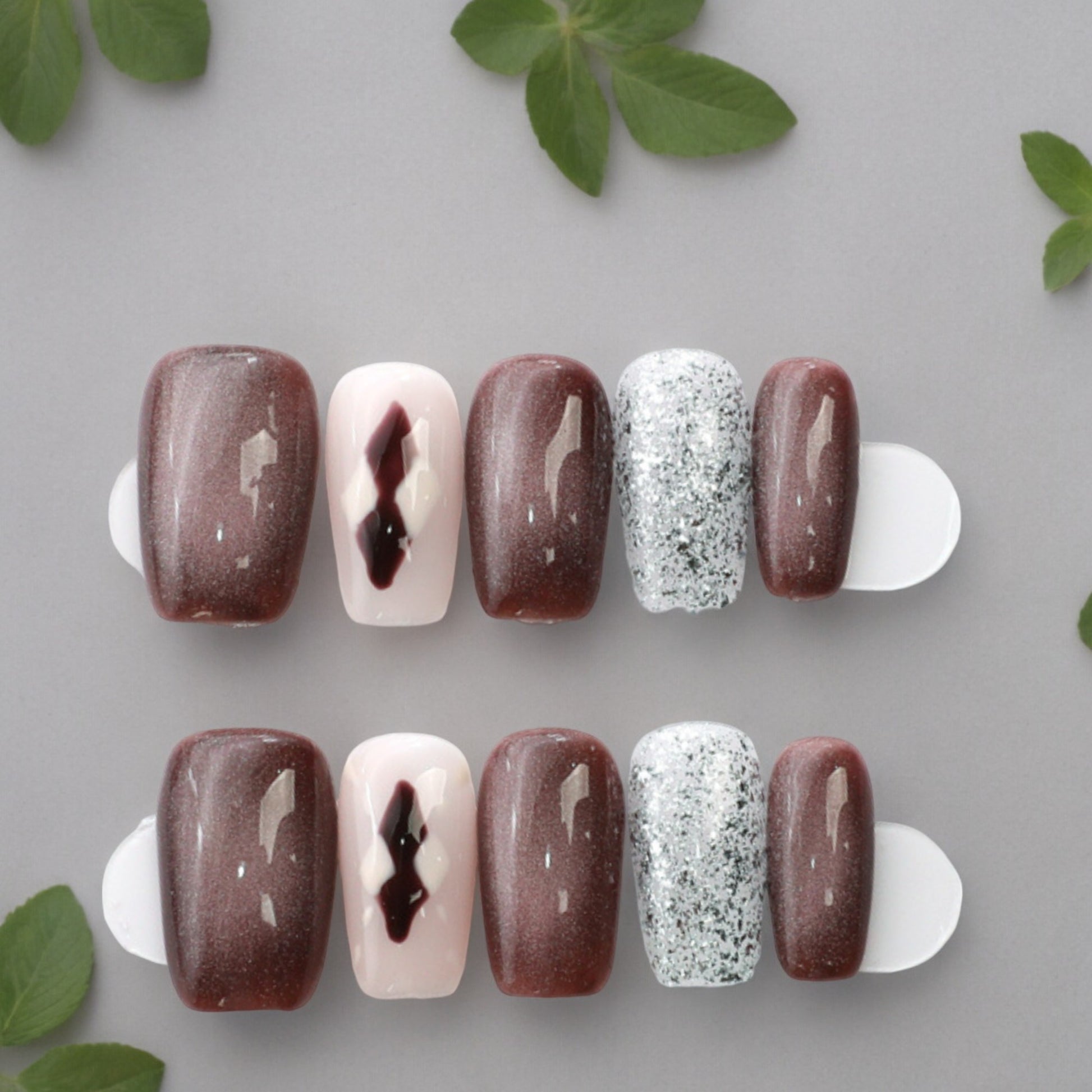 Short coffin style, hand painted in a chocolate and Cream shimmer. A little bit of glitz with a touch of Silver. Perfect to take you from day to evening.