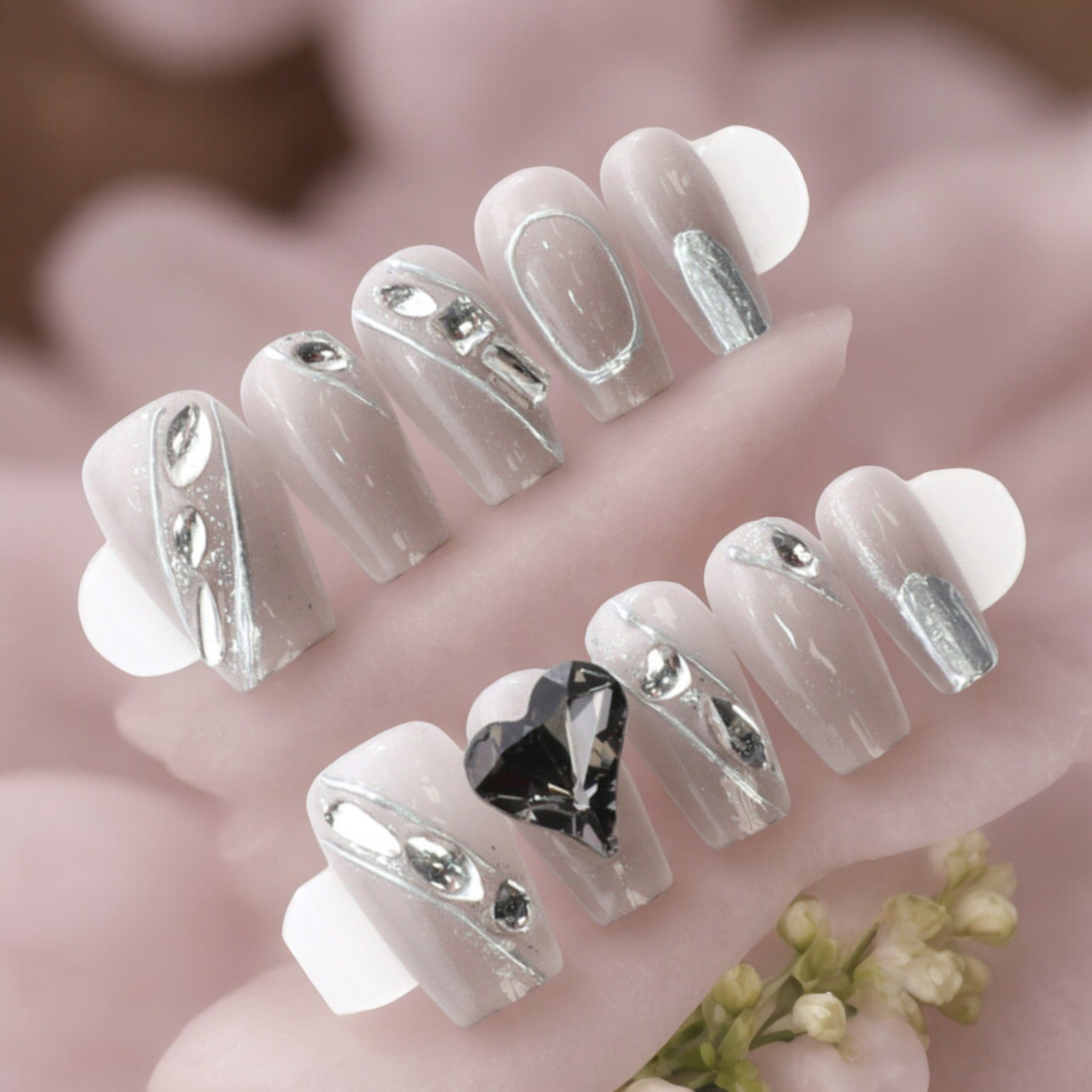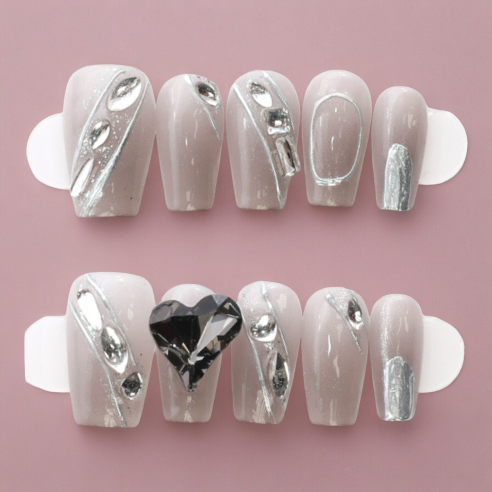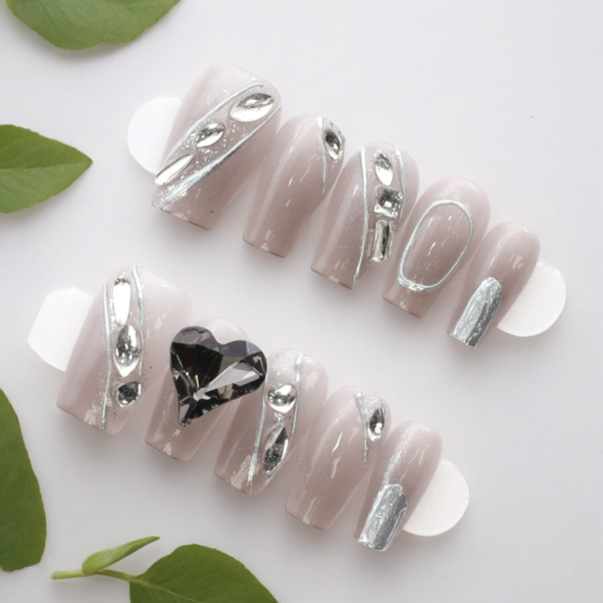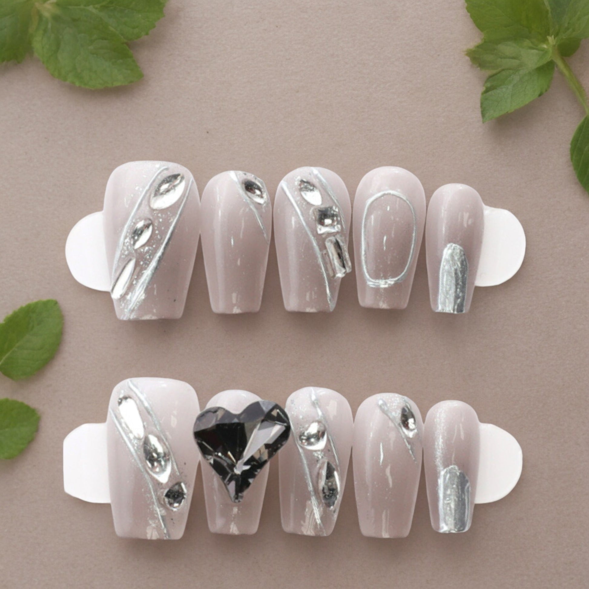 Get glamorous in an instant with Cream Countess! These mini coffin press on nails are adorned with dazzling diamantes and a sleek light gray hue. Perfect for adding a touch of edgy elegance to any look.