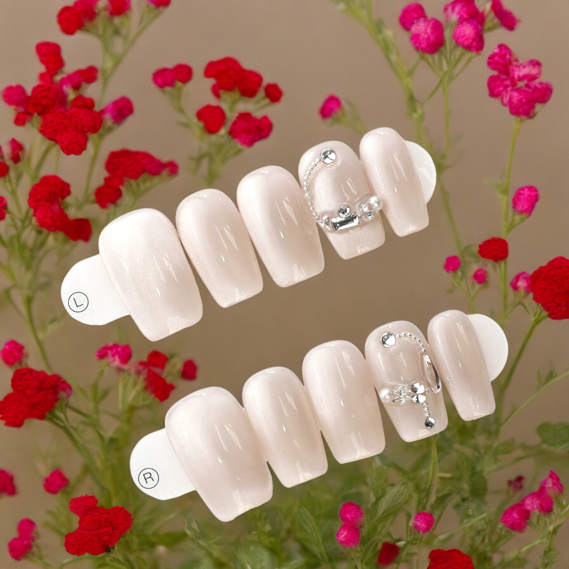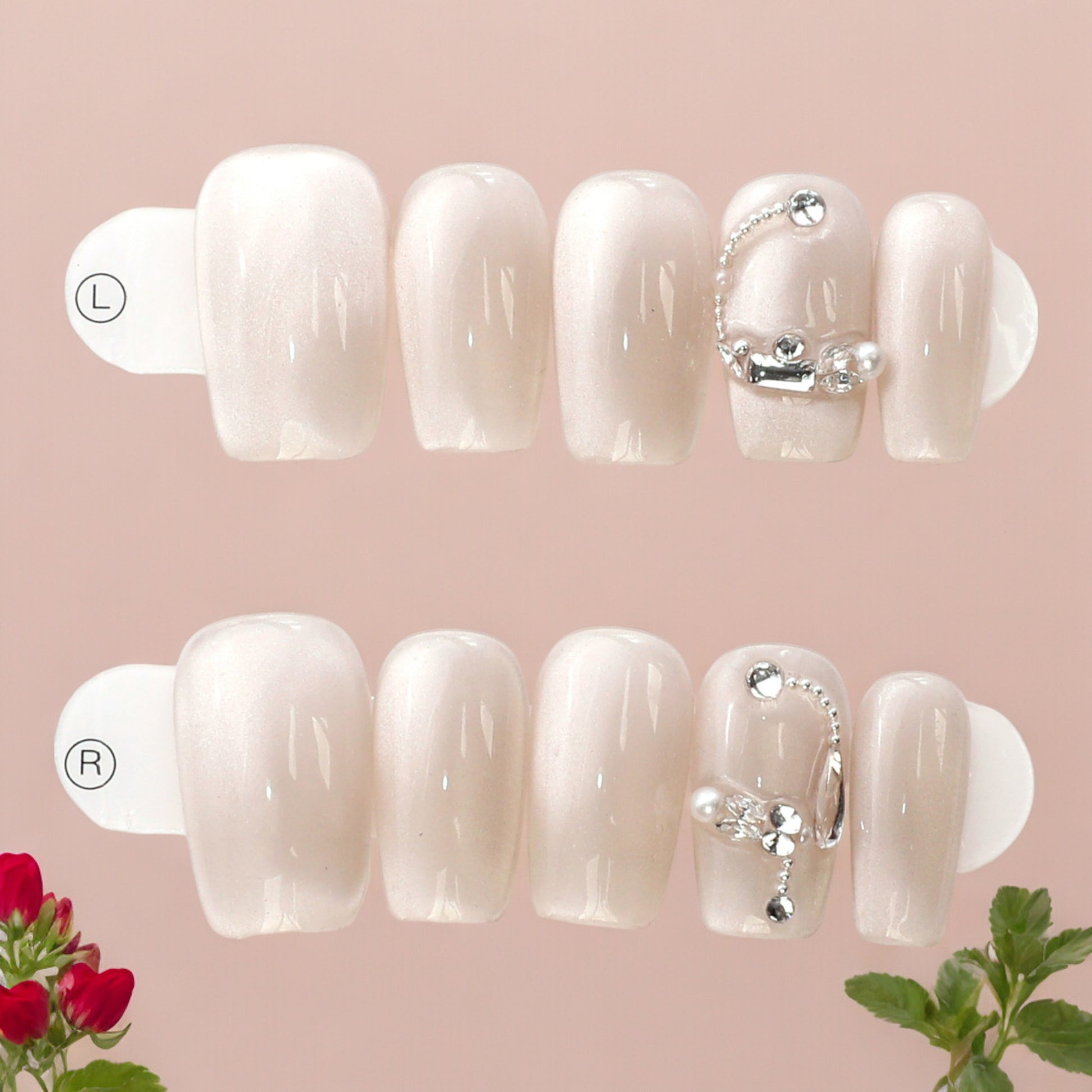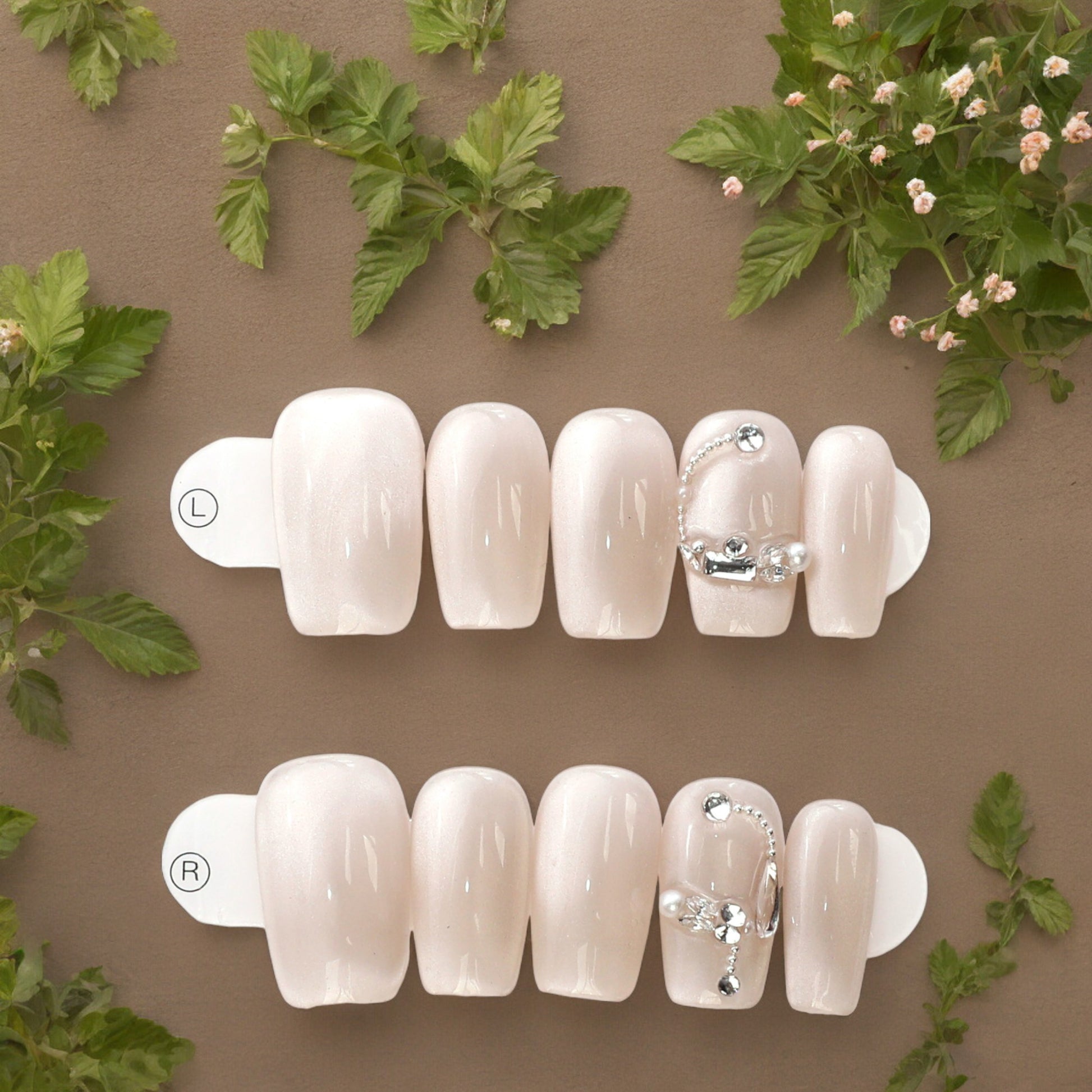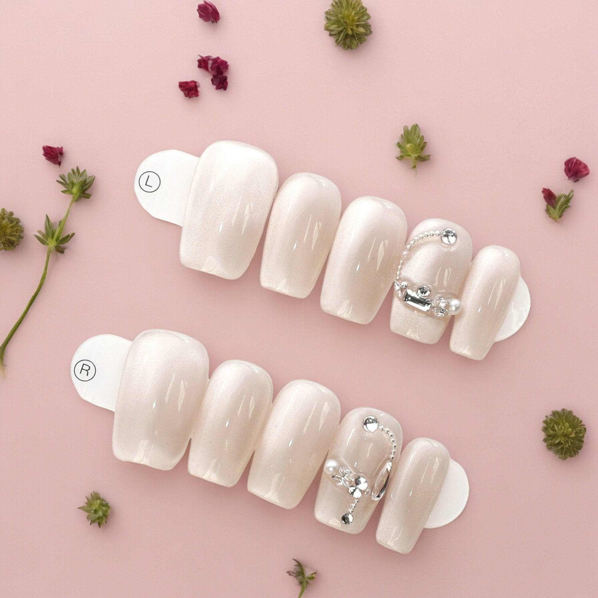 Medium nail length, hand painted in a beautiful pearly, shimmery cream. Just a touch of gem decoration on two of the fingers, gives a little sparkle.
