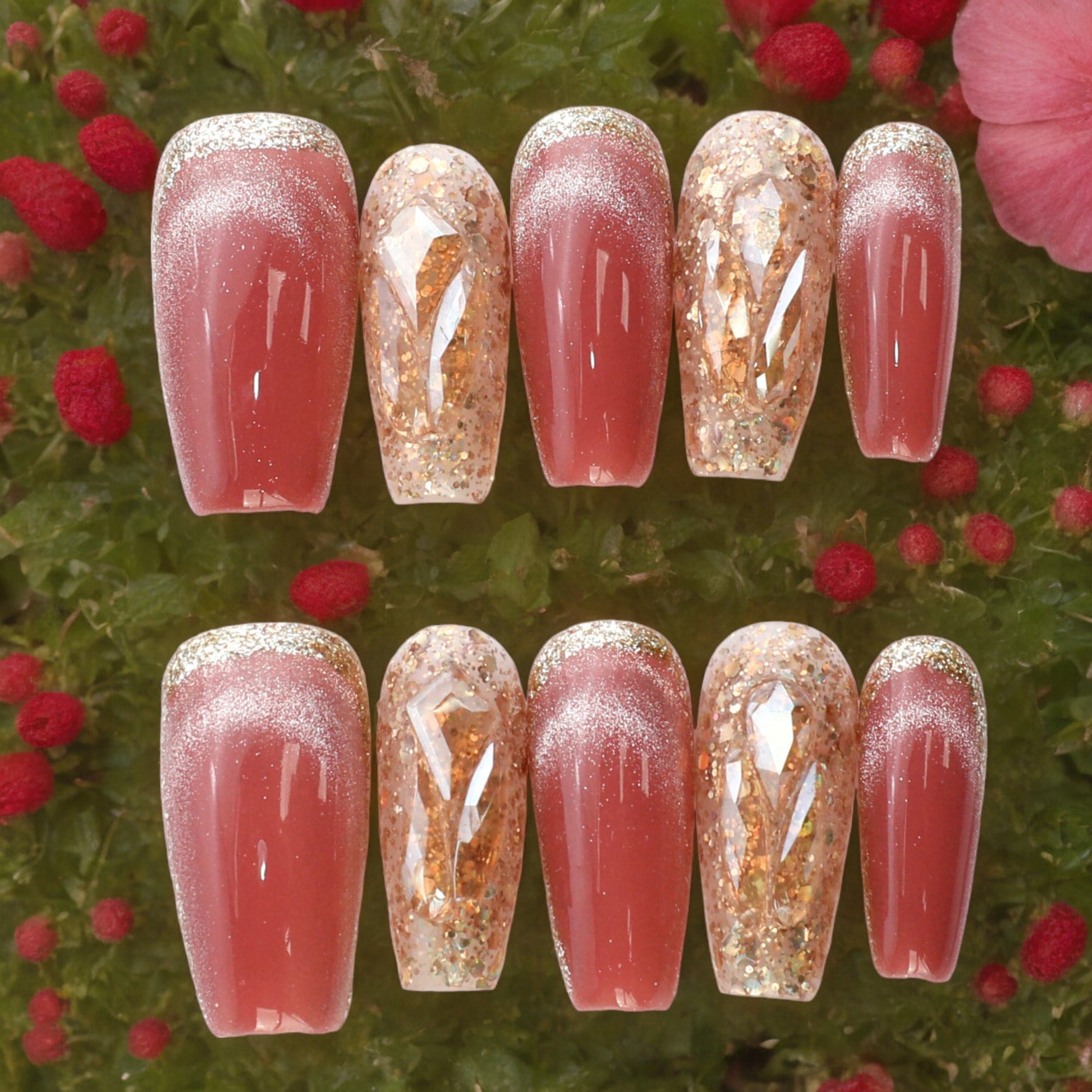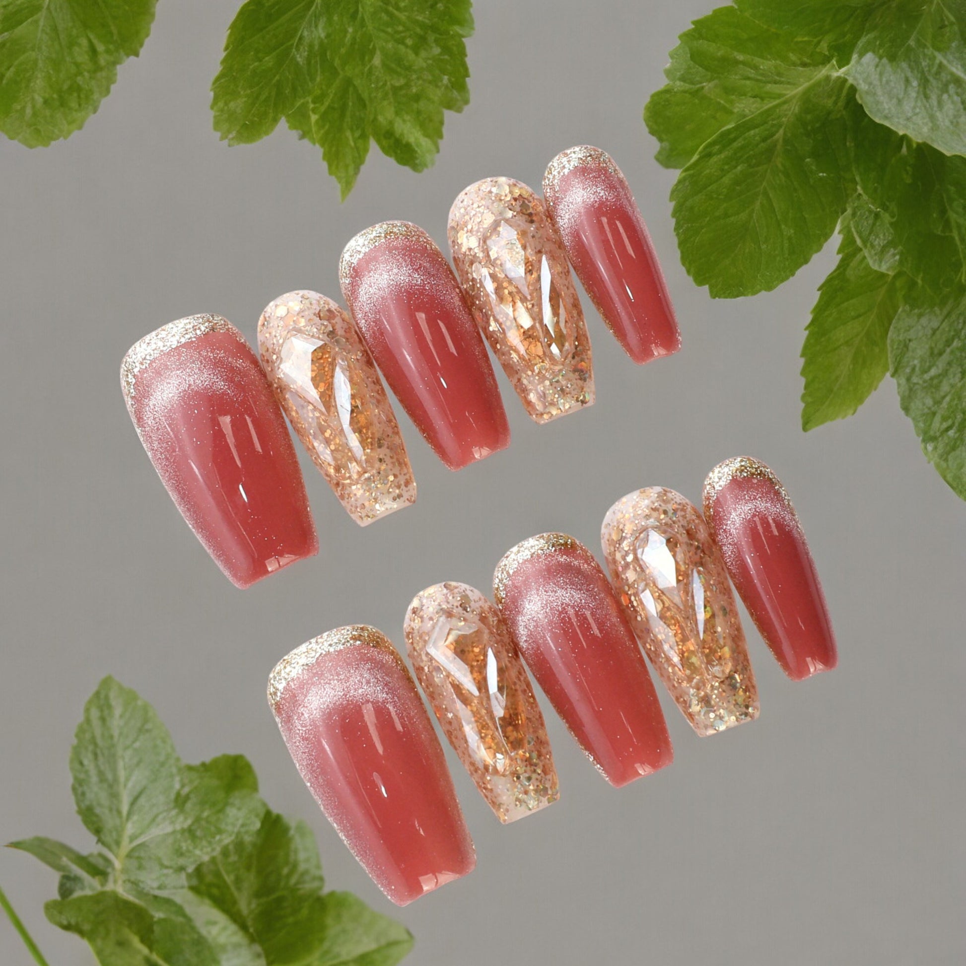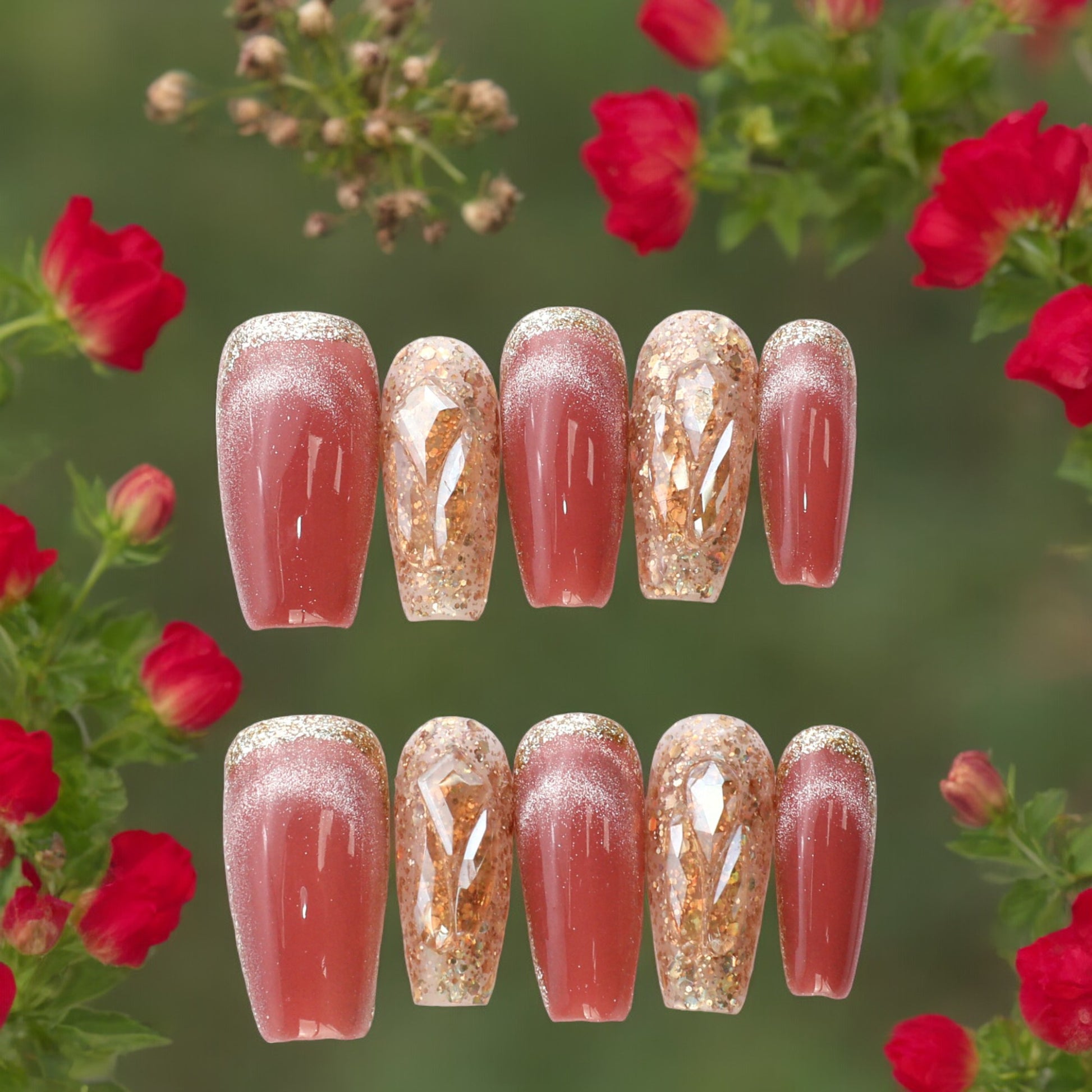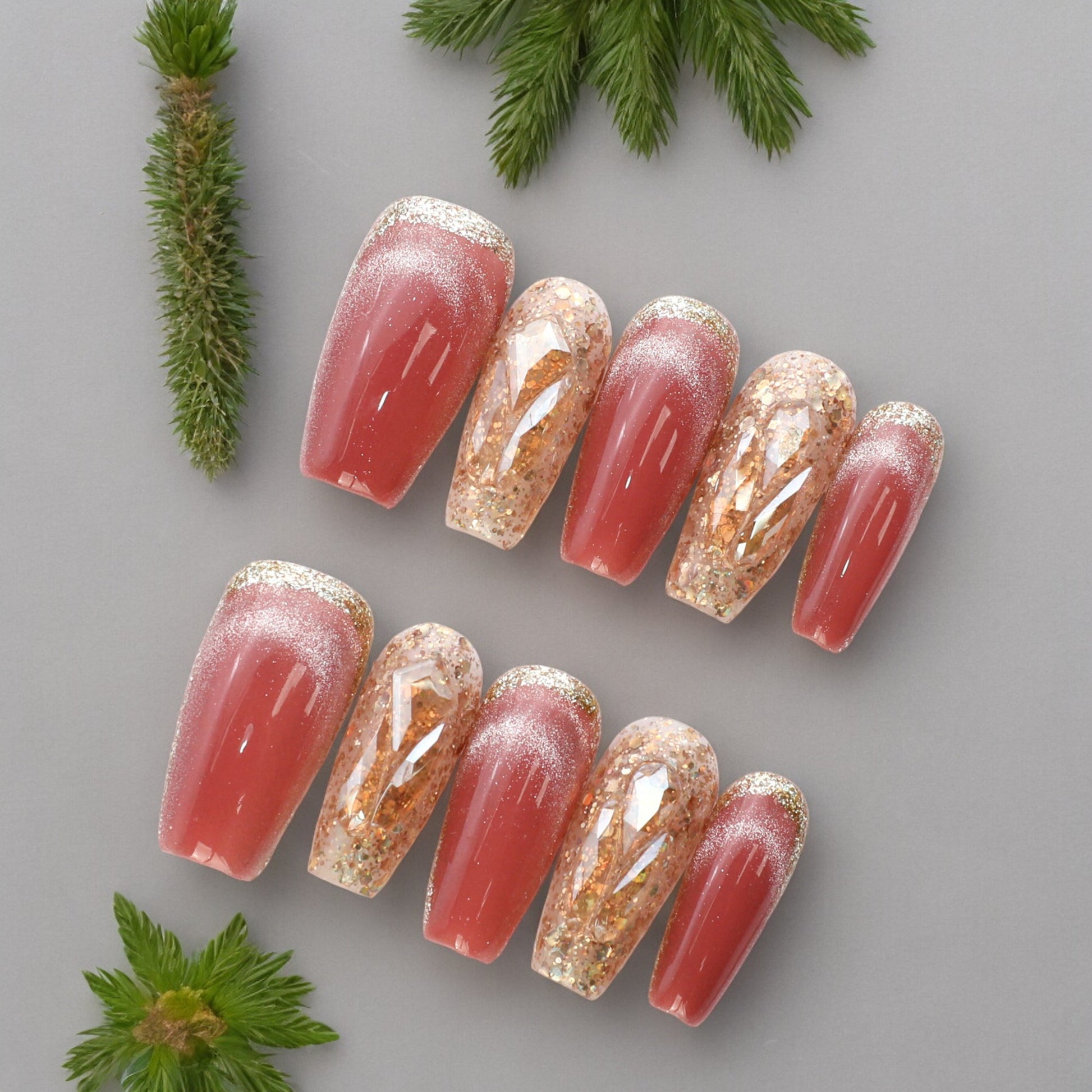 Medium coffin nail shape, painted in this stunning gold and watermelon red. Beautiful glitter decoration. Simply stunning.