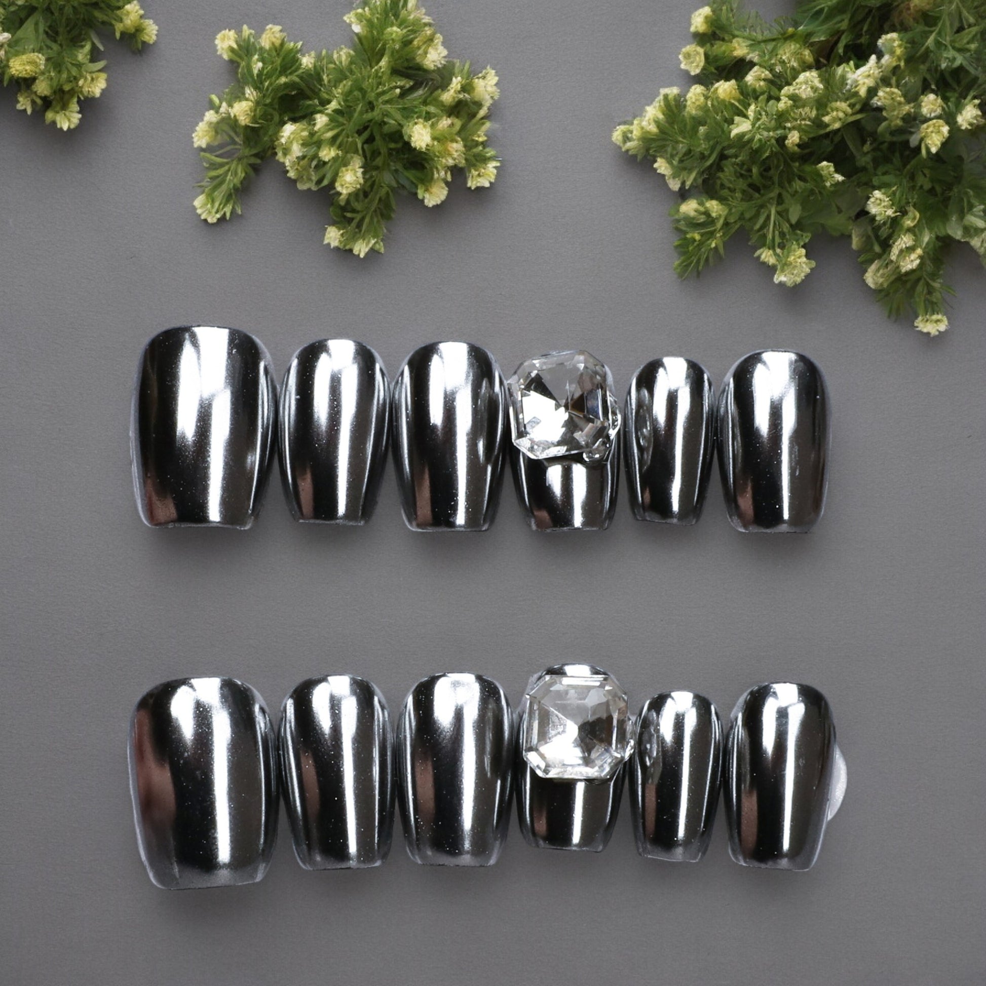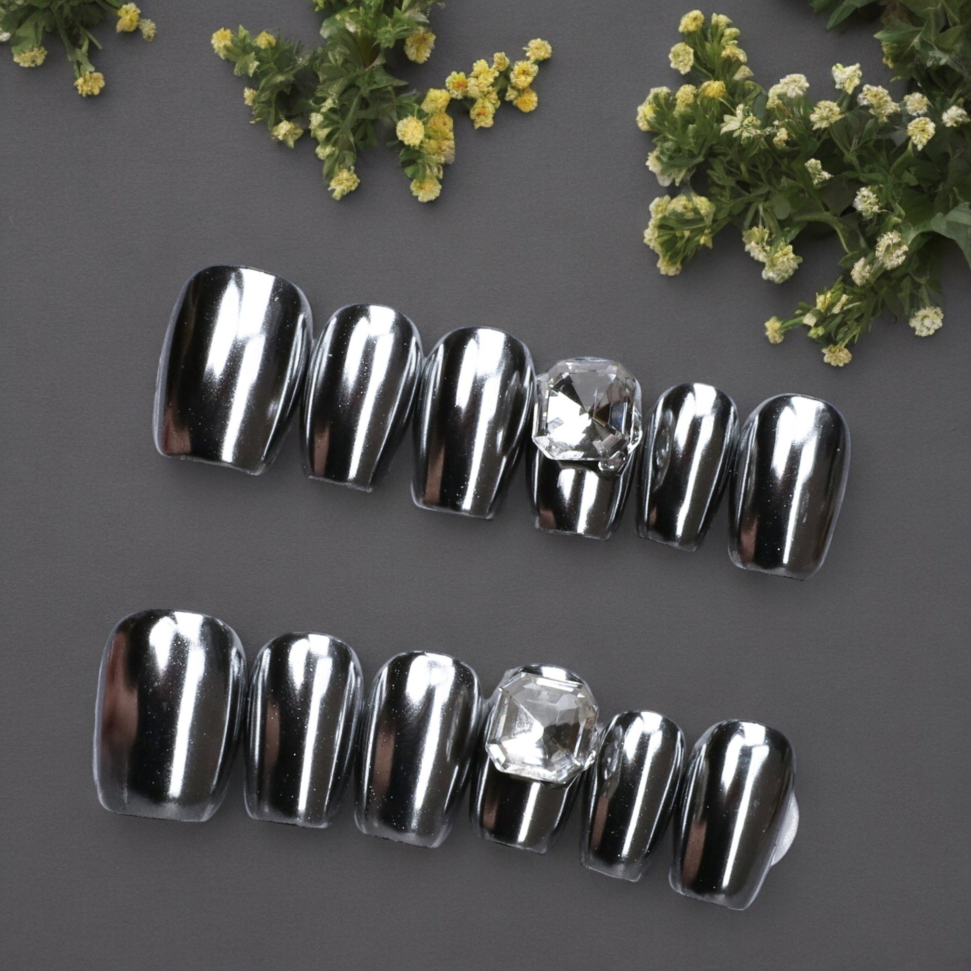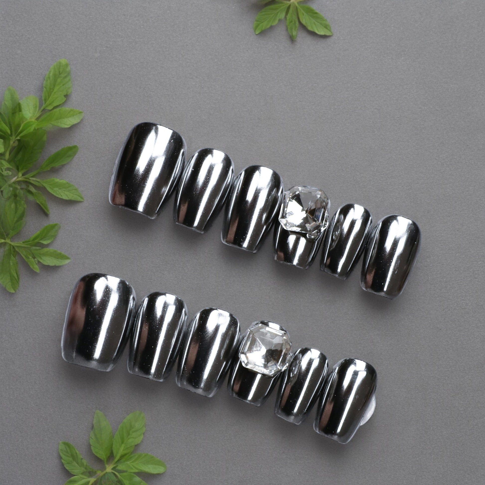Medium coffin nail shape, hand painted in this lovely metallic shade. Complete with nail gems. These are a striking set.