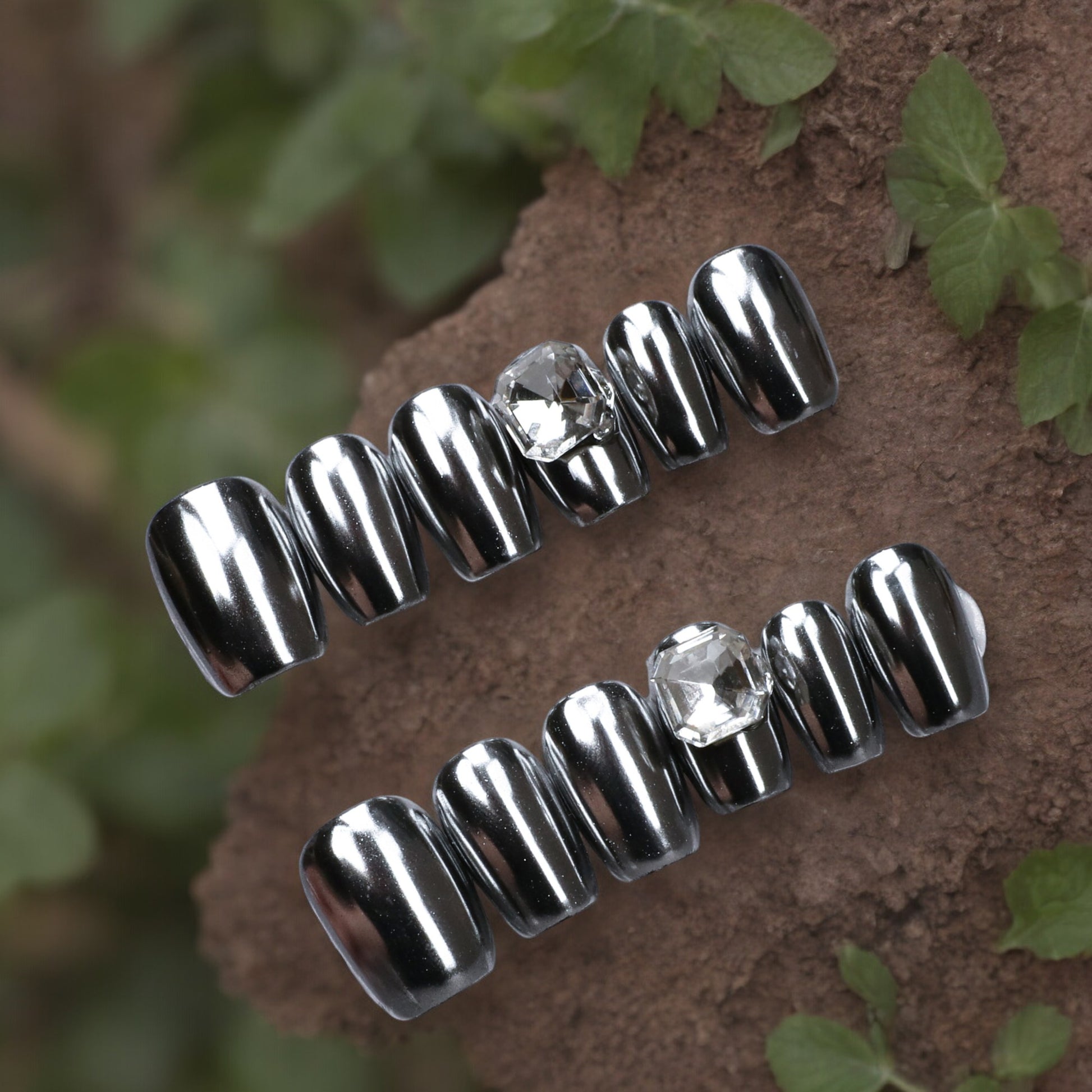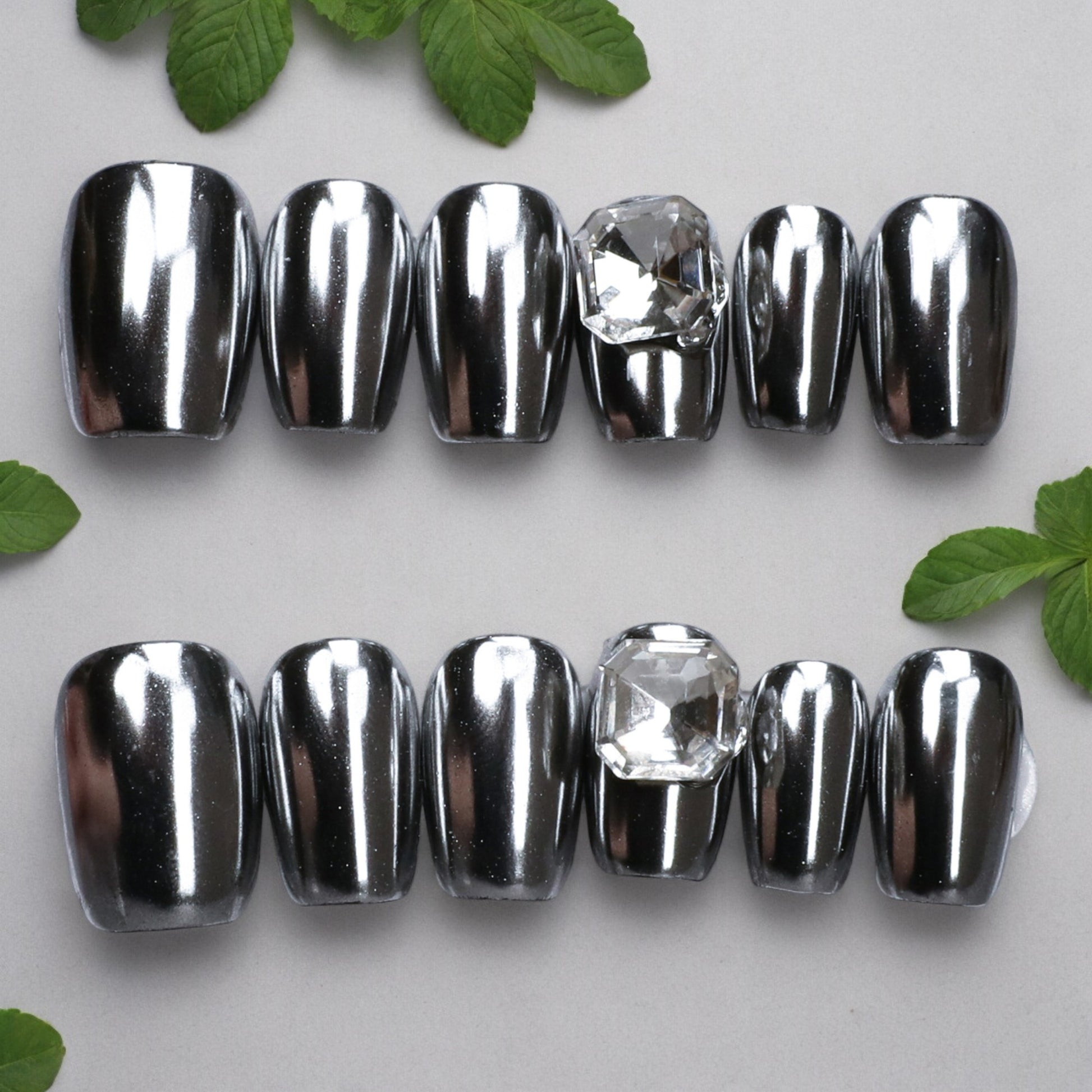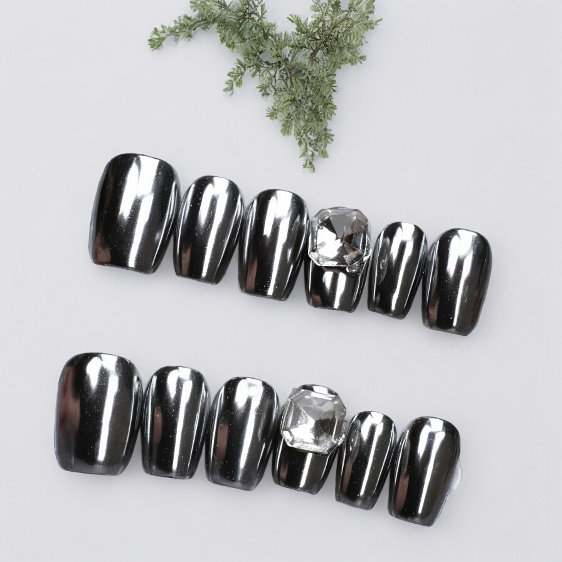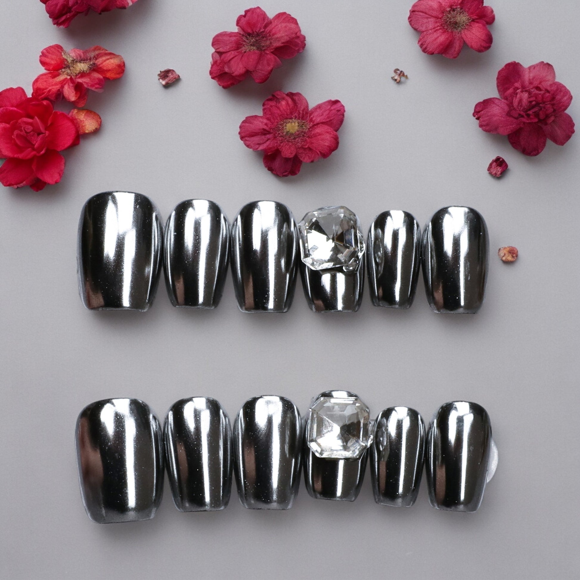 Medium coffin nail shape, hand painted in this lovely metallic shade. Complete with nail gems. These are a striking set.