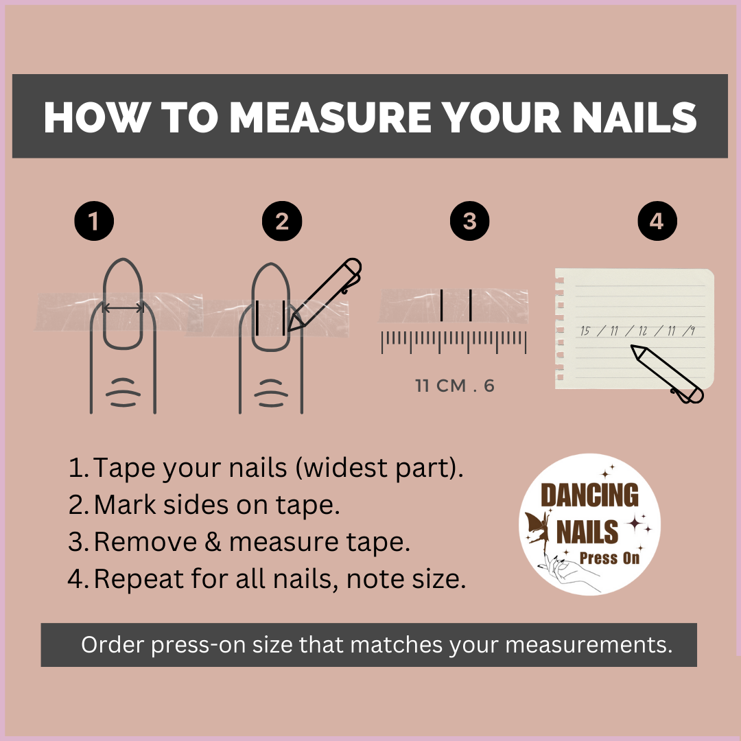 Since all our products are handcrafted, ensuring a perfect fit is essential. To help you out, we recommend measuring your nails carefully before placing your order. We hold our products to the highest quality standards and inspect each item before it ships. While we don't accept returns or exchanges, please don't hesitate to contact us if you have any issues with your order. We're here to help!