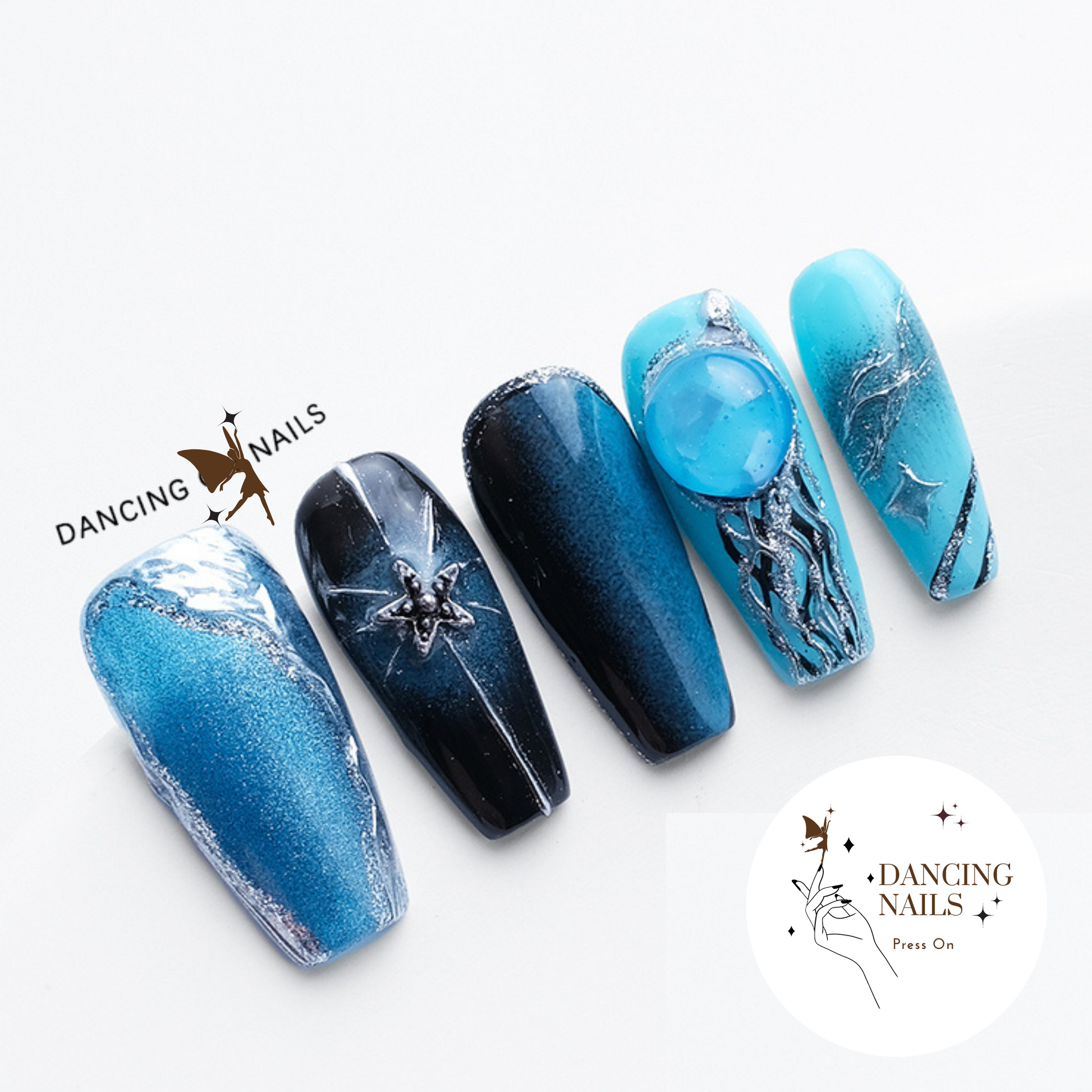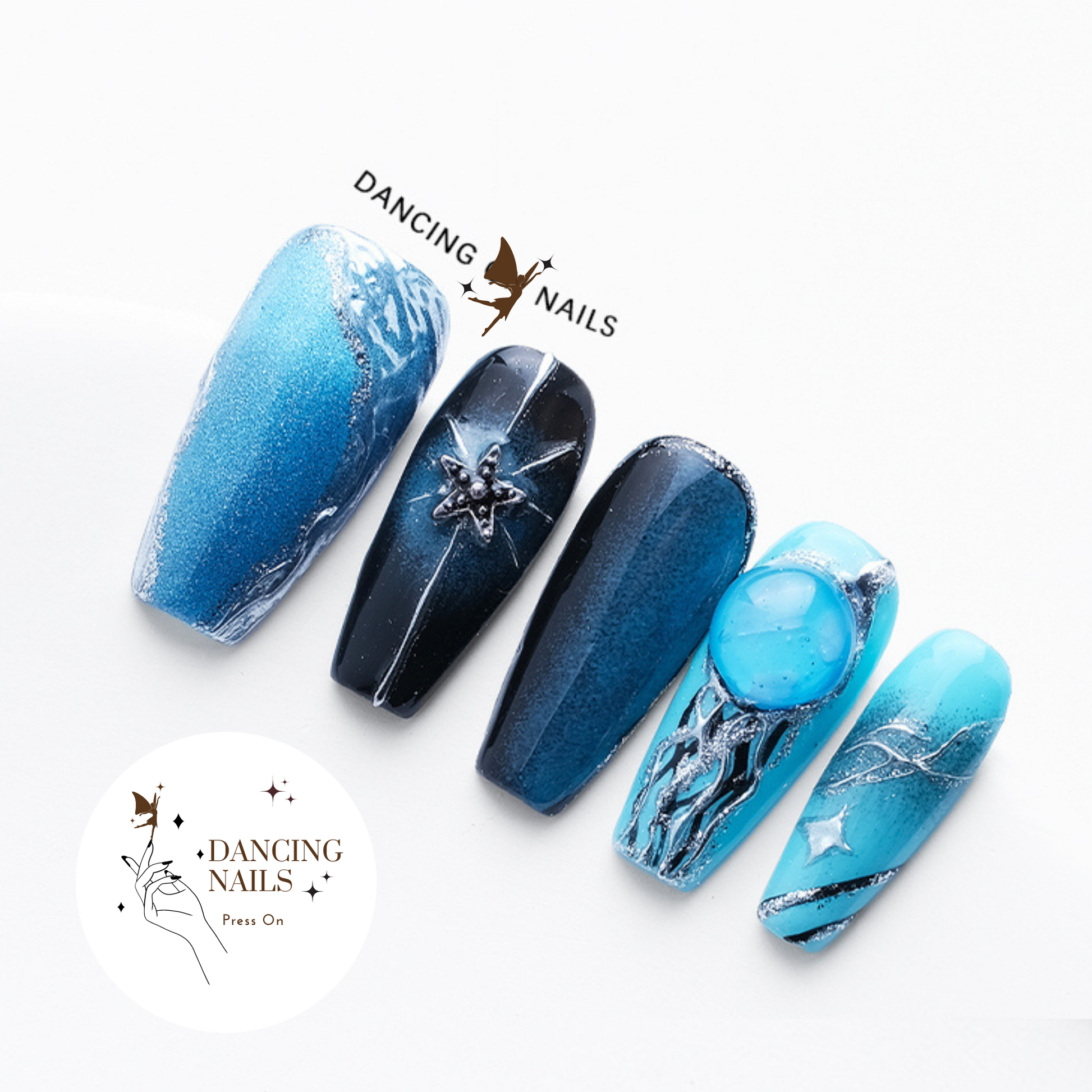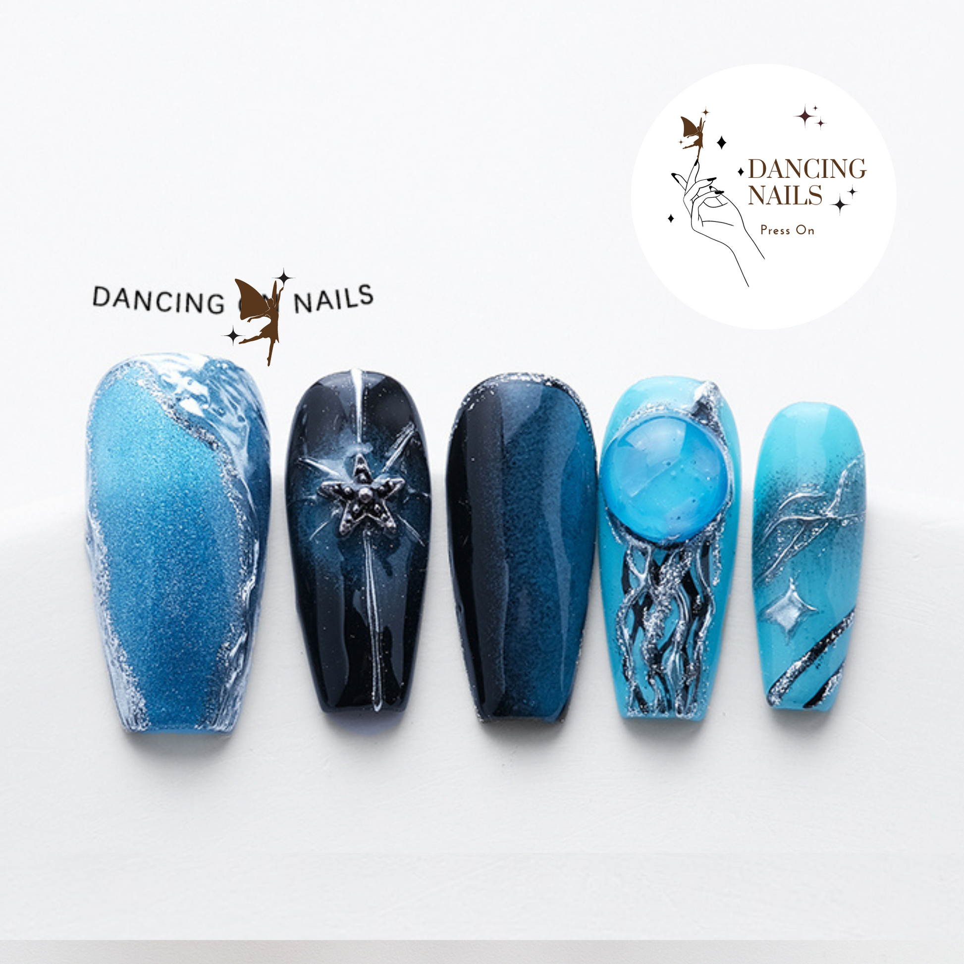 Get ready to make a splash with these Blue Ocean Pattern Midi Coffin Press on Acrylic Nails! The vibrant shades and star accent will add a fun and unique touch to your look. Plus, the midi coffin shape ensures a comfortable and trendy fit. Catch everyone's attention with these playful and stylish nails.