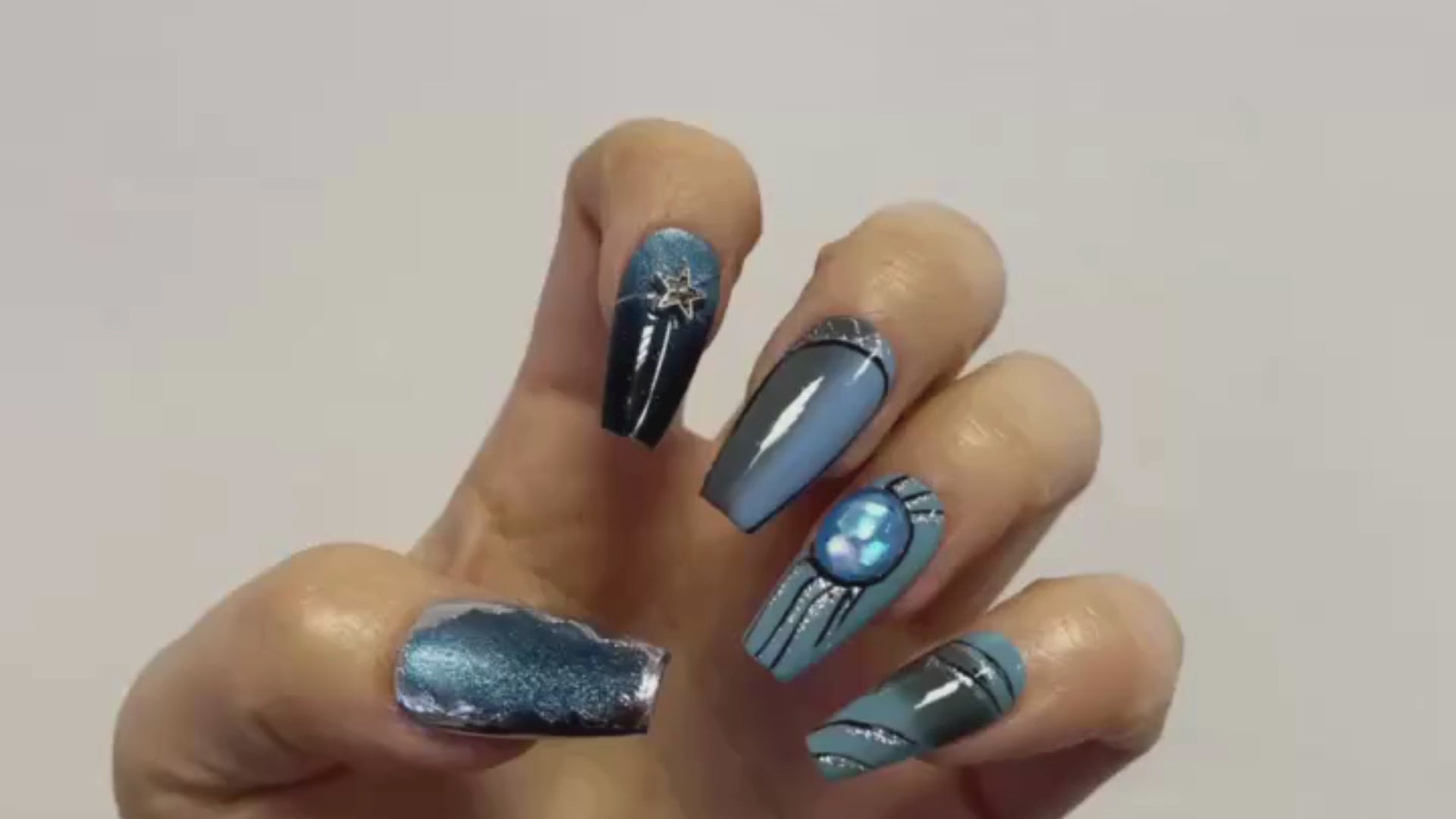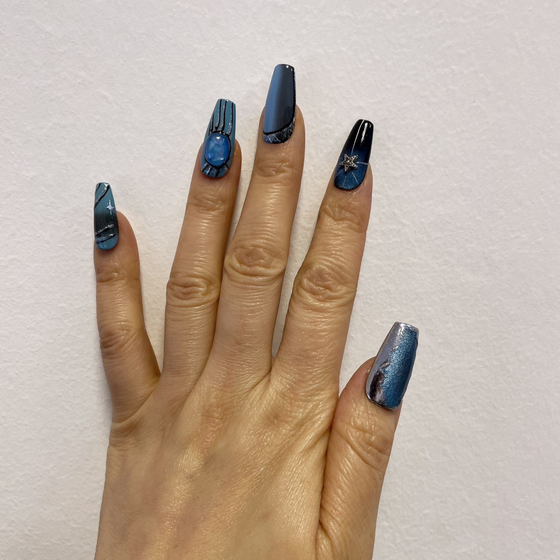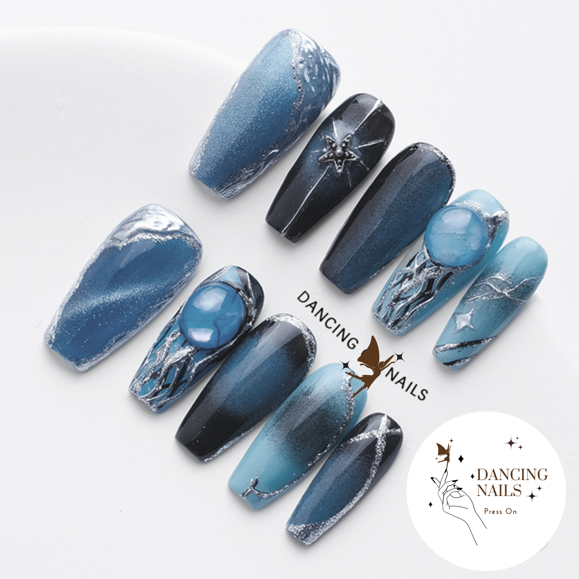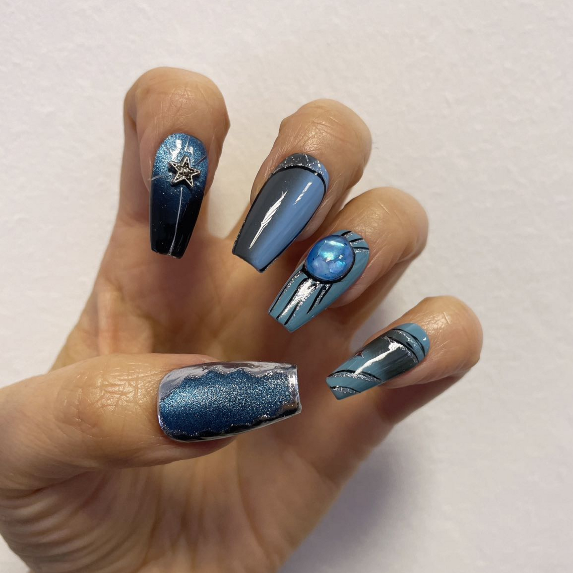 Get ready to make a splash with these Blue Ocean Pattern Midi Coffin Press on Acrylic Nails! The vibrant shades and star accent will add a fun and unique touch to your look. Plus, the midi coffin shape ensures a comfortable and trendy fit. Catch everyone's attention with these playful and stylish nails.